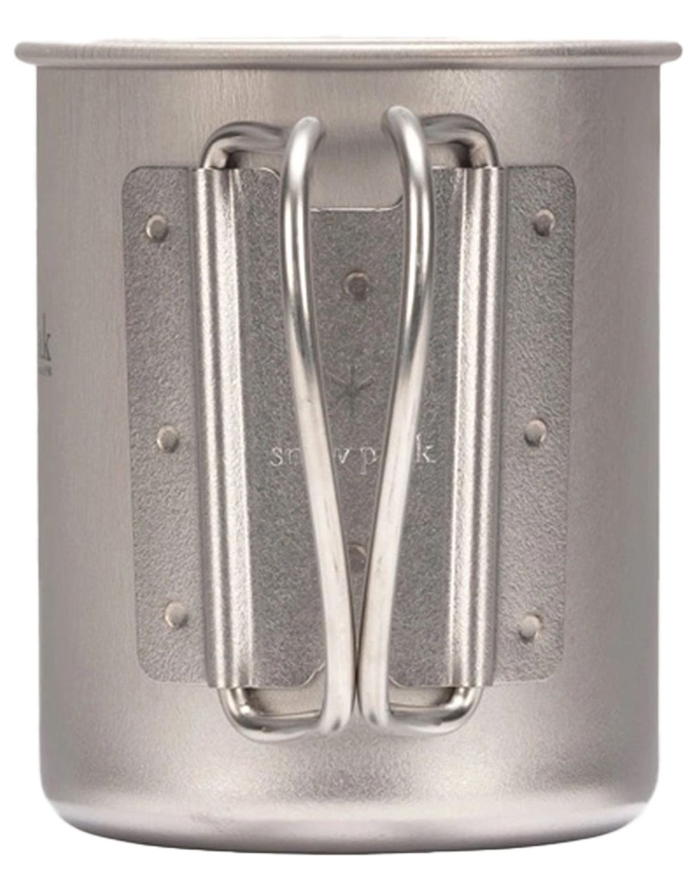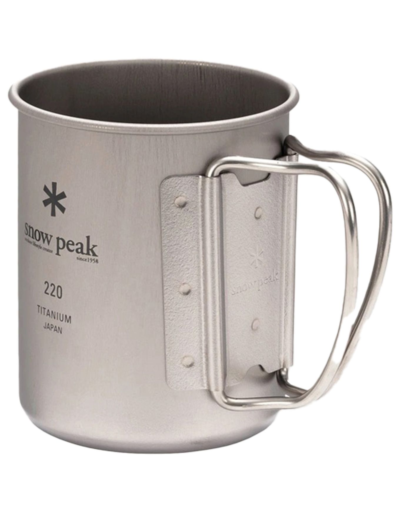Tasse Titanium Single Cup 220 ml Silver de Snow Peak en titane japonais ultraléger 45 g, compatible feu direct, poignées pliables, format compact pour camping et quotidien.