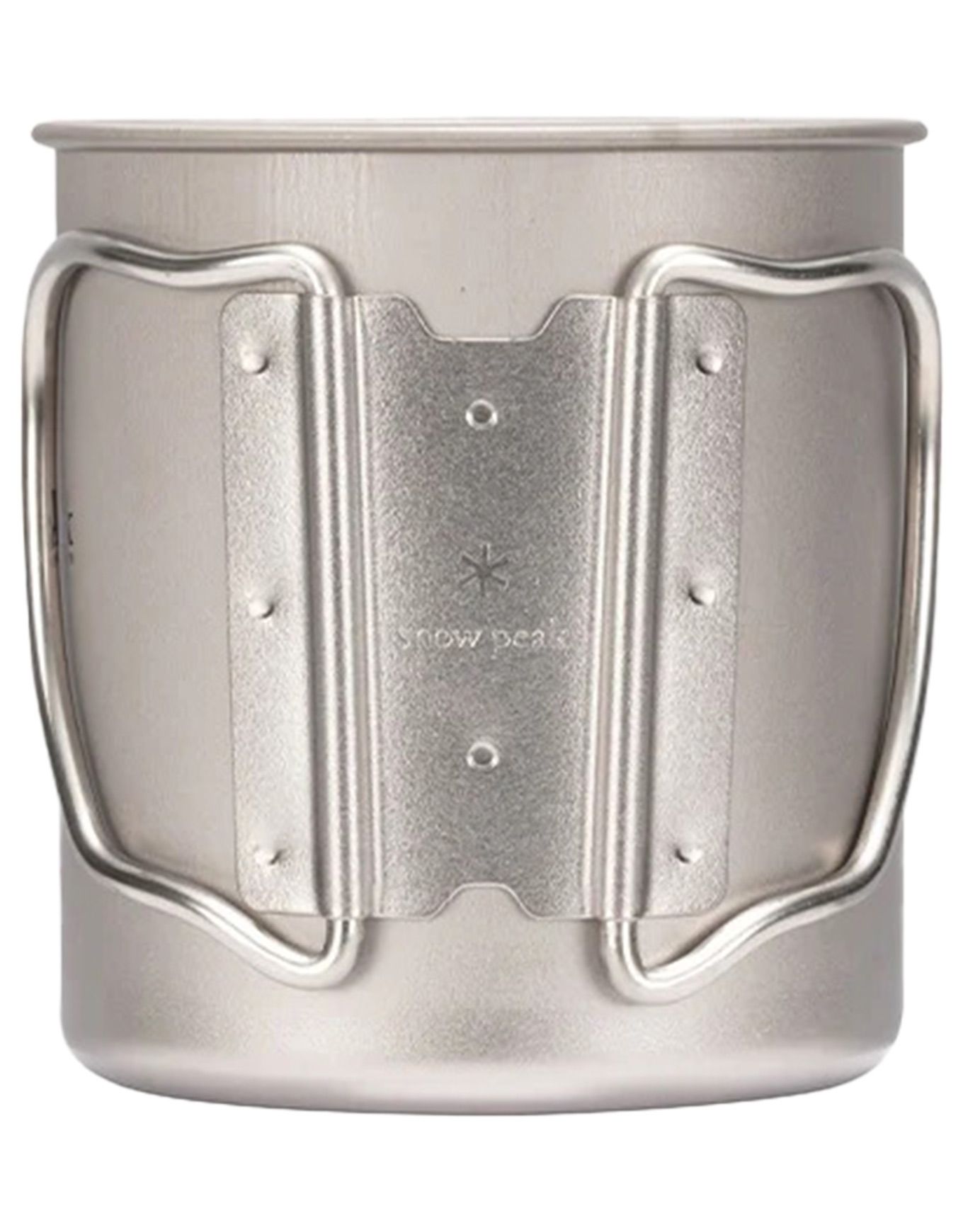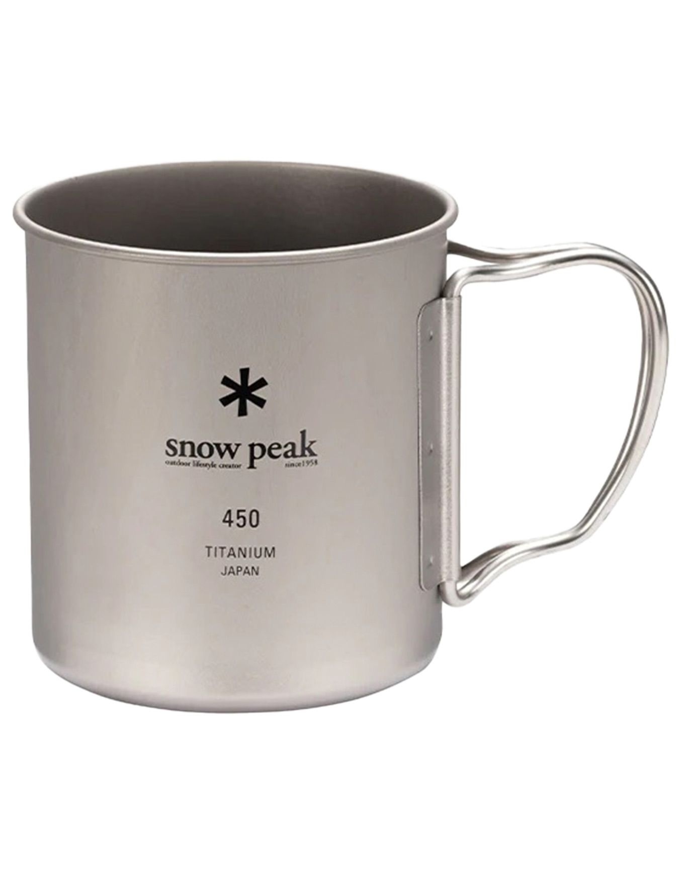 Tasse Titanium Single Wall 450 Mug Silver de Snow Peak en titane japonais ultraléger de 70 g, 450 ml, poignées pliables, compatible feu.