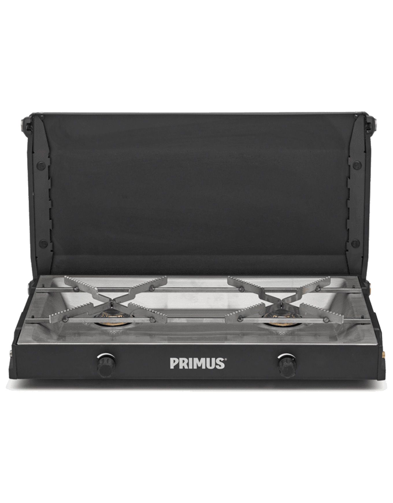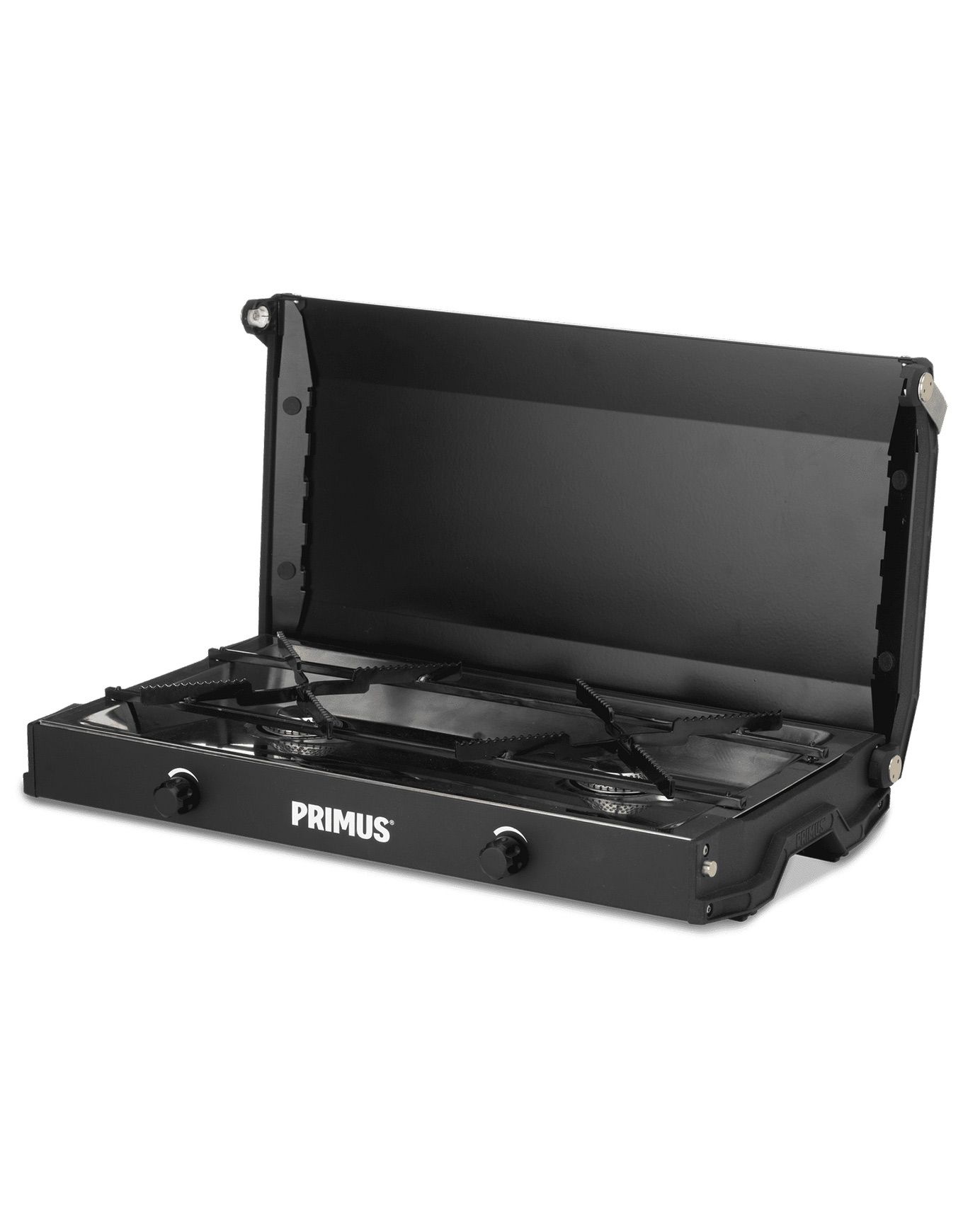 Réchaud Primus Kinjia 3000 W pour 2-5 personnes, compact et pliable, avec rabats anti-vent, double brûleur à flammes réglables, compatible cartouches valve filetée.