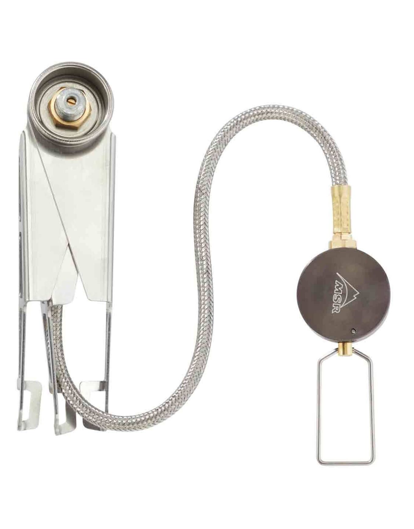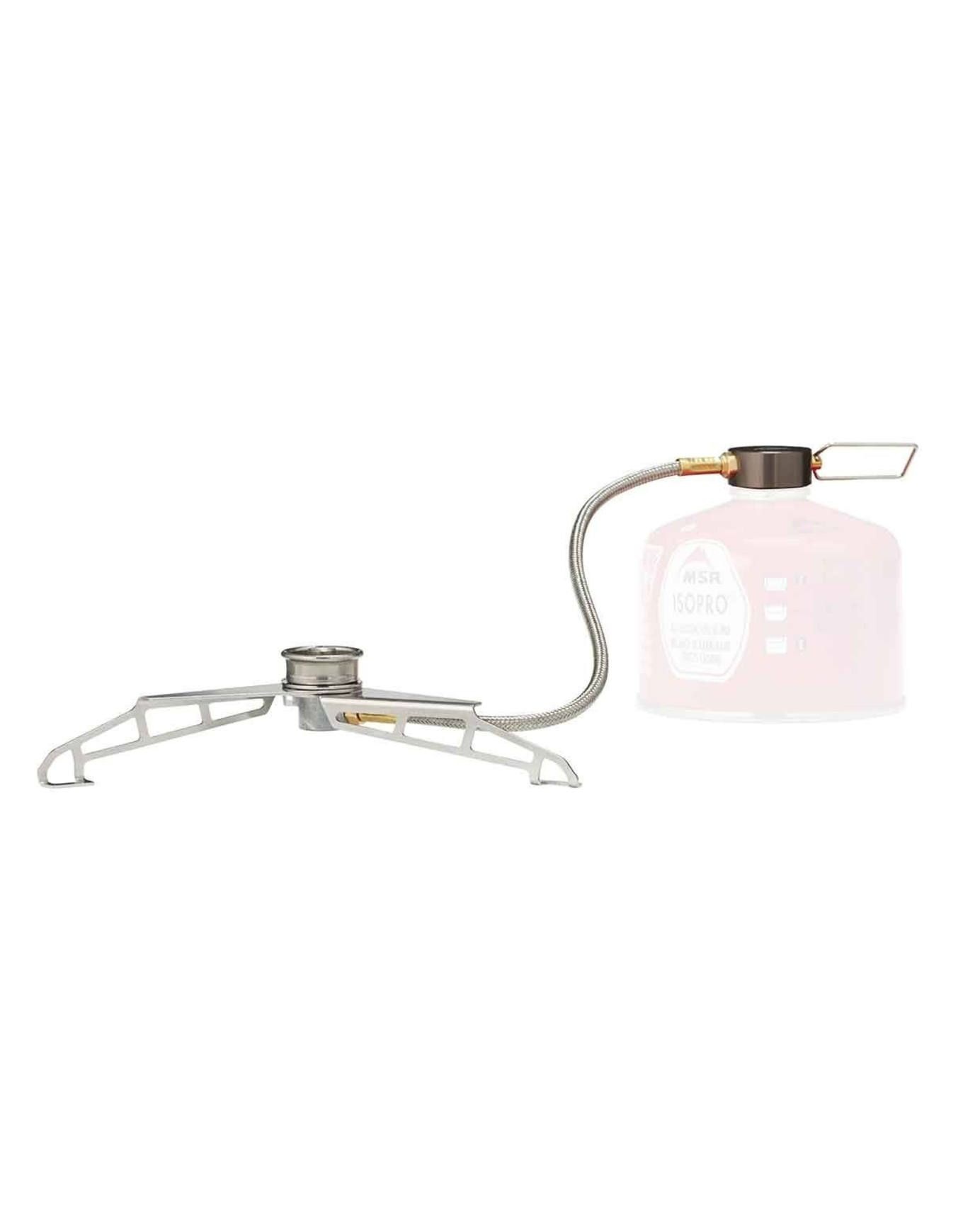 Adaptateur déporté MSR Lowdown Remote Stove Adapter pour réchaud, assurant stabilité au sol et sécurité en éloignant le brûleur des manipulations.