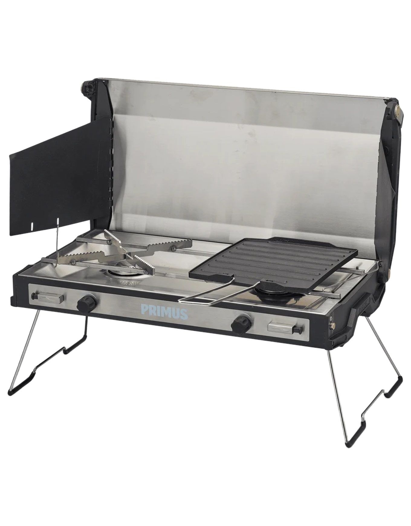 Primus Tupike Stove, réchaud double brûleur 3000 W pour 2-5 personnes, bouillon 1 L en 4 min, compact en aluminium et inox avec plancha intégrée et pare-flammes réglables.