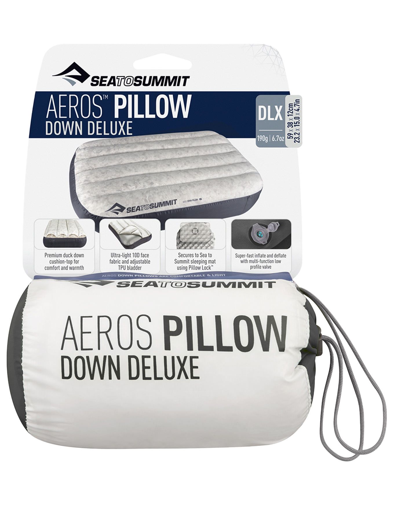 Coussin Sea To Summit Aeros Down Regular en duvet pour un confort moelleux et une isolation thermique. Gonflage rapide via vanne multifonctions, tissu ultra-léger et système Pillow Lock contre le glissement.