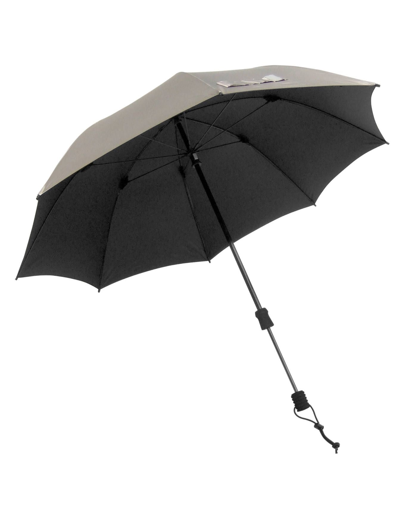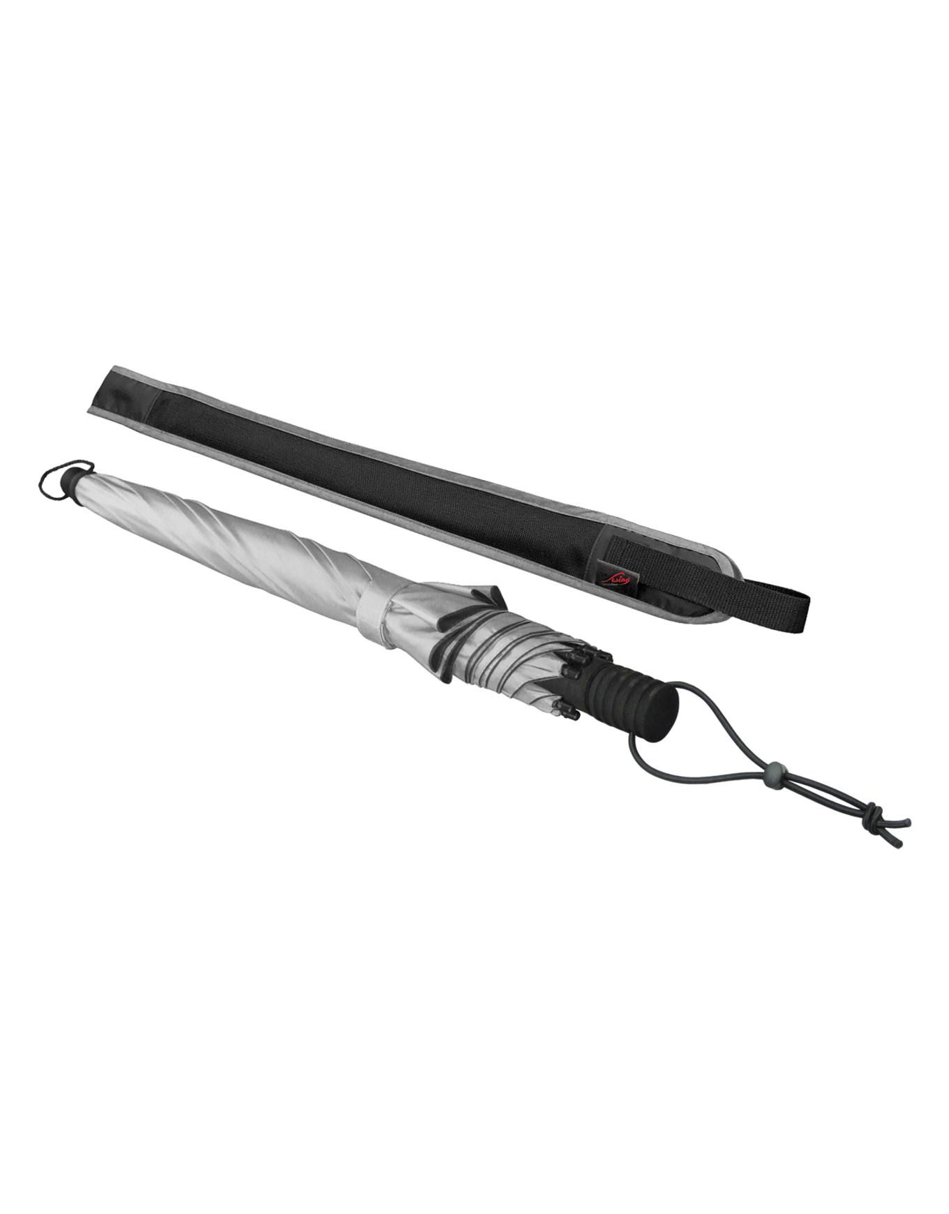 La toile en polyester haute résistance reçoit un traitement Teflon® contre les déchirures. La finition argentée intègre un revêtement métallique procurant une protection UV 50+ certifiée pour la tête, le cou et les épaules. L’utilisation classique reste possible grâce à la poignée en mousse dure haute densité, qui assure un confort optimal.