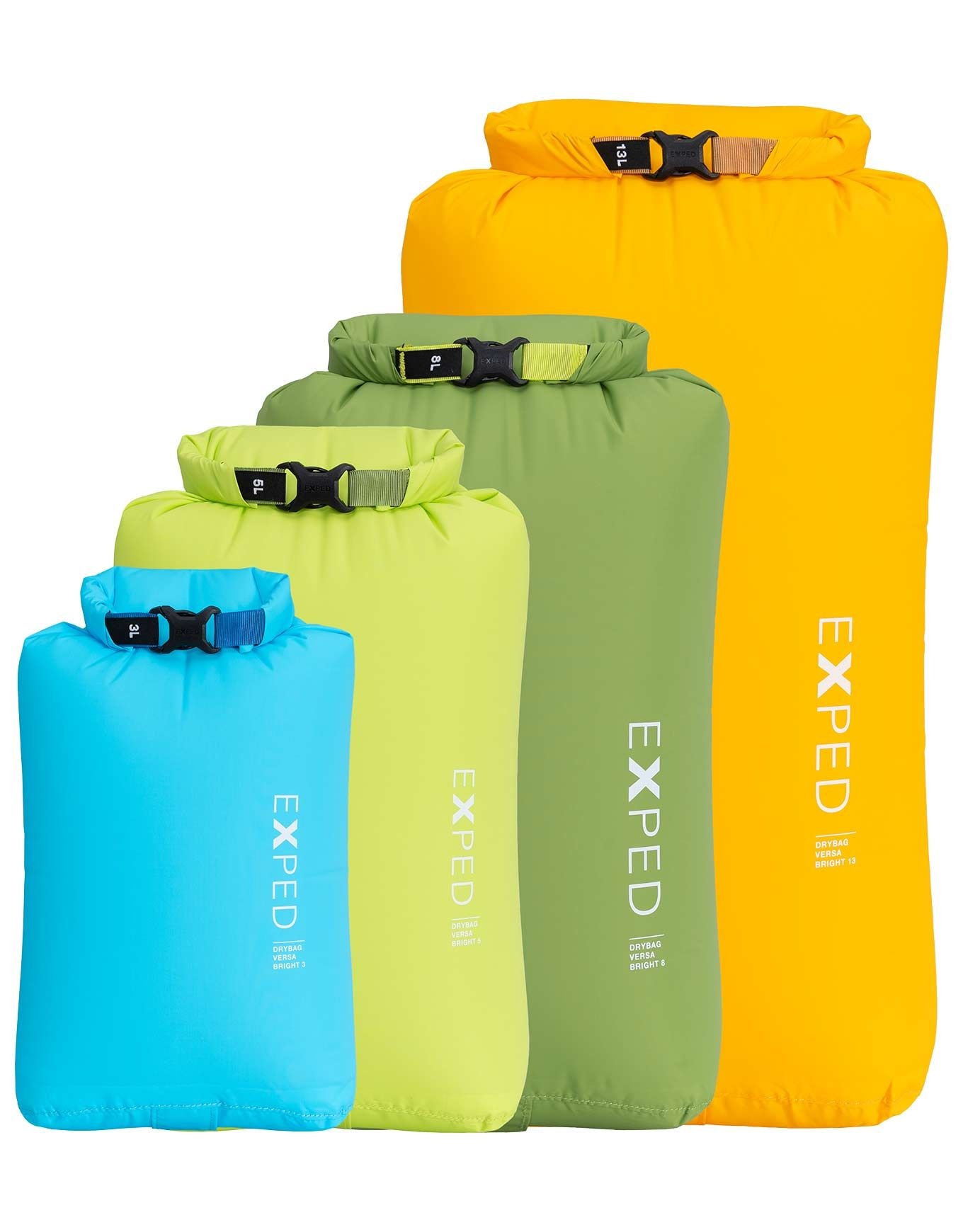 Sac de rangement étanche Exped Drybag Versa Bright, lot de 4 en nylon recyclé 70D, fermeture roll-top, coutures collées, fond optimisé et revêtement intérieur blanc pour une organisation en couleur et un contenu visible.