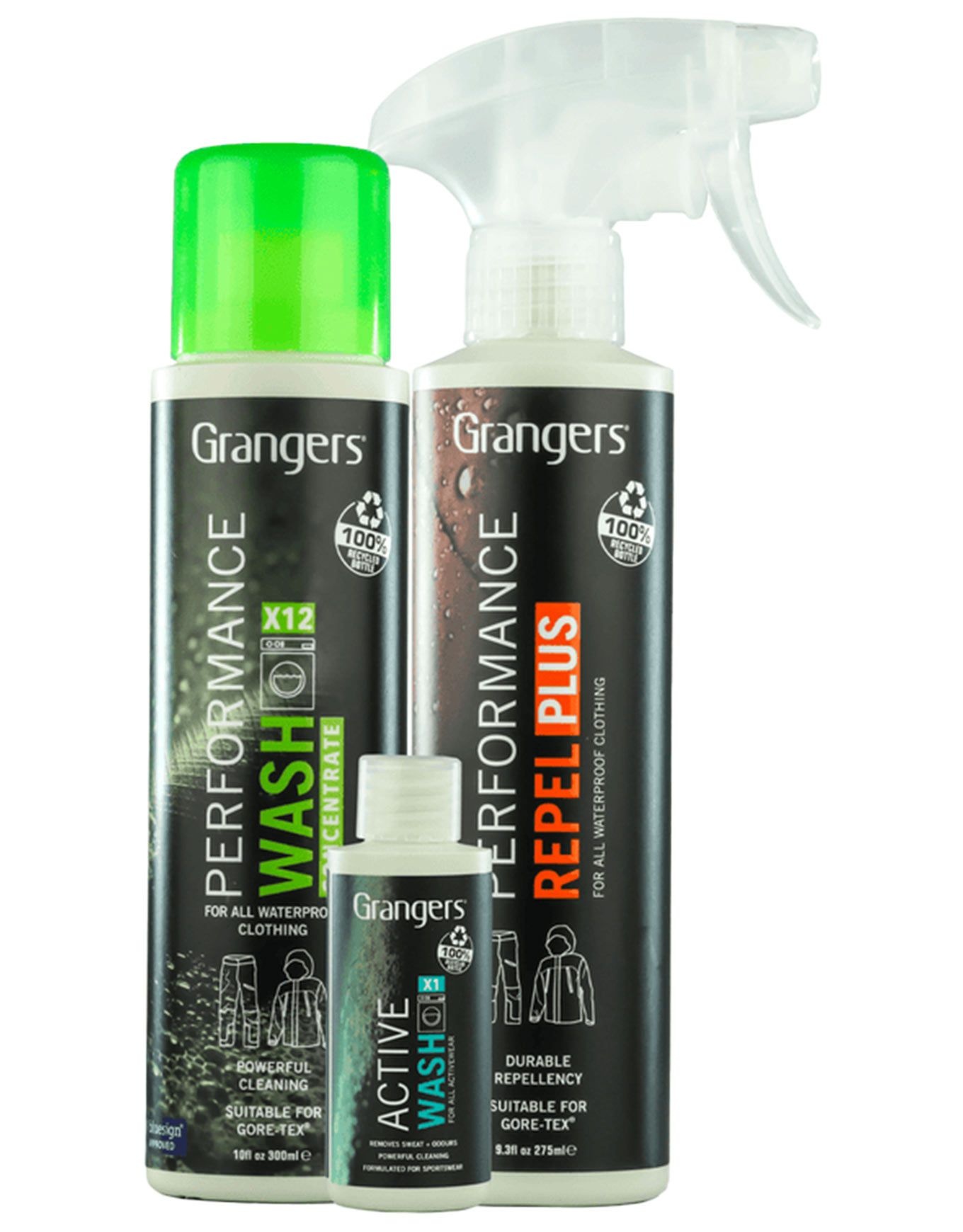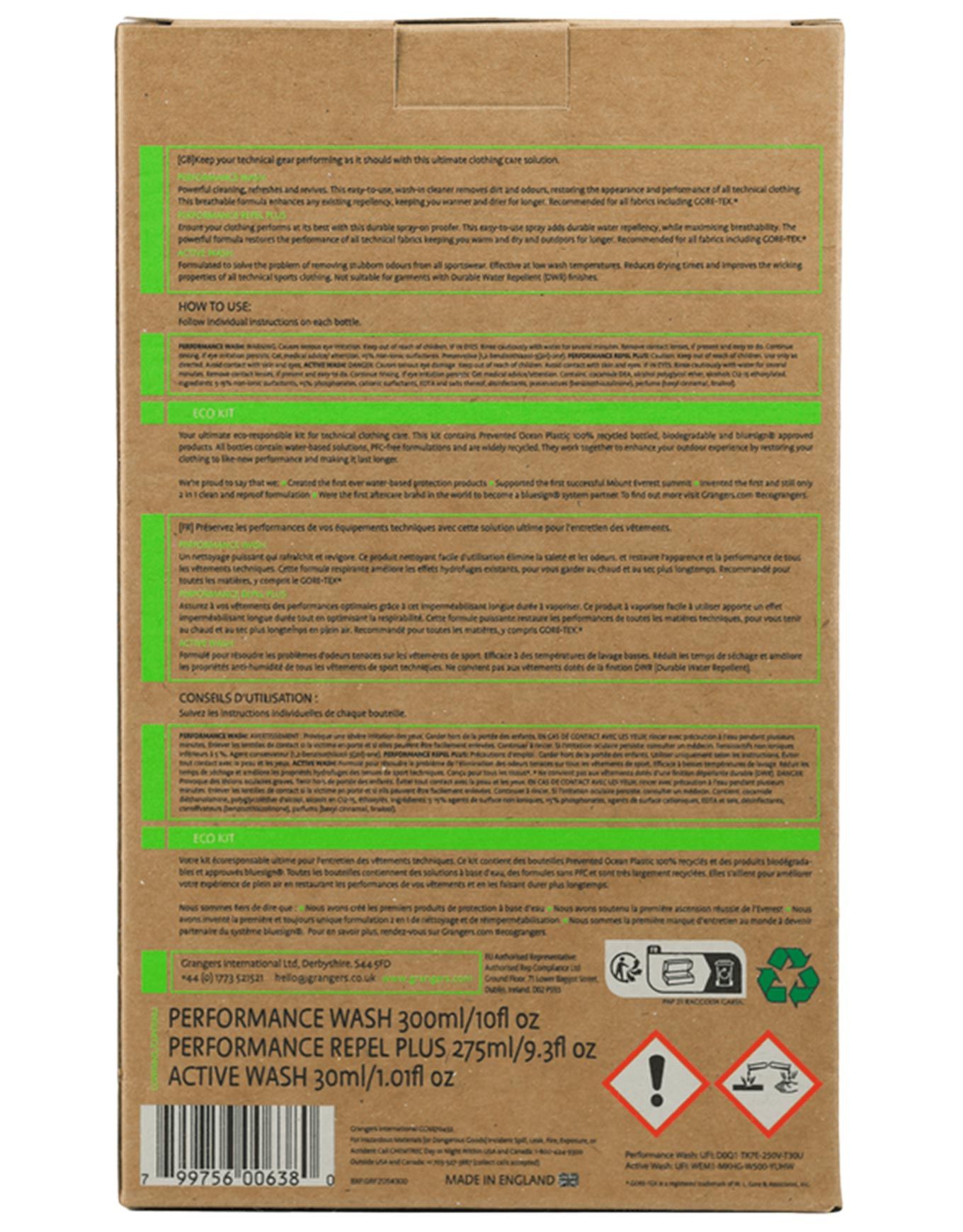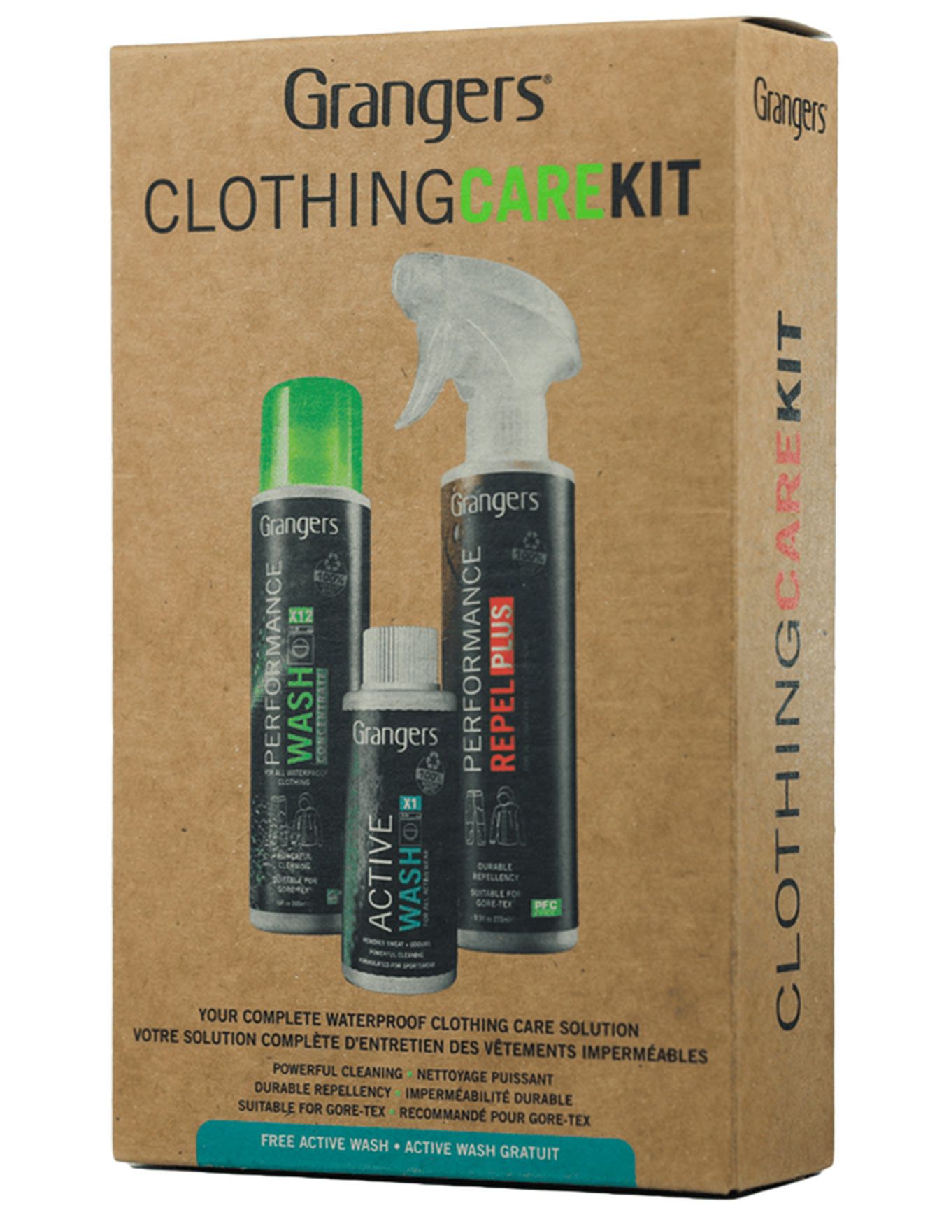 Le Clothing Care Kit Grangers est un kit d’entretien complet pour textiles techniques, comprenant Performance Wash pour éliminer saleté et odeurs, Performance Repel Plus pour restaurer l’imperméabilité, et Active Wash pour un lavage efficace à basse température.