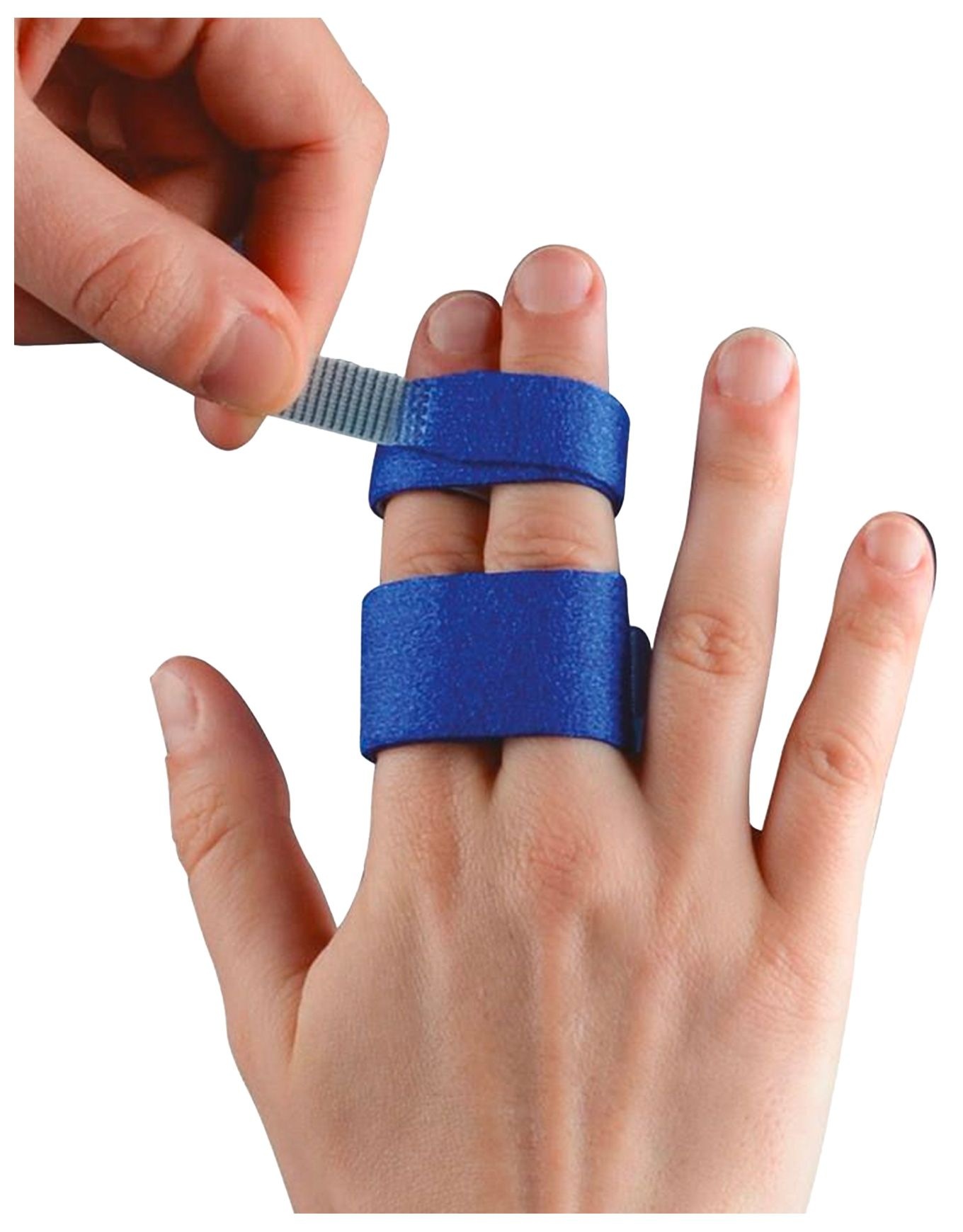 Le kit comprend deux paires de bandes de maintien conçues pour assurer l’immobilisation fonctionnelle des doigts par syndactylie dynamique. Le serrage peut être ajusté en fonction du niveau d’immobilisation requis par le patient. Le dispositif permet également une séparation interdigitale adaptée.