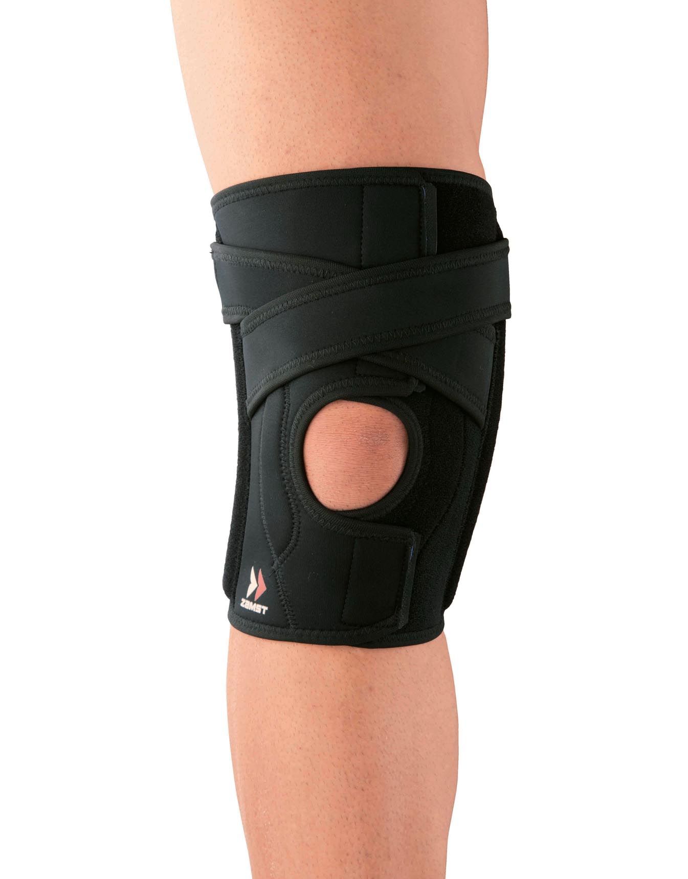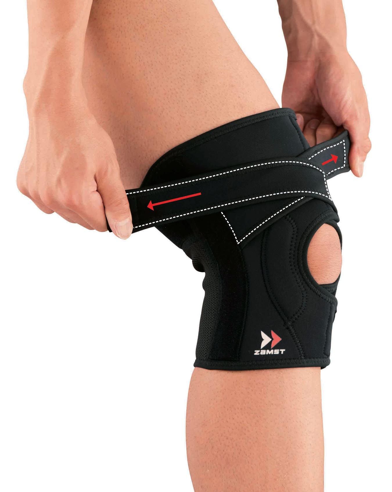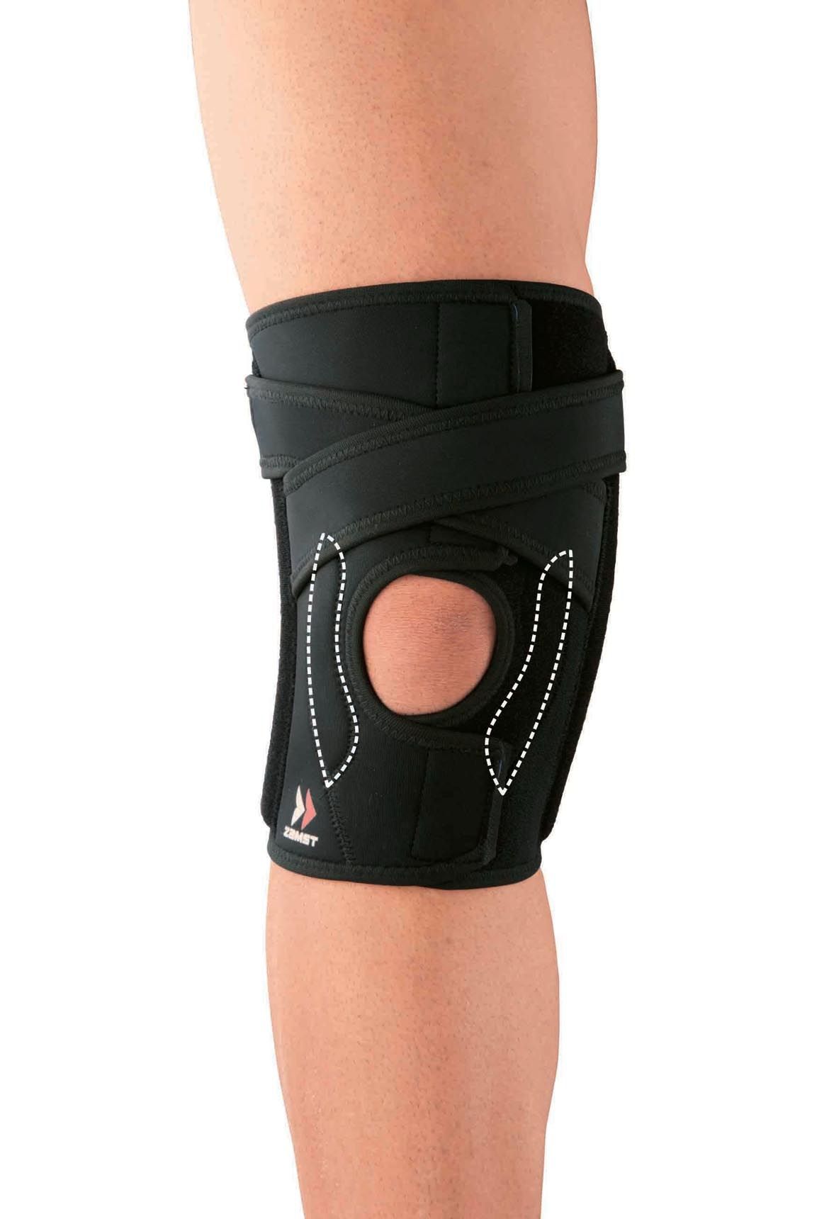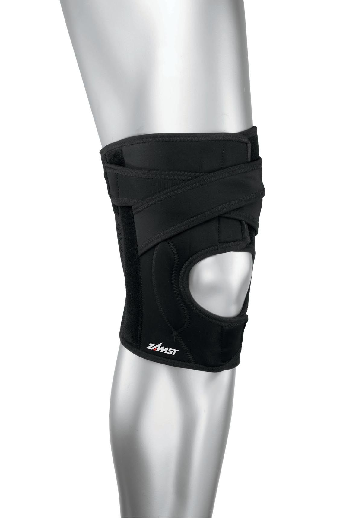 Genouillère Zamst EK-5 stabilisant latéralement la rotule grâce à ses straps compressifs, ses renforts latéraux en résine souple et son mesh 3D respirant pour un maintien proprioceptif ajustable.