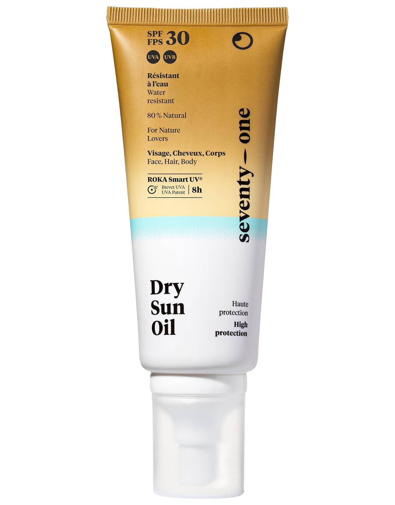 L’huile sèche solaire SPF30+ SeventyOne Percent protège visage et corps des UVA/UVB tout en sublimant le bronzage grâce à sa texture dorée non grasse qui pénètre instantanément et laisse la peau satinée.