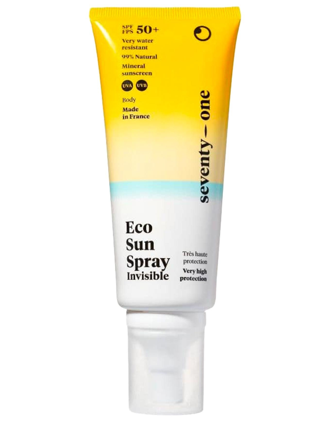 SeventyOne Percent Eco Sun Spray Invisible SPF50+ est une crème solaire en spray minérale qui protège efficacement toute la famille des UVA/UVB, résiste à l’eau et s’applique sur peau mouillée sans couler ni piquer les yeux.