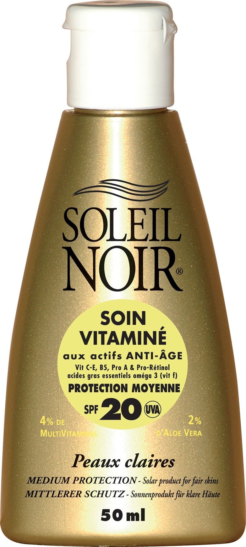 Signé Soleil Noir, le Soin Vitaminé 20 constitue une protection solaire SPF20 assurant une défense modérée tout en favorisant un hâle uniforme. Cette formule hydratante et nourrissante protège l’épiderme tout en l’enveloppant d’actifs anti-âge d’exception. La texture est délicatement parfumée par la senteur emblématique de Soleil Noir. Contenance : 50ml Indice de protection : SPF20 Recommandé pour : Peaux claires ou déjà halées Atouts : – Protection solaire : 4 filtres UVA/UVB + écran minéral – Renouvellement cellulaire : Vit. C-E, Pro A & Pro-Rétinol, Oméga 3 (Vit. F) – Apaisement : Aloe Vera + Provitamine B5 + Huiles précieuses Formule : 4% Multivitamines 2% Aloe vera INCI : aqua (water), ethylhexyl methoxycinnamate, methylene bis-benzotriazolyl tetramethylbutylphenol [nano], propylene glycol, glyceryl stearate, ceteareth-20, cetearyl alcohol, aloe barbadensis leaf juice, octocrylene, butyl methoxydibenzoylmethane, paraffinum liquidum (mineral oil), ceteareth-12, titanium dioxide [nano], cocoglycerides, dimethicone, olea europaea (olive) fruit oil, tocopheryl linoleate, panthenol, tocopherol, retinyl palmitate, sodium ascorbyl phosphate, tocopheryl acetate, beta-carotene, zea mays (corn) oil, borago officinalis (borage) seed oil, helianthus annuus (sunflower) seed oil, rosmarinus officinalis (rosemary) leaf extract , zea mays (corn) germ oil, decyl glucoside, parfum (fragrance), cyclomethicone, C12-15 alkyl benzoate, acrylates/C10-30 alkyl acrylate crosspolymer, potassium cetyl phosphate, polyhydroxystearic acid, alumina, aluminum stearate, chlorphenesin, BHT, disodium EDTA, xanthan gum, sodium benzoate , potassium sorbate, citric acid Explorer les univers liés Crèmes solaires Protections/soins Protections solaires