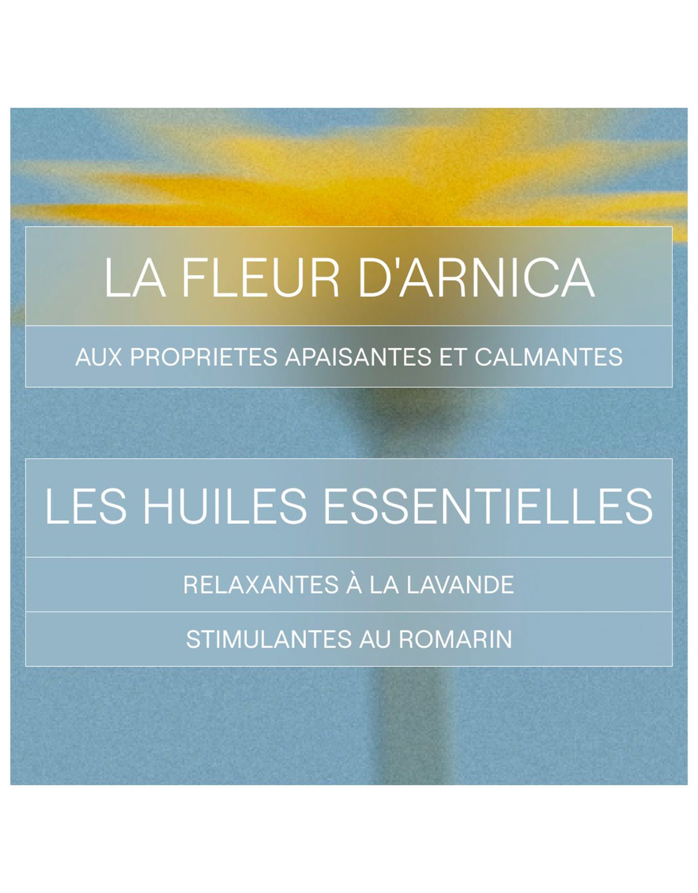 Eau, huile de tournesol, huile d’olive, propanediol, ester d’acide gras, glycérine, parfum*, savon à base d’huile d’olive (Potassium Olivate), phénylpropanol, lécithine hydrolysée, gomme de sclérotium, pullulan, gomme xanthane, citrate de sodium, vitamine E, acide citrique, extrait de fleur d’arnica, extrait de feuille de bouleau, acide silicique, linalol*, limonène*