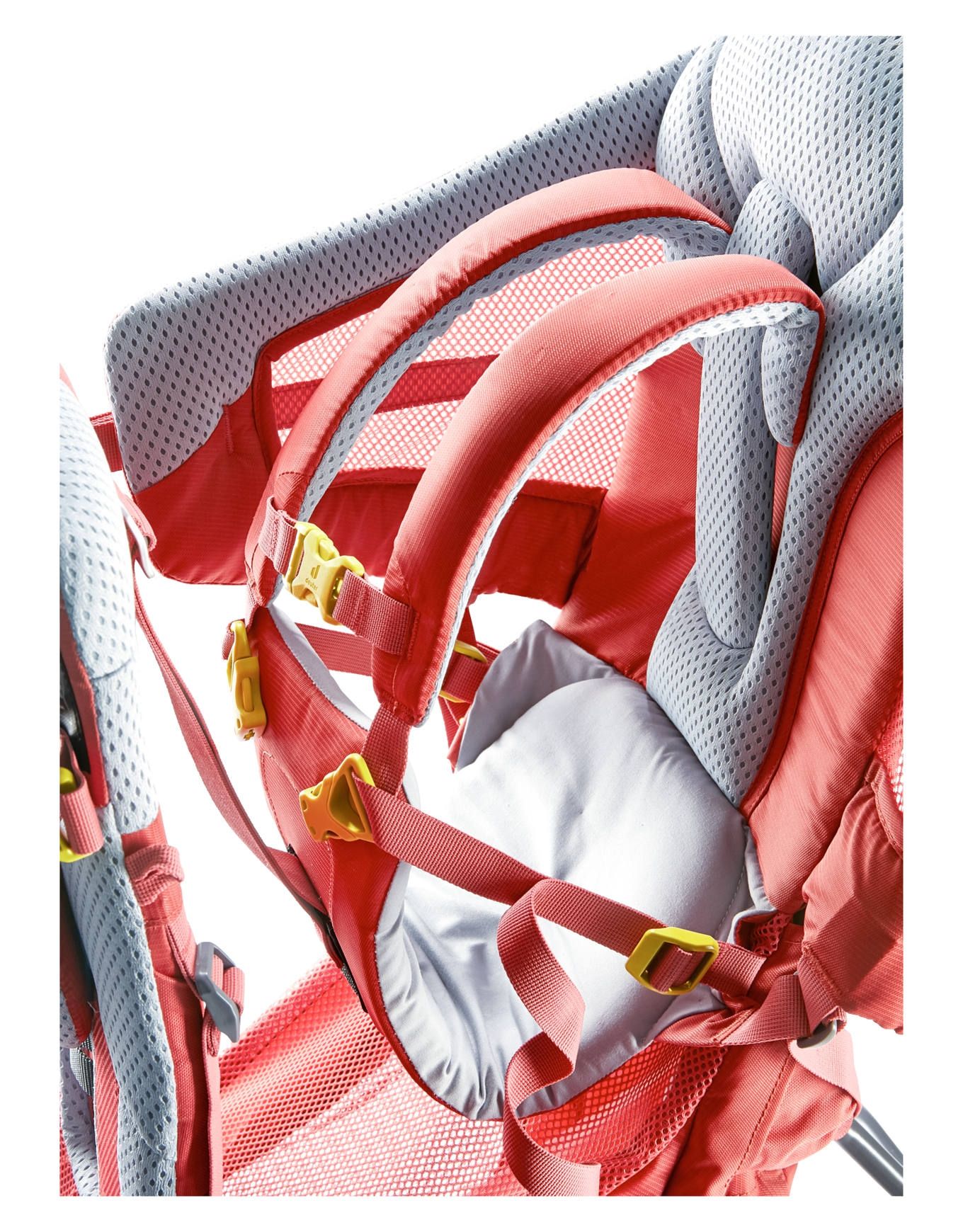 La respirabilité est assurée pour parent et enfant par la mousse perforée et les filets intégrés à l’assise. Le rangement se organise via deux grandes poches élastiques situées sous et devant le siège, auxquelles s’ajoute une poche ceinture. La compatibilité avec auvent et coussin de tête complète l’équipement.