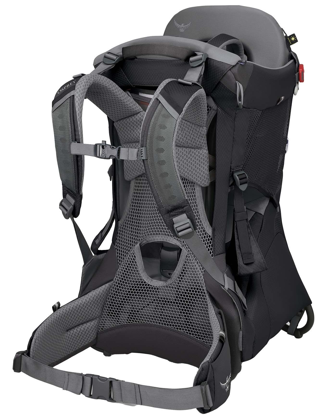 Le porte-bébé Osprey Poco Child Carrier Black allie sécurité normée TÜV et confort partagé grâce à son siège réglable, son dossier AirSpeed ventilé et sa capuche UPF50 intégrée pour la randonnée ensoleillée.