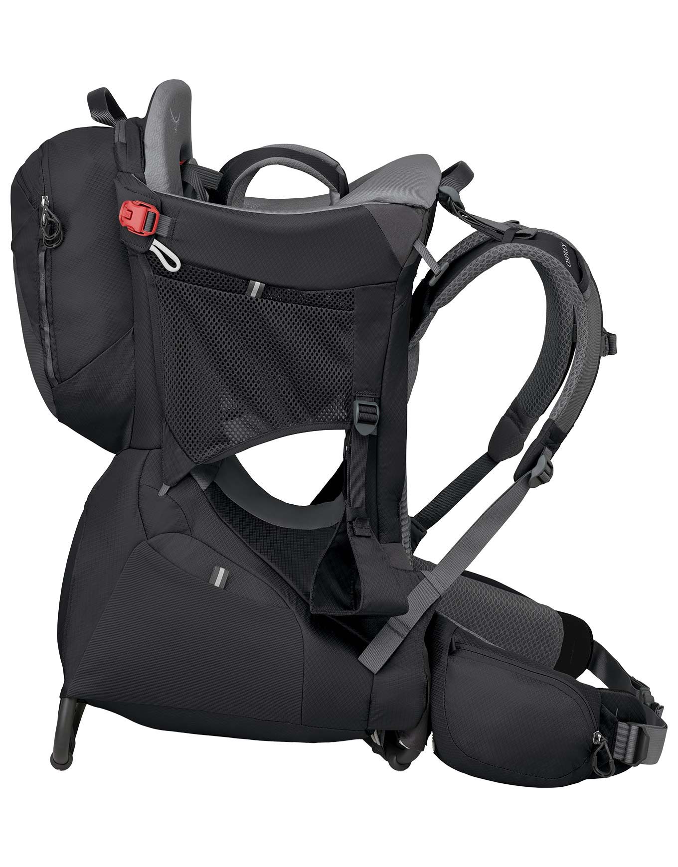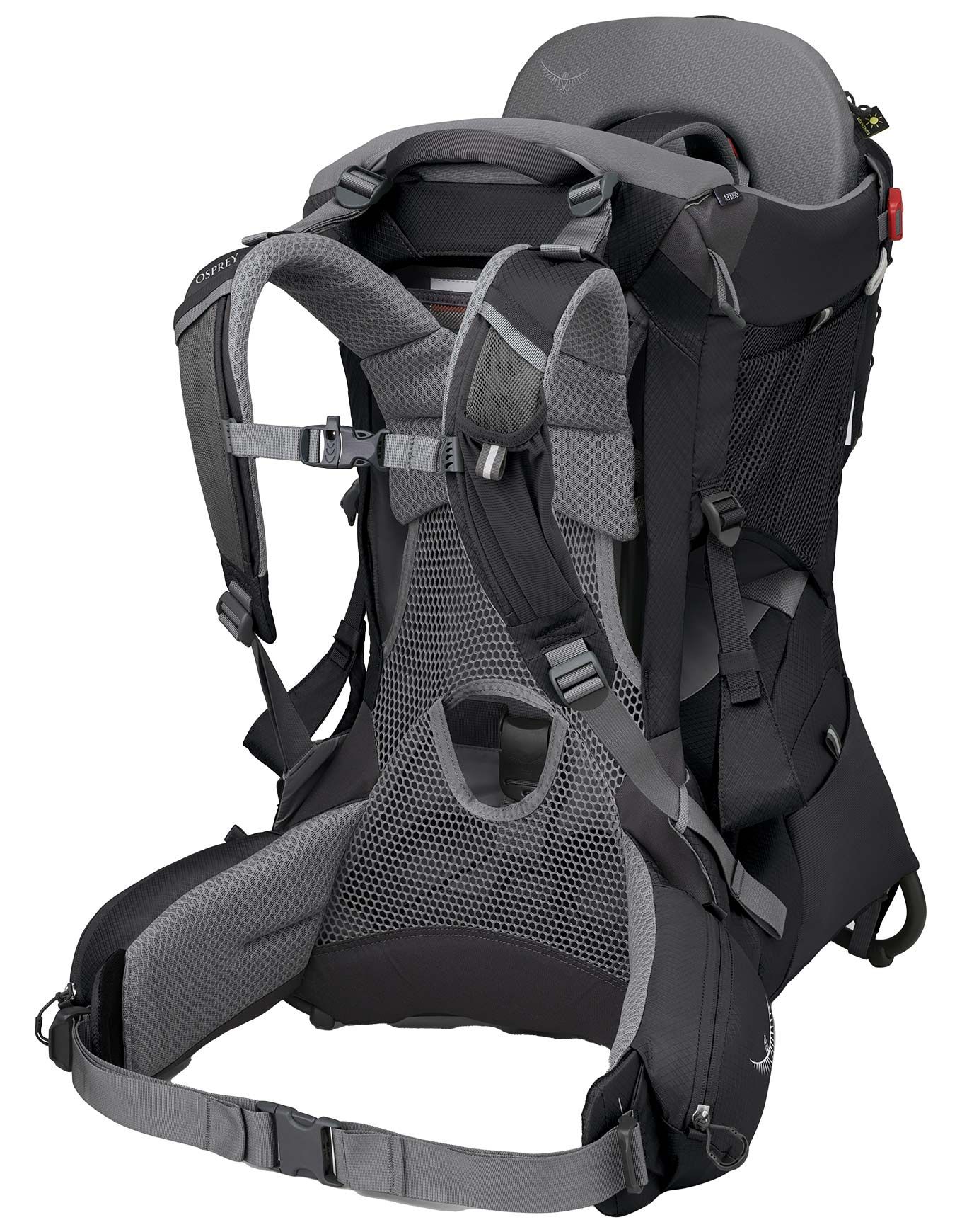 Porte-bébé de randonnée Osprey Poco Premium Black 36 L, siège et harnais réglables, pare-soleil UPF50, armature pliable, pochettes zippées, dorsal AirSpeed ventilé.