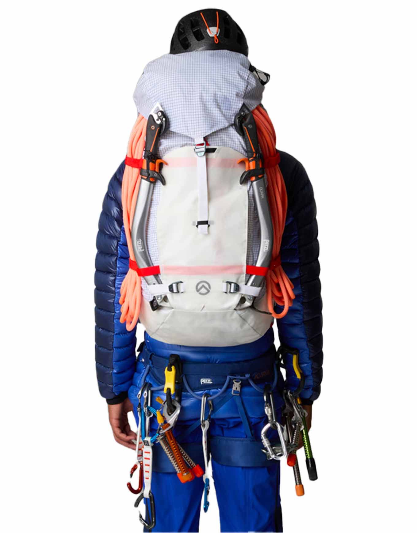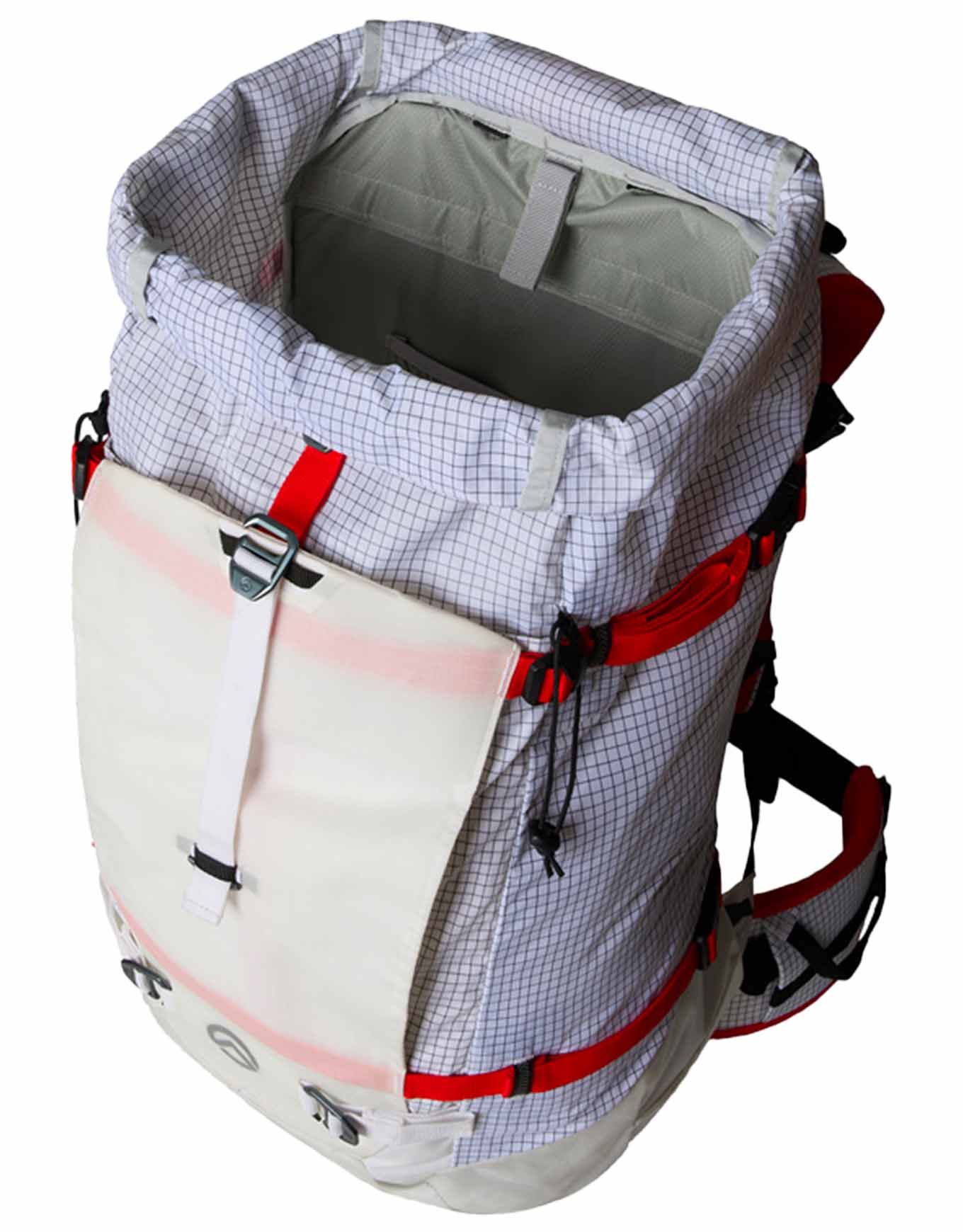 Avec ses 65 litres de capacité, ce modèle permet d’emporter tout l’équipement requis pour une course de longue durée. L’organisation en est facilitée par de multiples solutions de rangement : porte-piolet intégré, poche extérieure spacieuse réservée aux crampons, sangle de compression convertible en attache-corde, ainsi qu’une poche ceinture équipée d’une boucle à outils. L’hydratation s’effectue sans ouvrir le sac grâce à un manchon dédié.