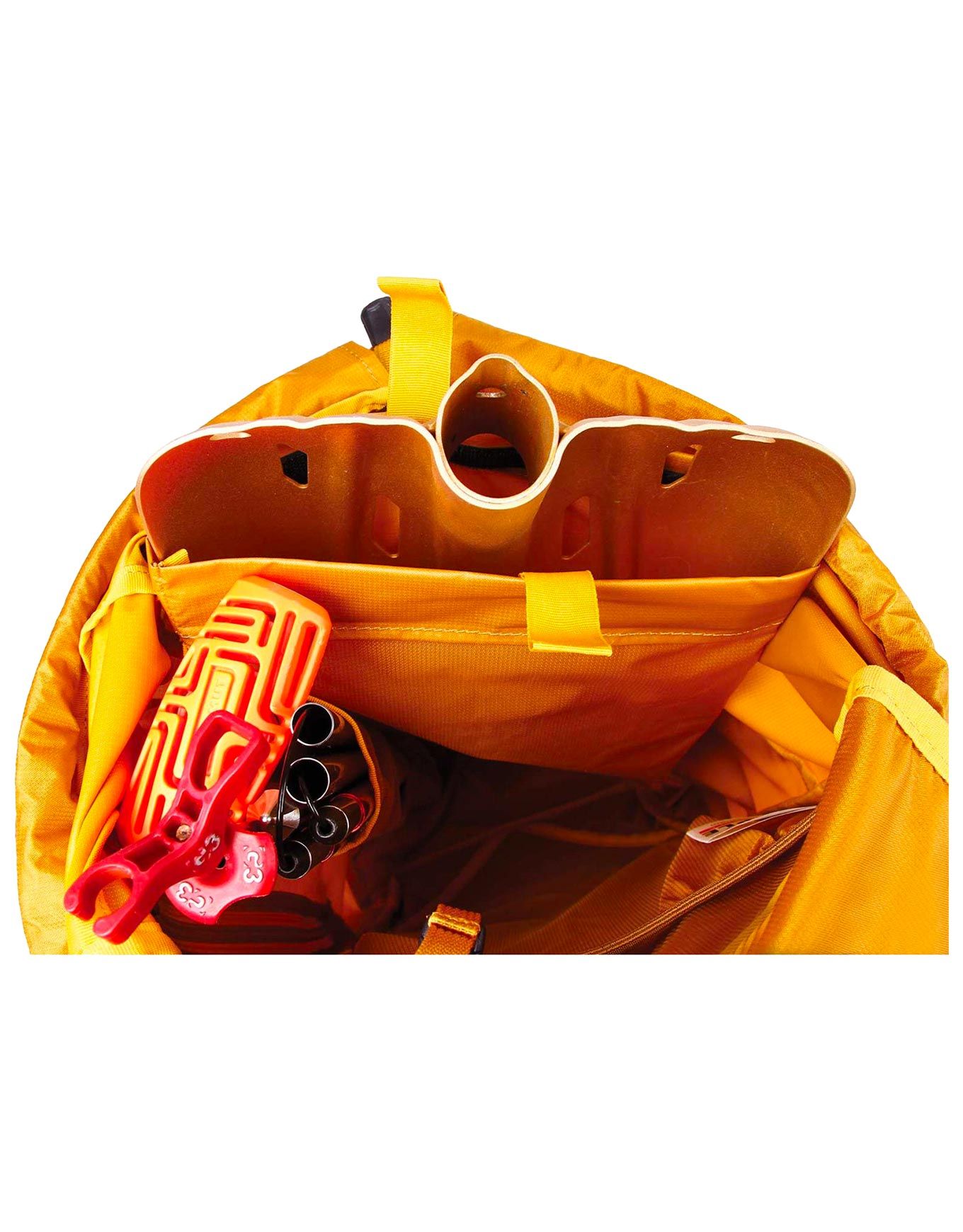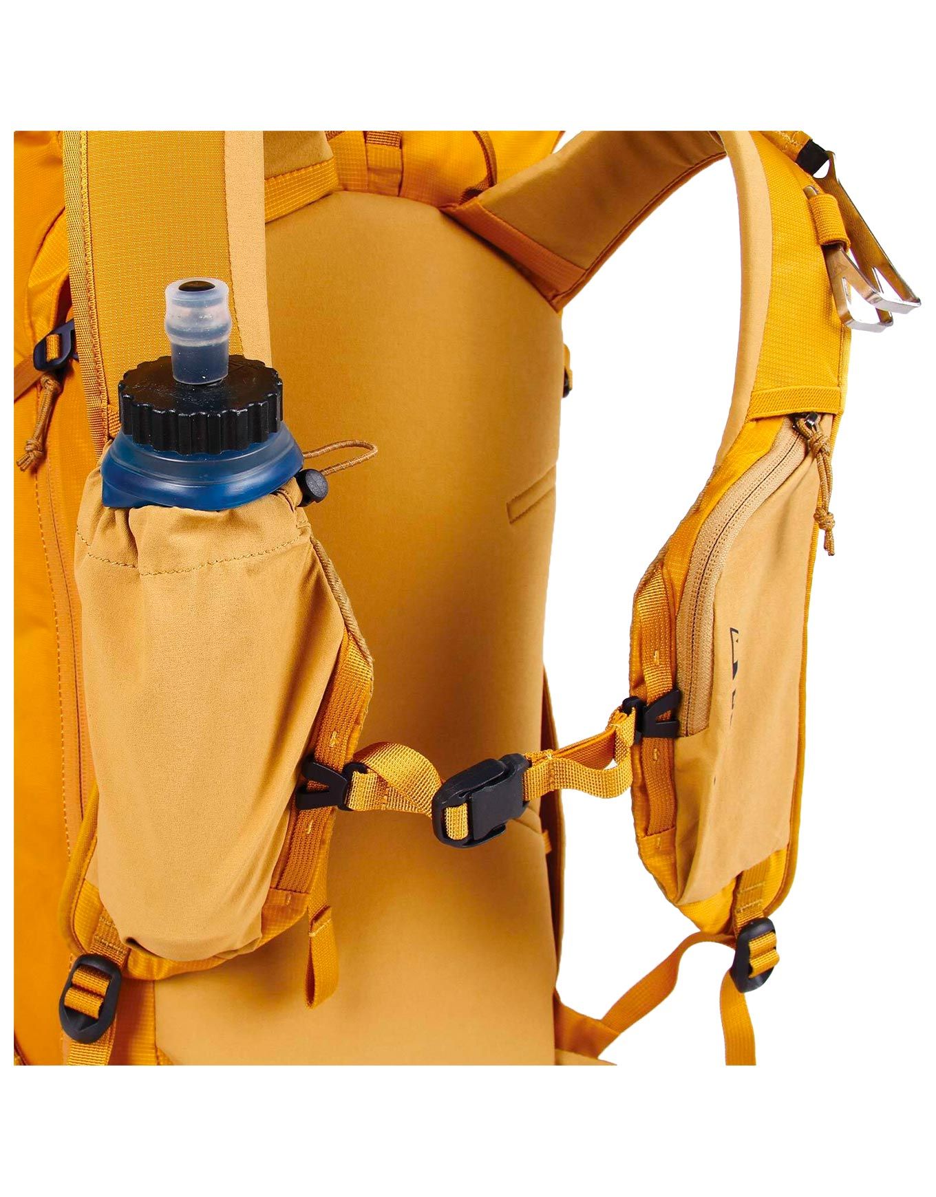 Le portage latéral des skis est assuré par des sangles latérales, tandis que deux portes-piolets permettent de fixer les outils de progression. Le matériel de sécurité trouve sa place dans des poches intérieures dédiées, et une ouverture sur le côté facilite l’accès au compartiment principal sans nécessiter de décharger l’intégralité du contenu.