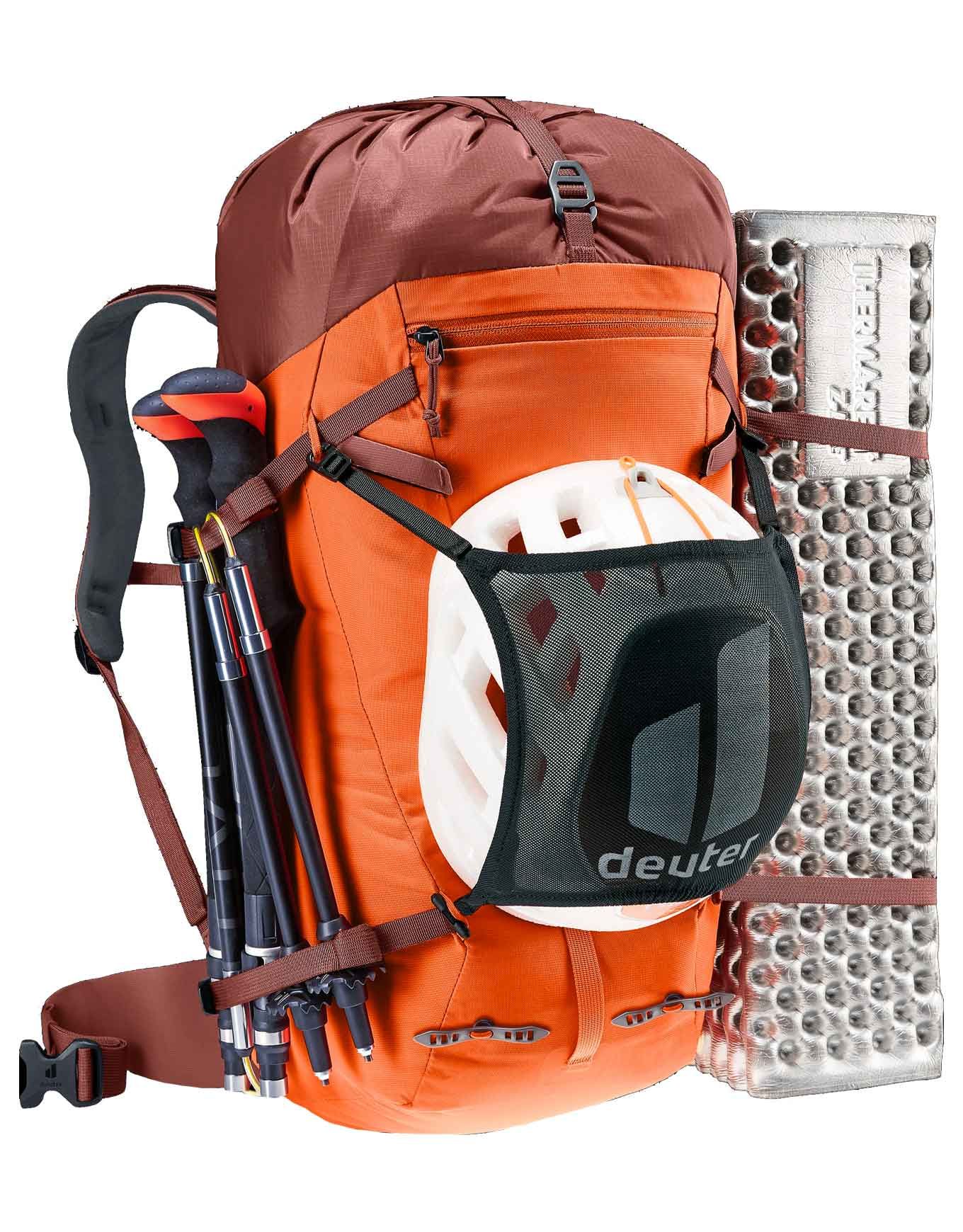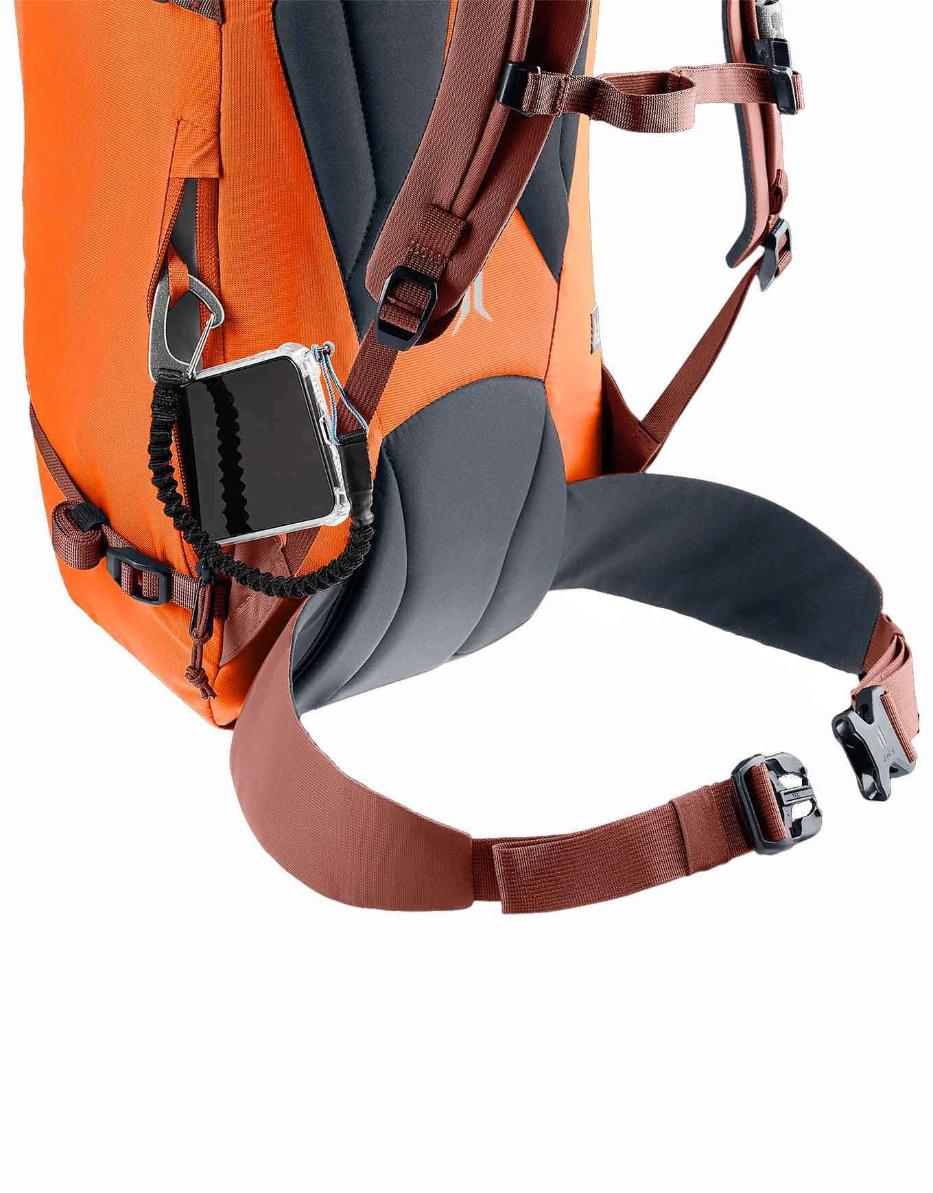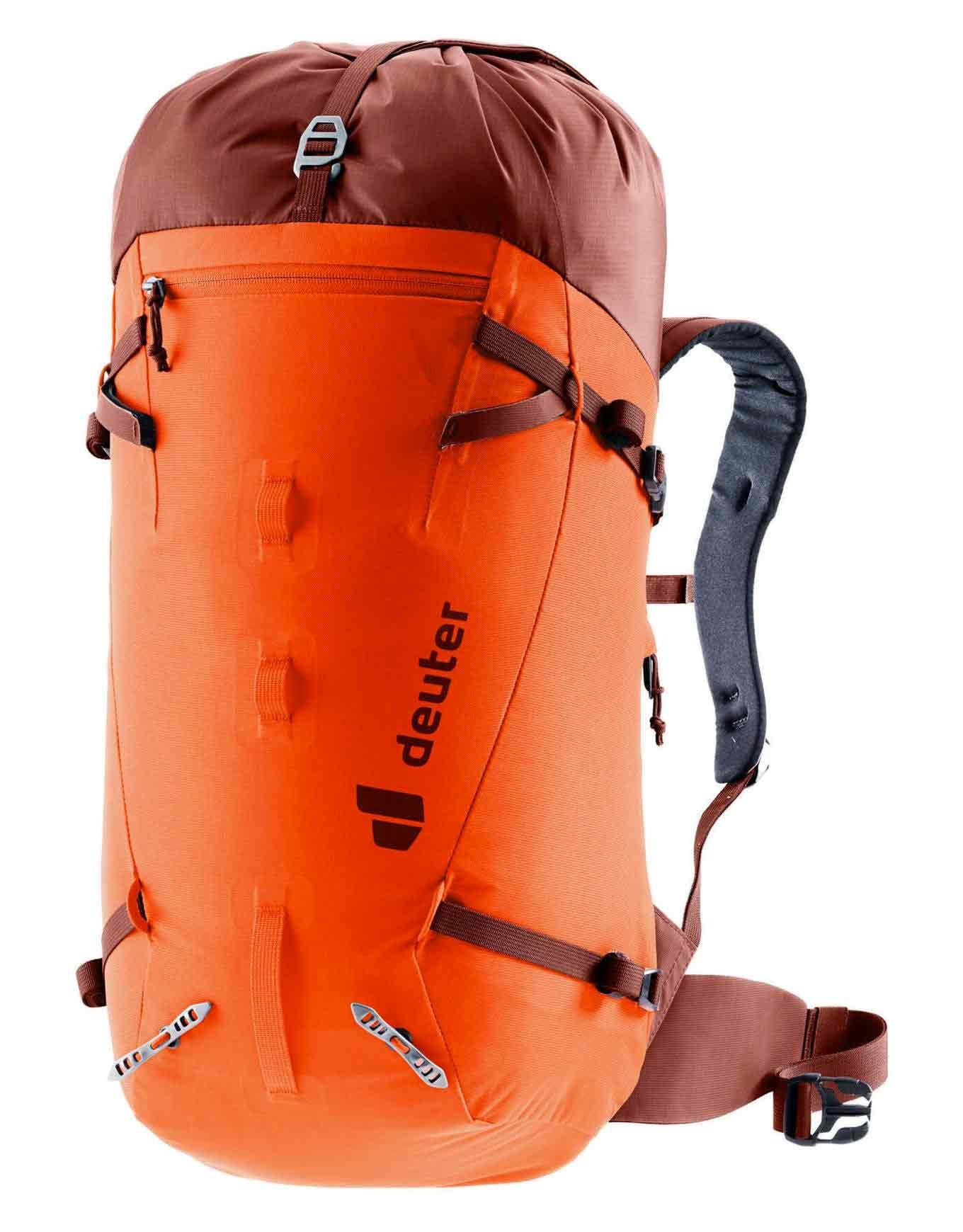Sac à dos d’alpinisme femme Deuter Guide 28 SL Papaya Redwood, 28 L, dos court Lite, cadre U Delrin®, poche 3 L, fixations casque-piolet.