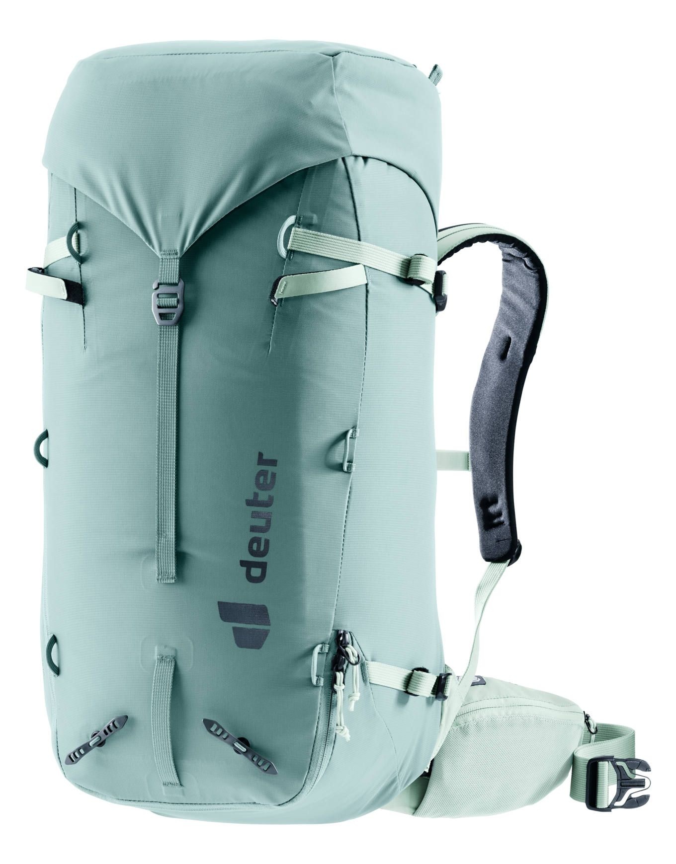 Sac à dos d’alpinisme Deuter Guide 32+8 SL Jade Frost 32 L extensible, dos court et bretelles féminines, fixations piolet/corde, poche eau 3 L, confort Alpine.