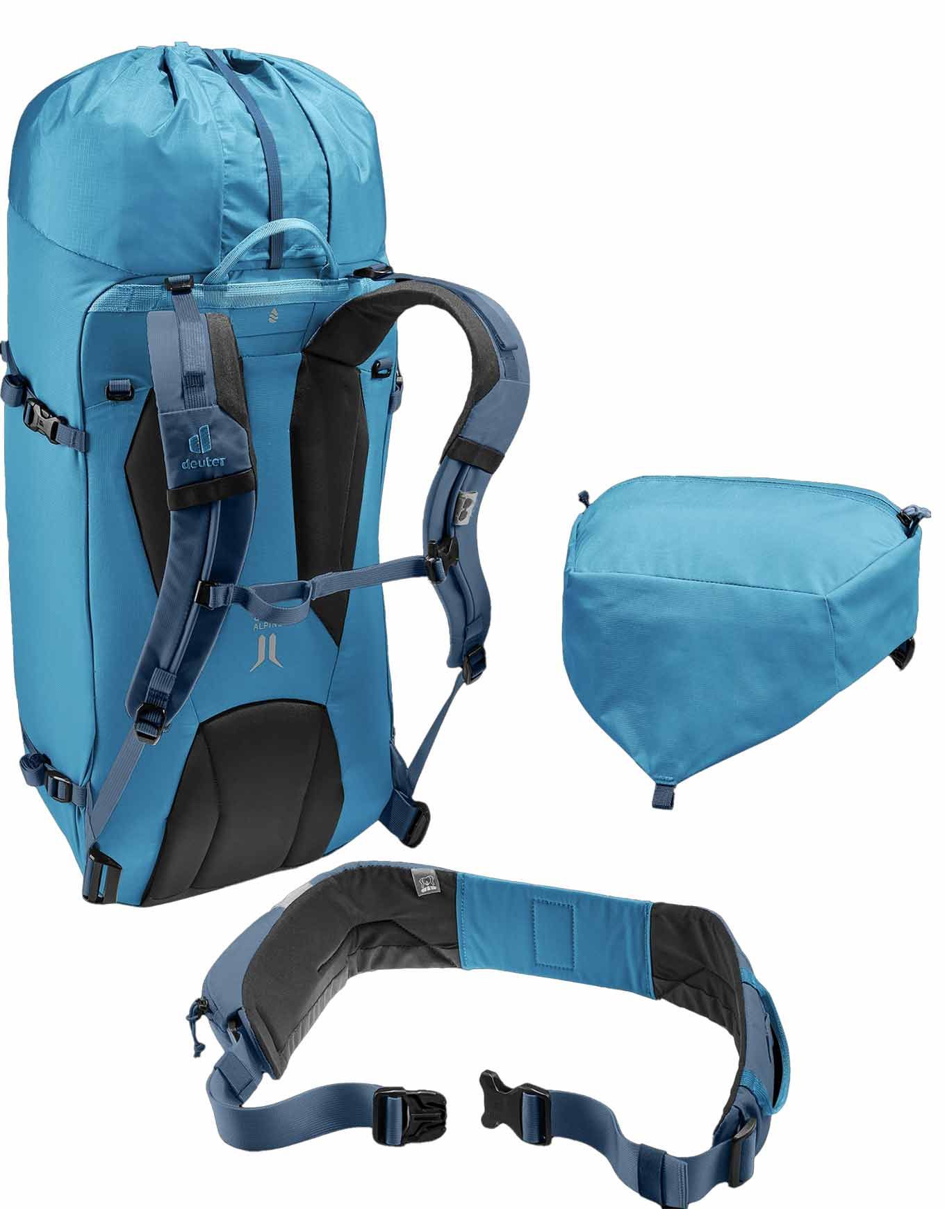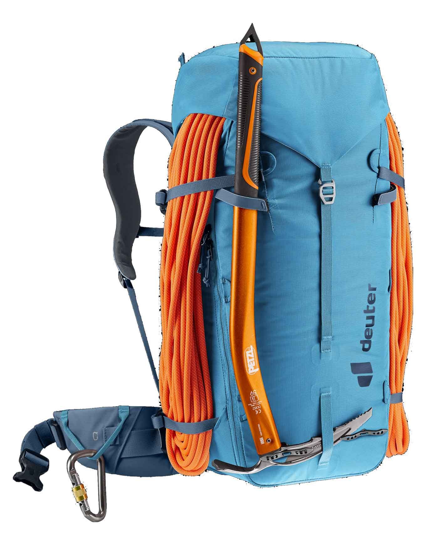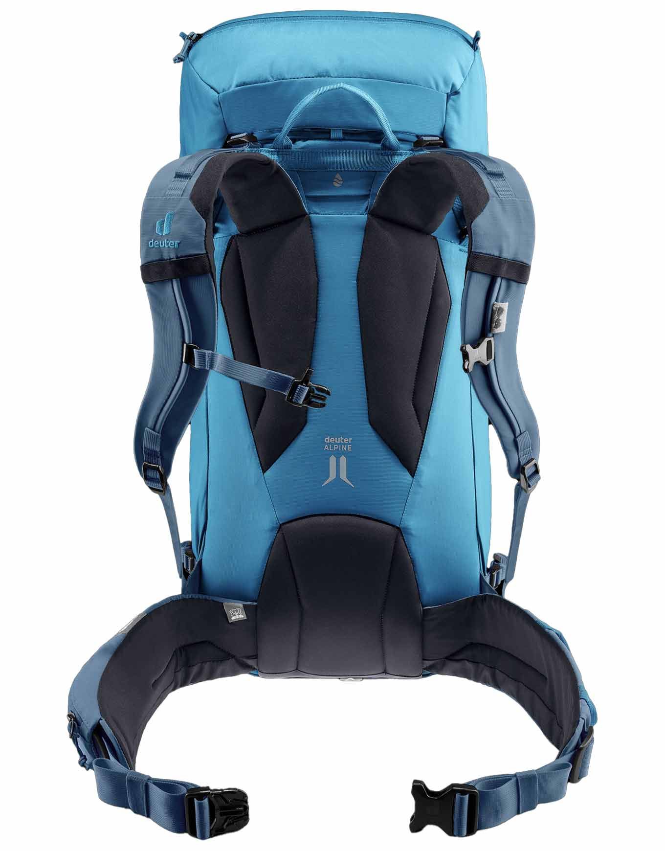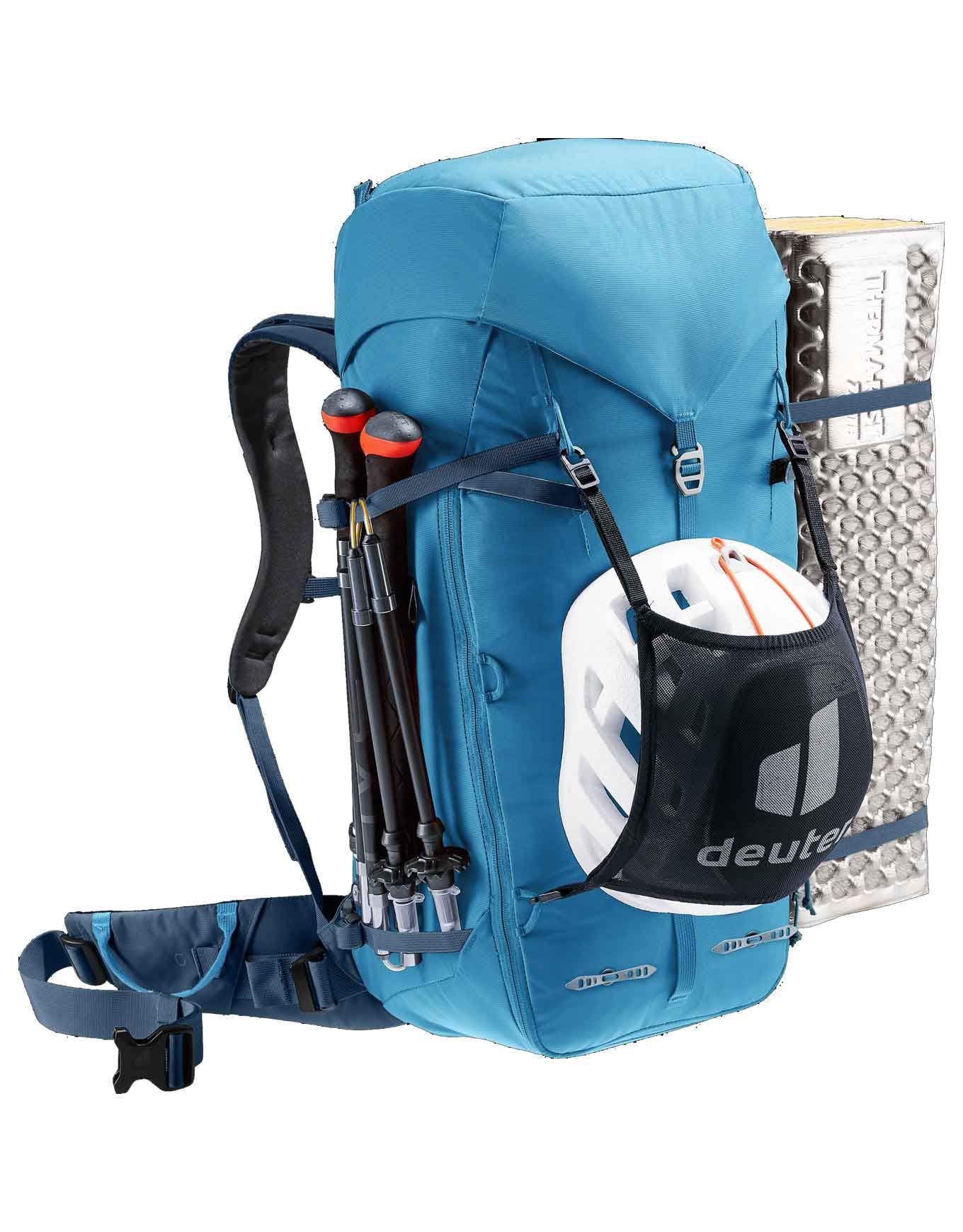 Sac à dos d’alpinisme Deuter Guide 34+8 Wave Ink 34 L extensible +8 pour homme, compatible poche à eau 3 L, fixations piolet/corde, dorsal Alpine avec cadre U Delrin® amovible, bretelles réglables, ceinture et rabat détachables.