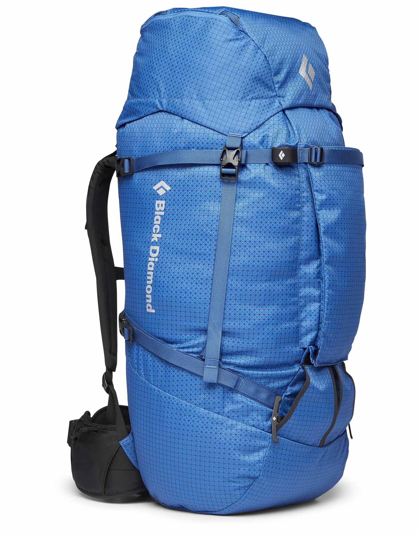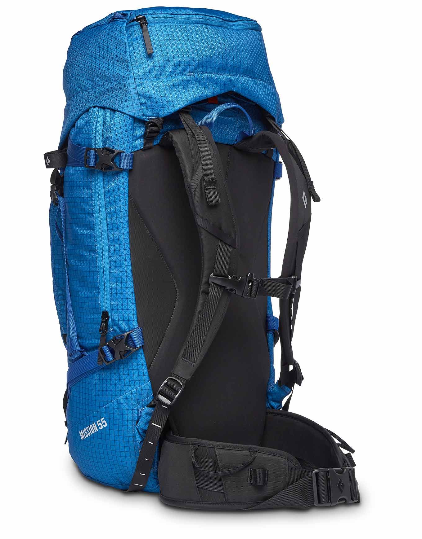 Sac à dos d’alpinisme Black Diamond Mission 55 Cobalt, 55 L, en nylon X-Rip 420D UTS™ résistant à l’abrasion et aux intempéries, avec bretelles harnais, panneau dorsal anti-humidité, porte-piolets PickPockets™, porte-crampons et ceinture amovibles.