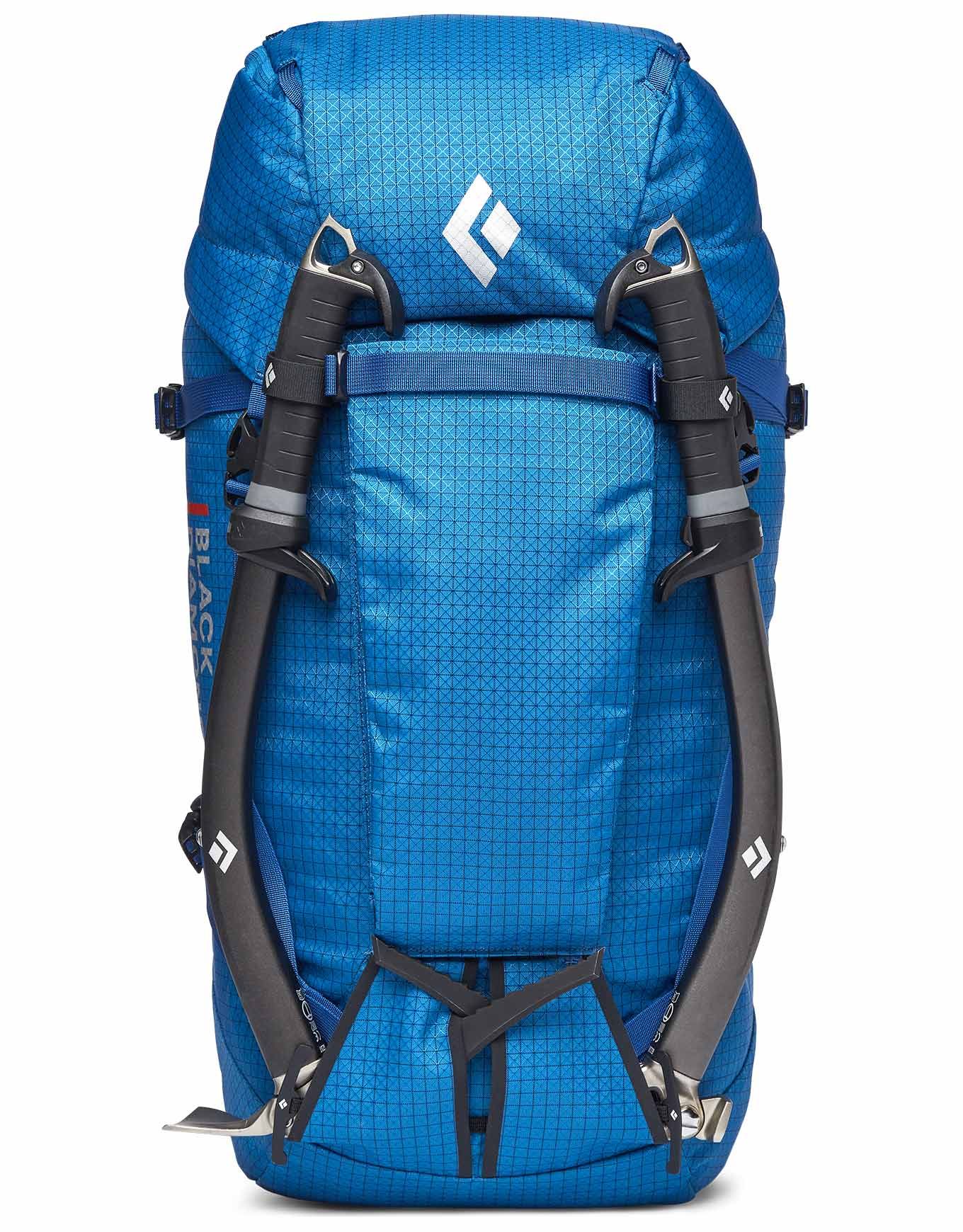 Le transport sécurisé de votre matériel à l’extérieur du sac est rendu possible par des porte-piolets PickPockets™ allégés, des porte-crampons amovibles ainsi qu’un porte-corde escamotable.