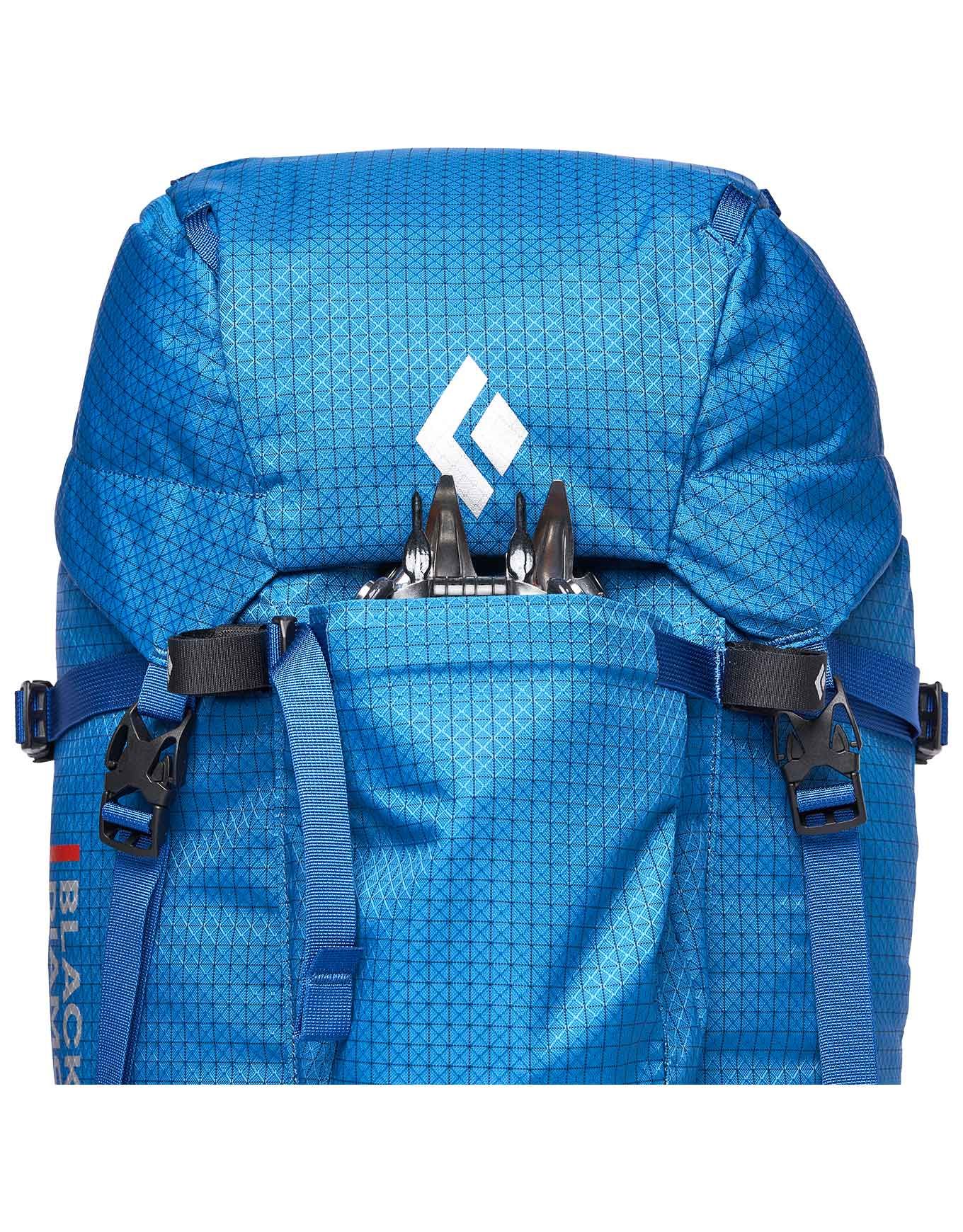 Le transport sécurisé du matériel à l’extérieur est facilité par des porte-piolets PickPockets™ allégés, des porte-crampons amovibles ainsi qu’un porte-corde escamotable.