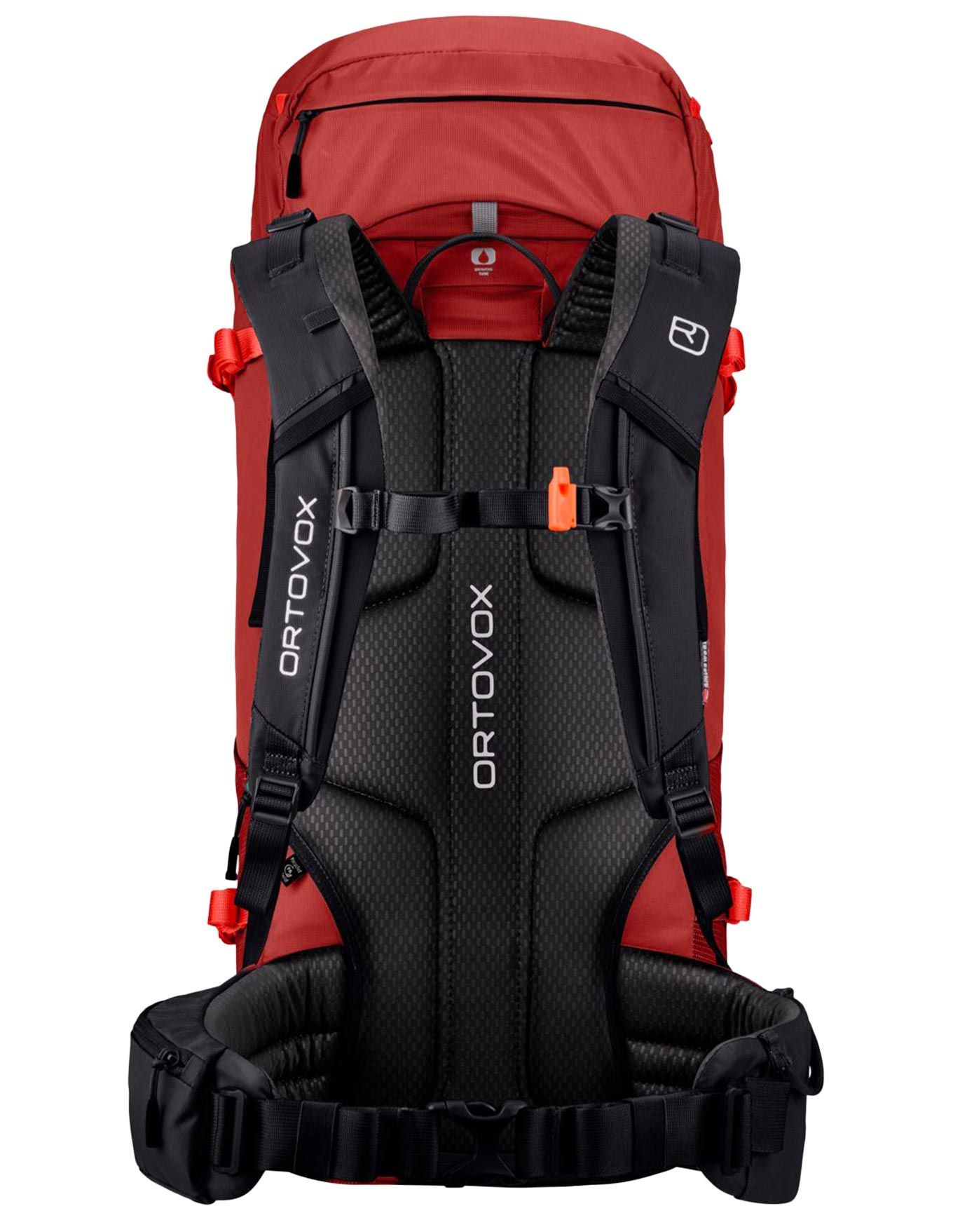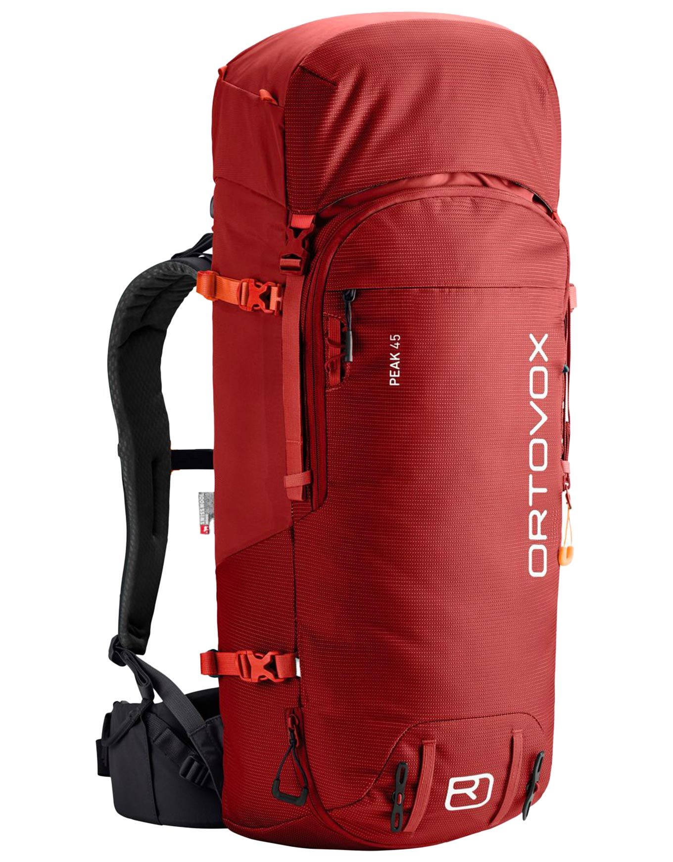 Le sac à dos d’alpinisme Ortovox Peak 45 Cengia Rossa pour homme, en nylon 420D Manstar ultra-résistant, offre compartiment sécurité, fixations corde, piolet, crampons, accès rapide frontal et dorsale laine Suisse compressée régulant température et humidité pour le confort en haute montagne.