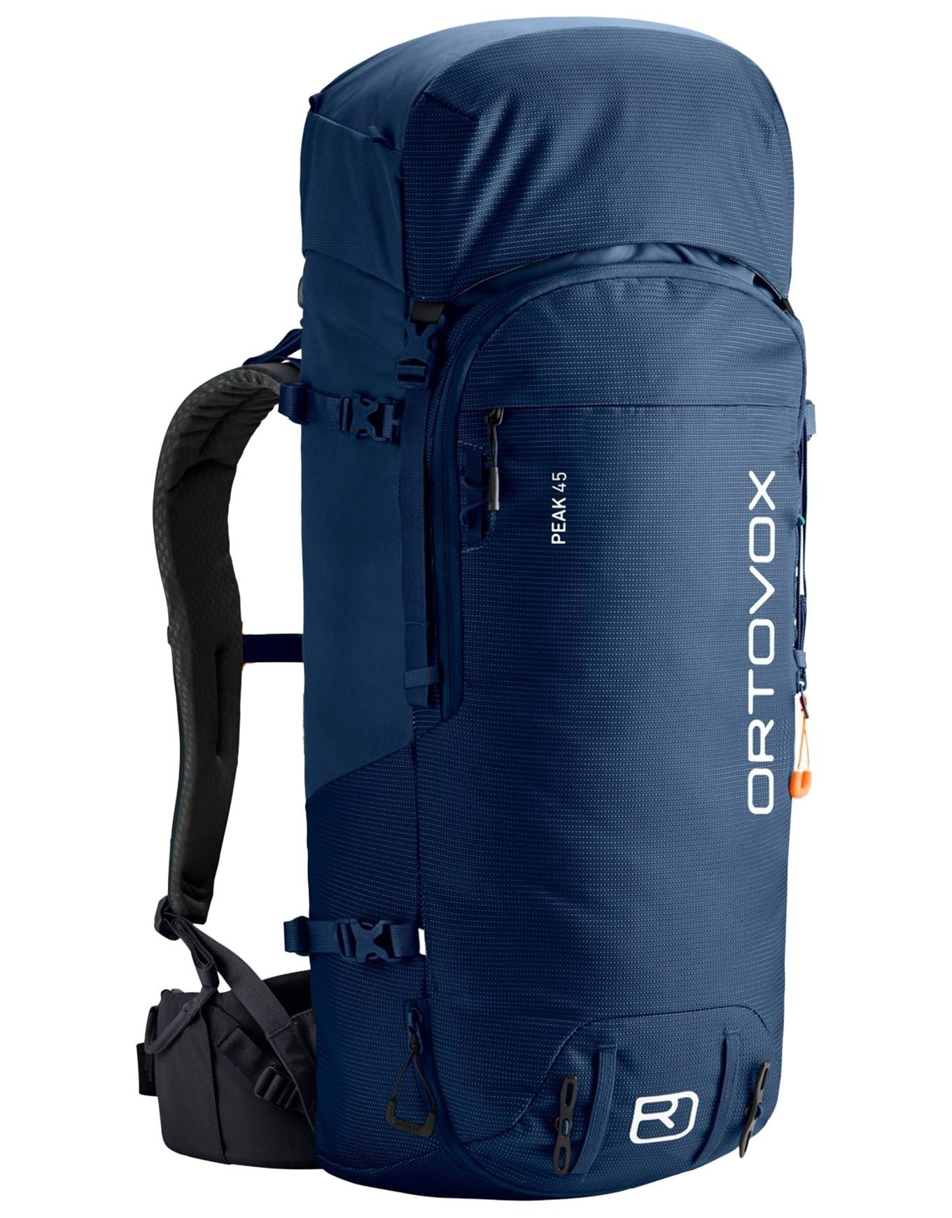 Sac à dos d’alpinisme Ortovox Peak 45 Deep Ocean pour homme, en Nylon 420D Manstar ultra-résistant, compartiment sécurité, fixations corde, piolet, crampons, poche carte, dos Swisswool respirant.