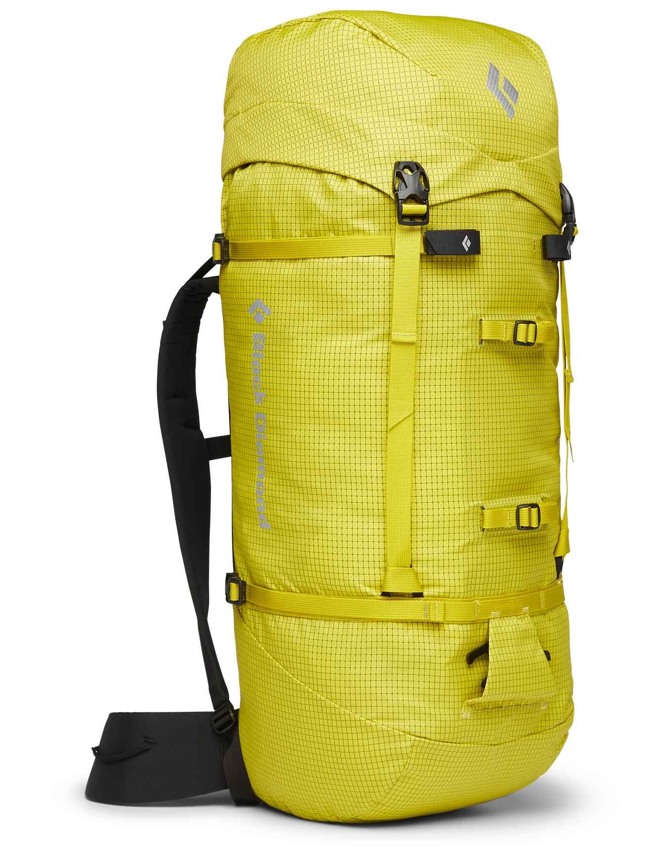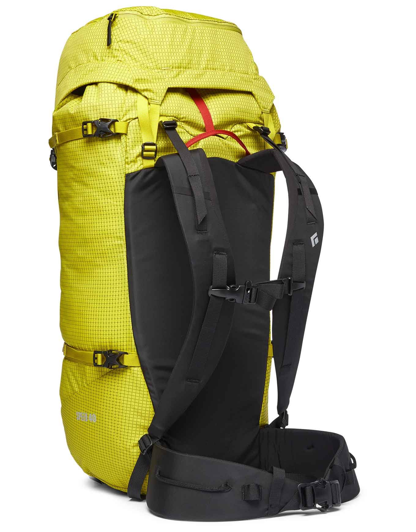 Black Diamond Speed 40 Sulphur : sac à dos alpine 40 L en nylon X-Rip 210D UTS™, bretelles harnais, panneau dorsal anti-humidité amovible, porte-piolets PickPockets™, porte-crampons et corde escamotable pour approche et ascension.
