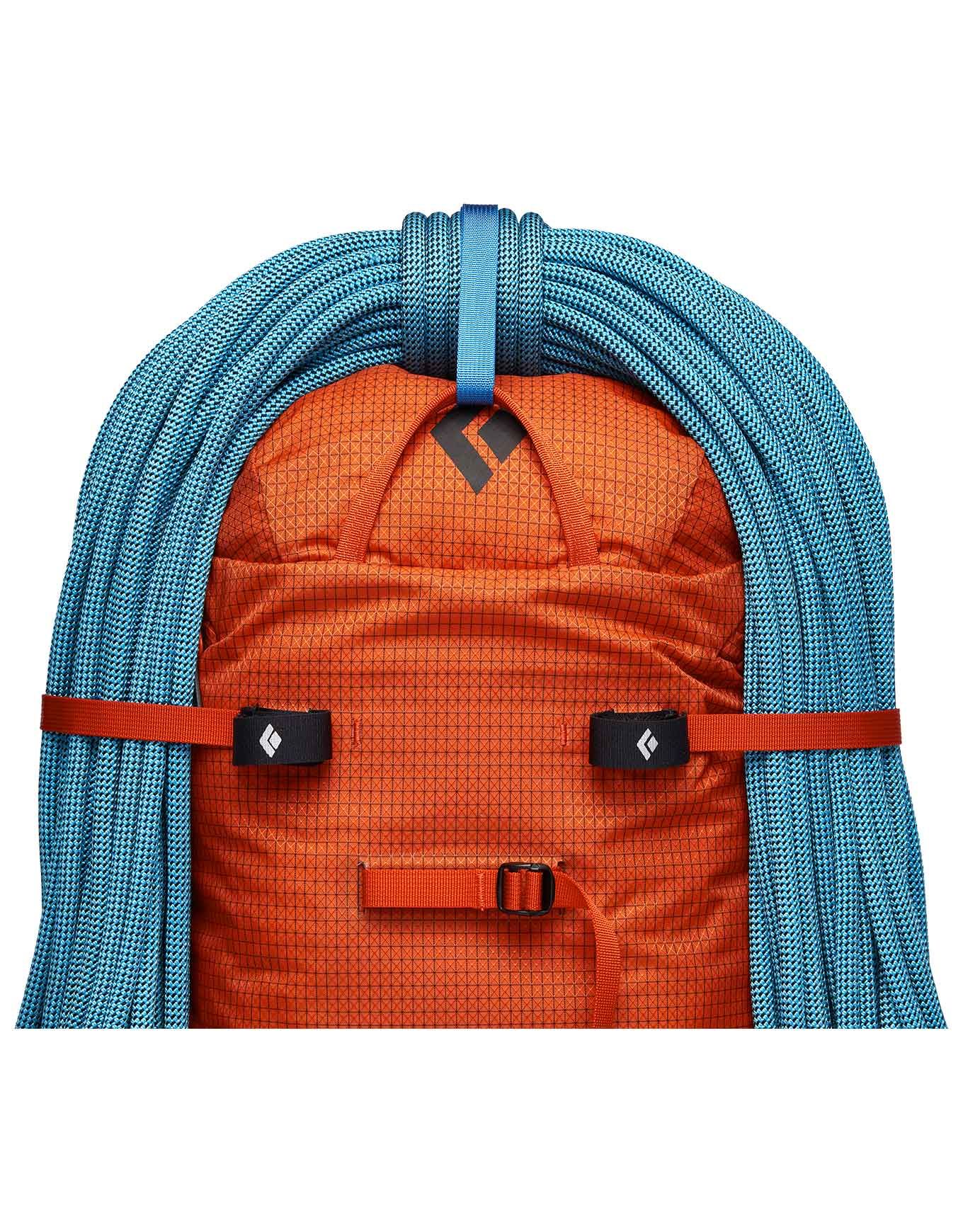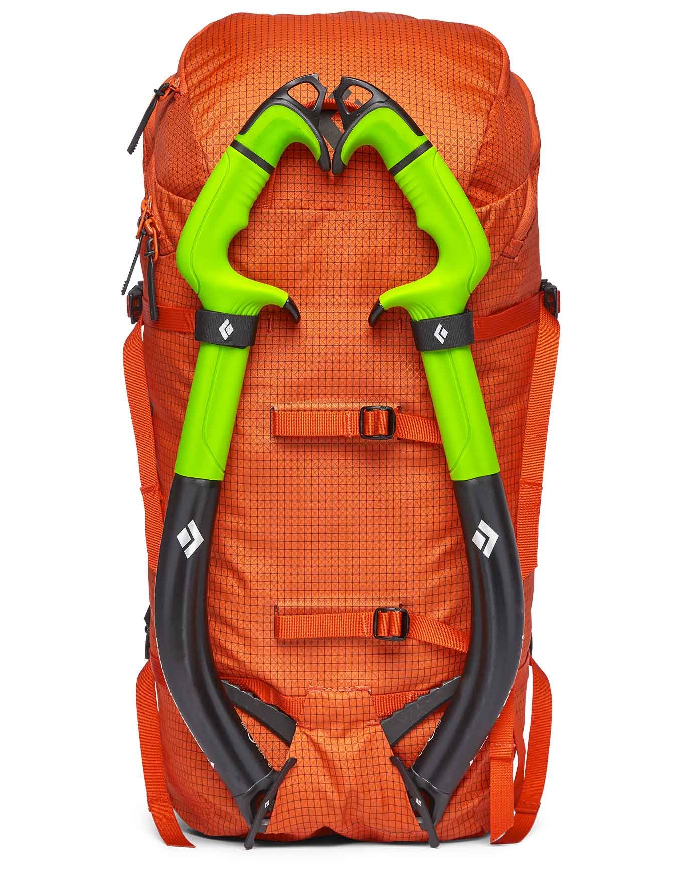 Le transport sécurisé du matériel à l’extérieur du sac est assuré par les porte-piolets PickPockets™ allégés, les porte-crampons amovibles ainsi que le porte-corde escamotable.
