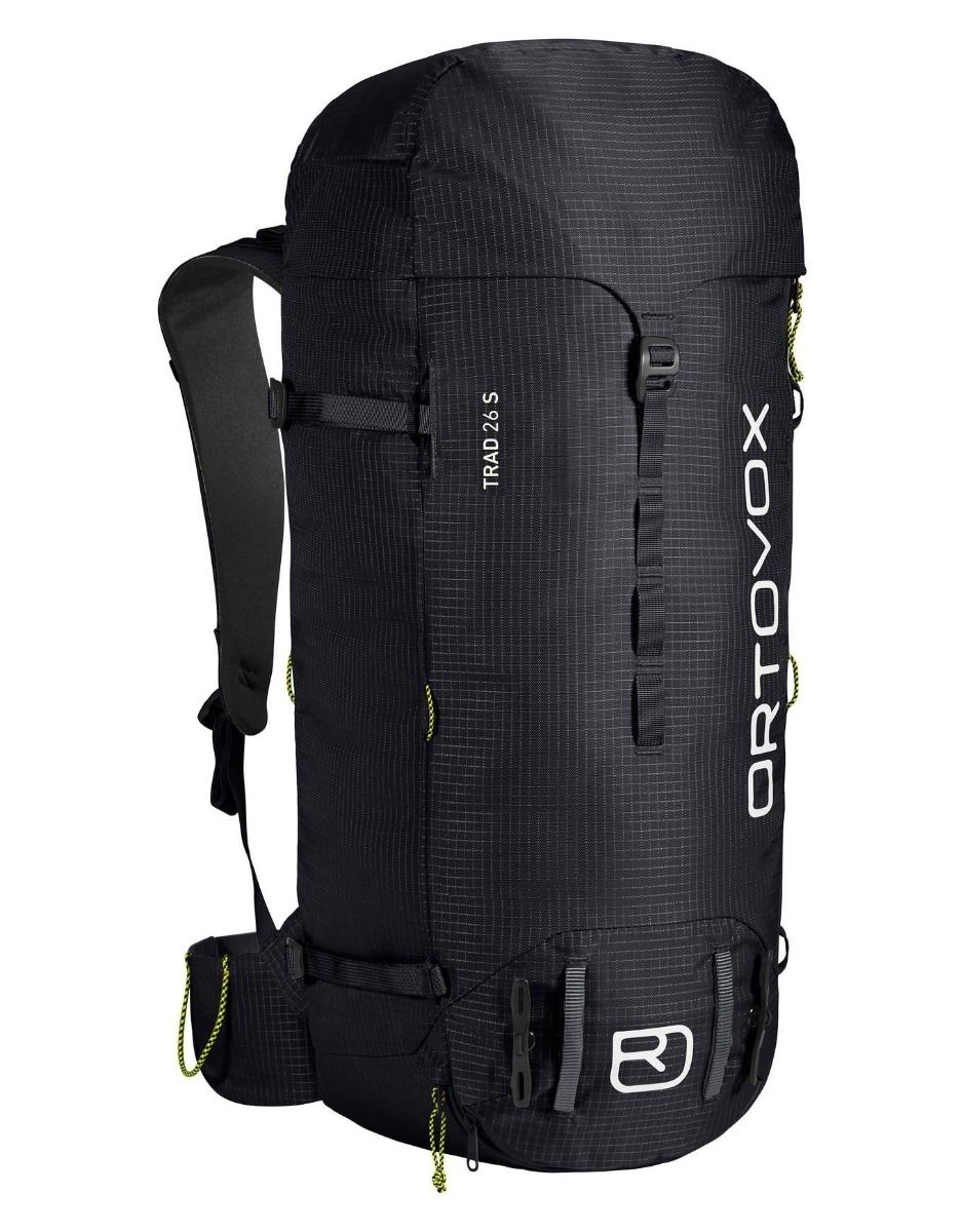 Sac d’alpinisme Ortovox Trad 26 S Black Raven spécifiquement adapté aux femmes, volume 26 L, accès haut et avant, compartiments multiples, 88 % polyamide ripstop recyclé, système dorsal 3D ergonomique amovible.