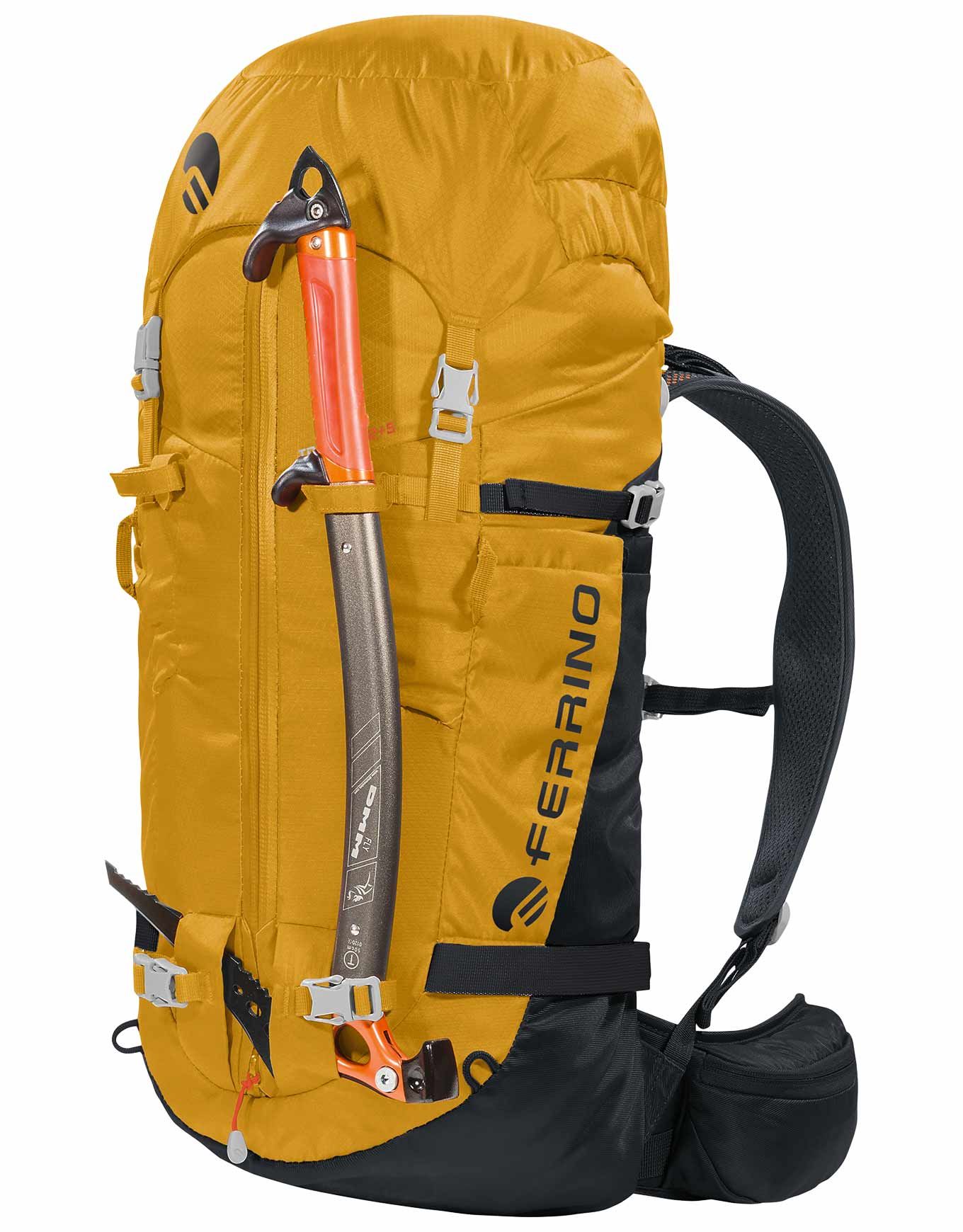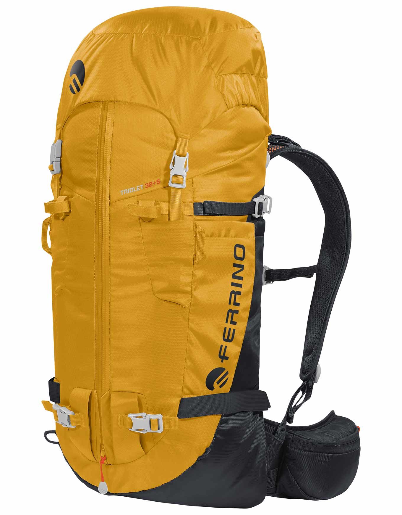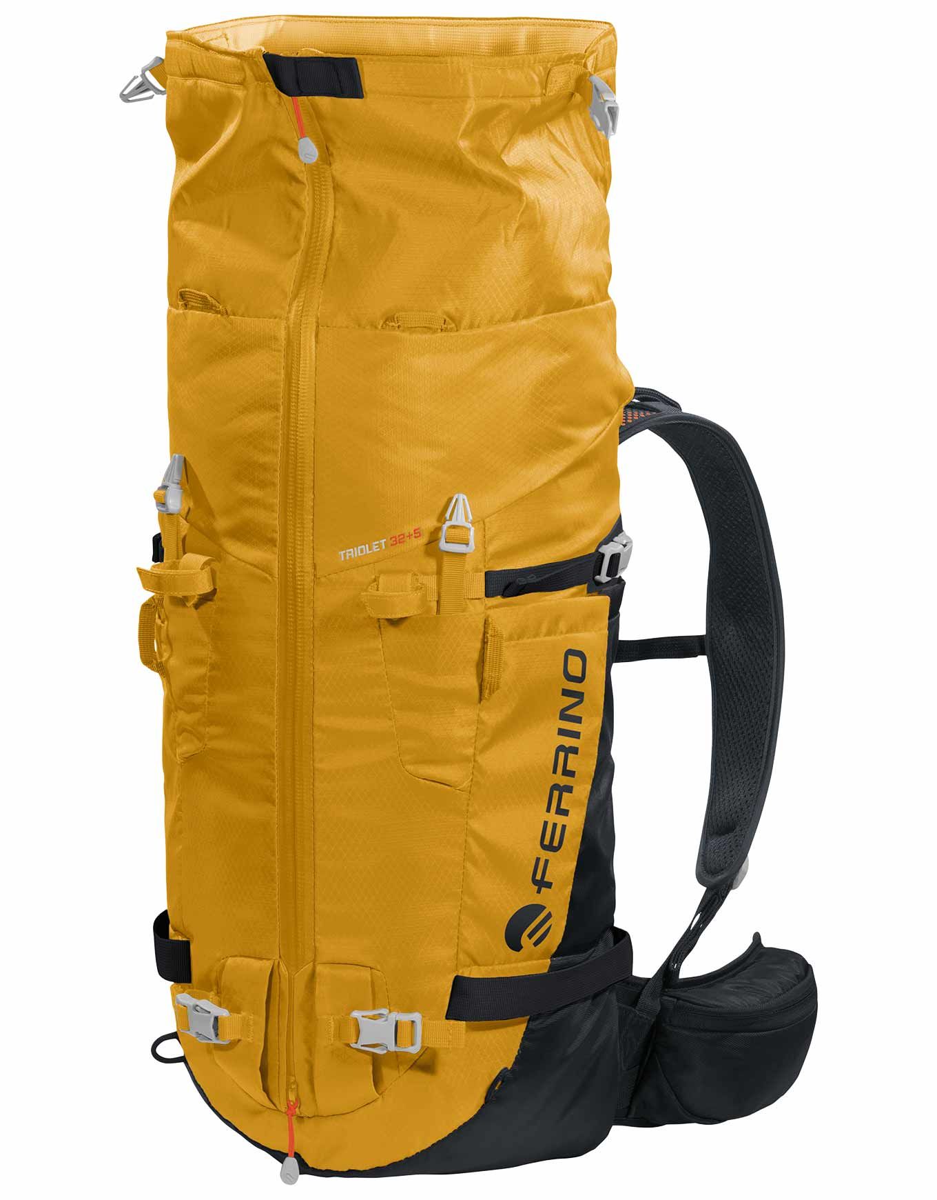 Sac à dos d’alpinisme Ferrino Triolet 32+5 Yellow, 32 l extensibles à 37 l, en Diamond Dobby® résistant, dos Hollow Back System respirant, système Recco® pour la sécurité, compartiments piolets, crampons, skis et hydratation.