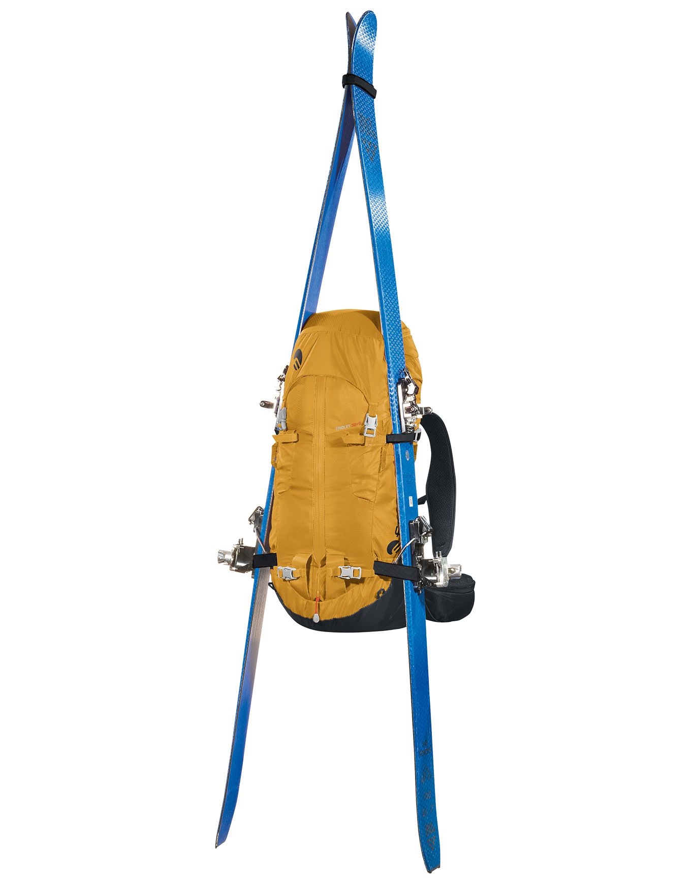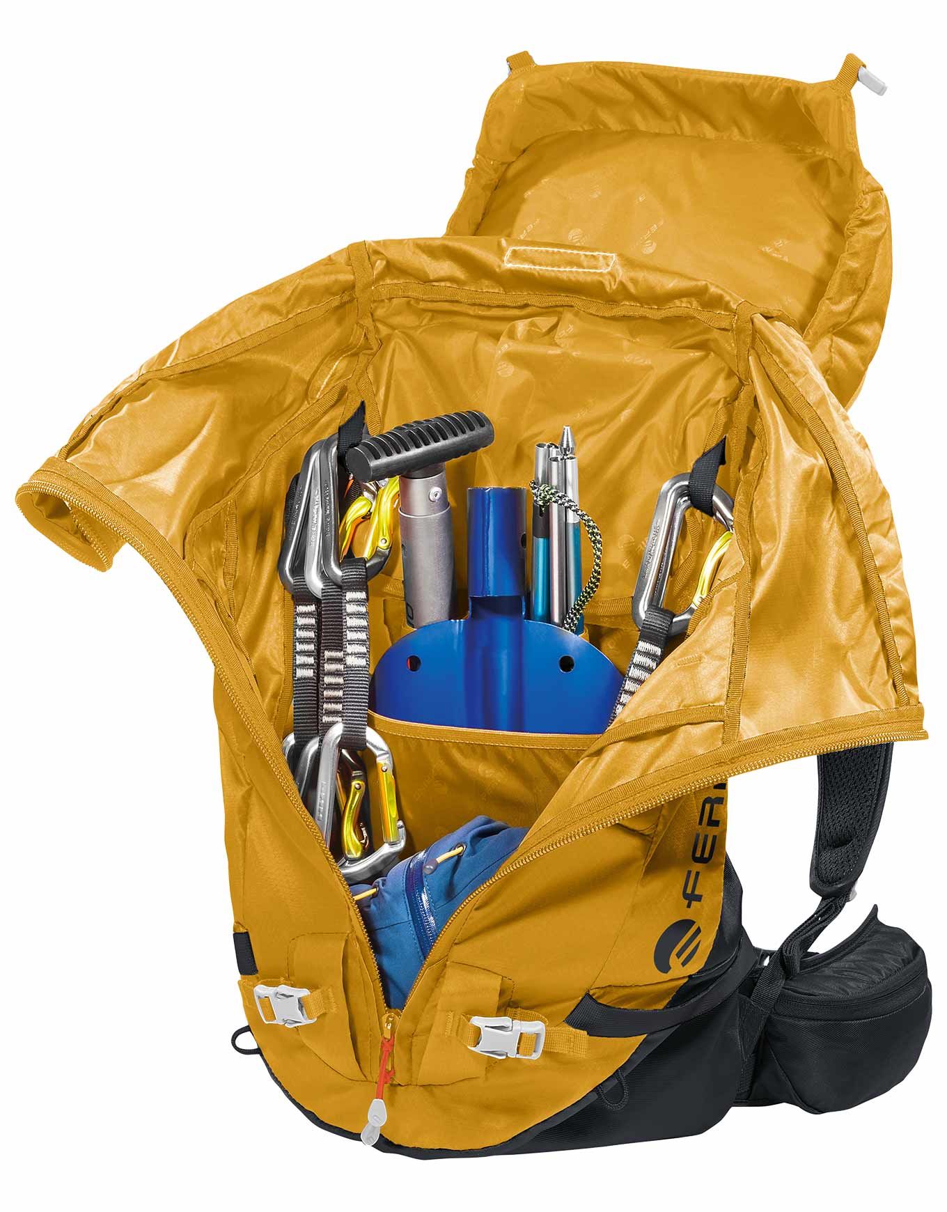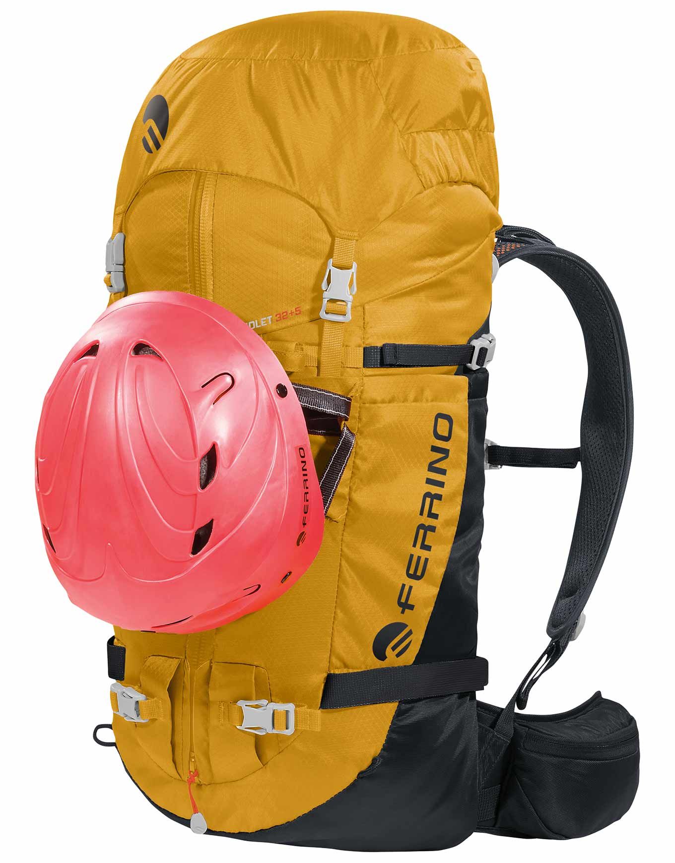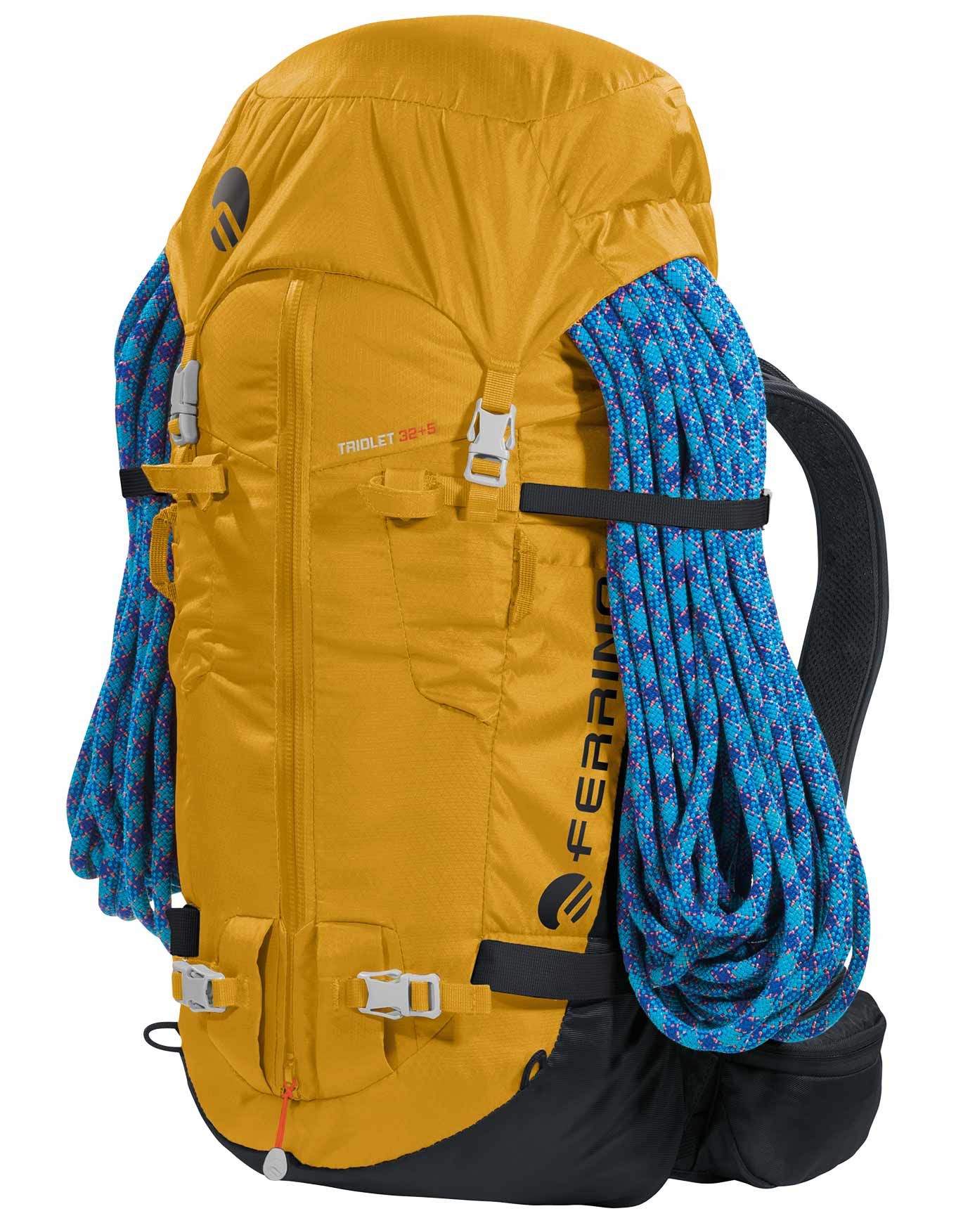 Sac à dos d’alpinisme Ferrino Triolet 32+5 Yellow, 32 l extensibles à 37 l, en Diamond Dobby® résistant, dos Hollow Back System respirant, système Recco® pour la sécurité, compartiments piolets, crampons, skis et hydratation.