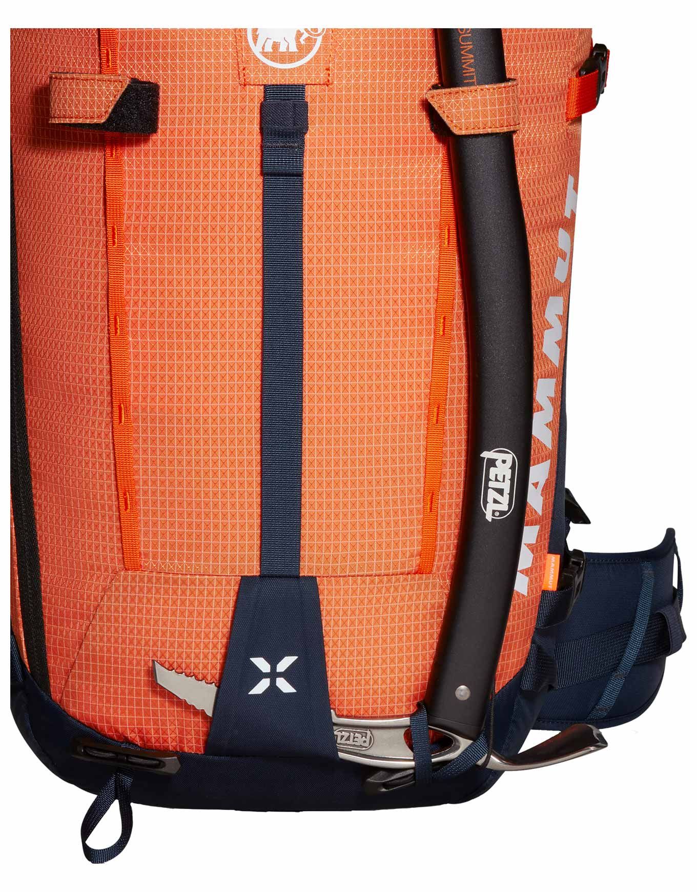 Parmi les équipements complémentaires figurent : deux porte-piolets solides, un support pour bâtons, un porte-skis renforcé et un support de corde intégré au rabat. La compatibilité avec un système d’hydratation complète les fonctionnalités de ce sac.