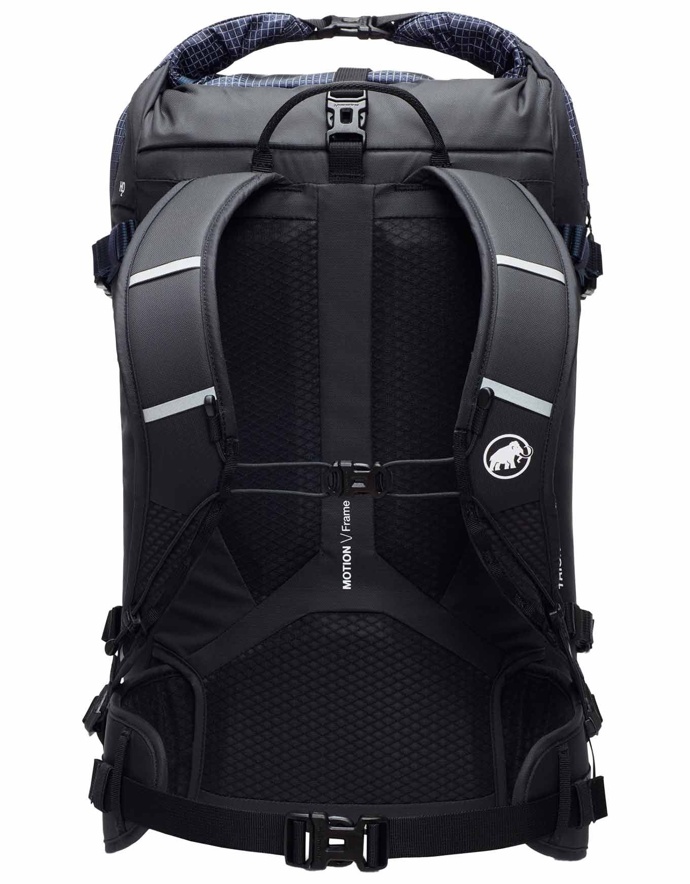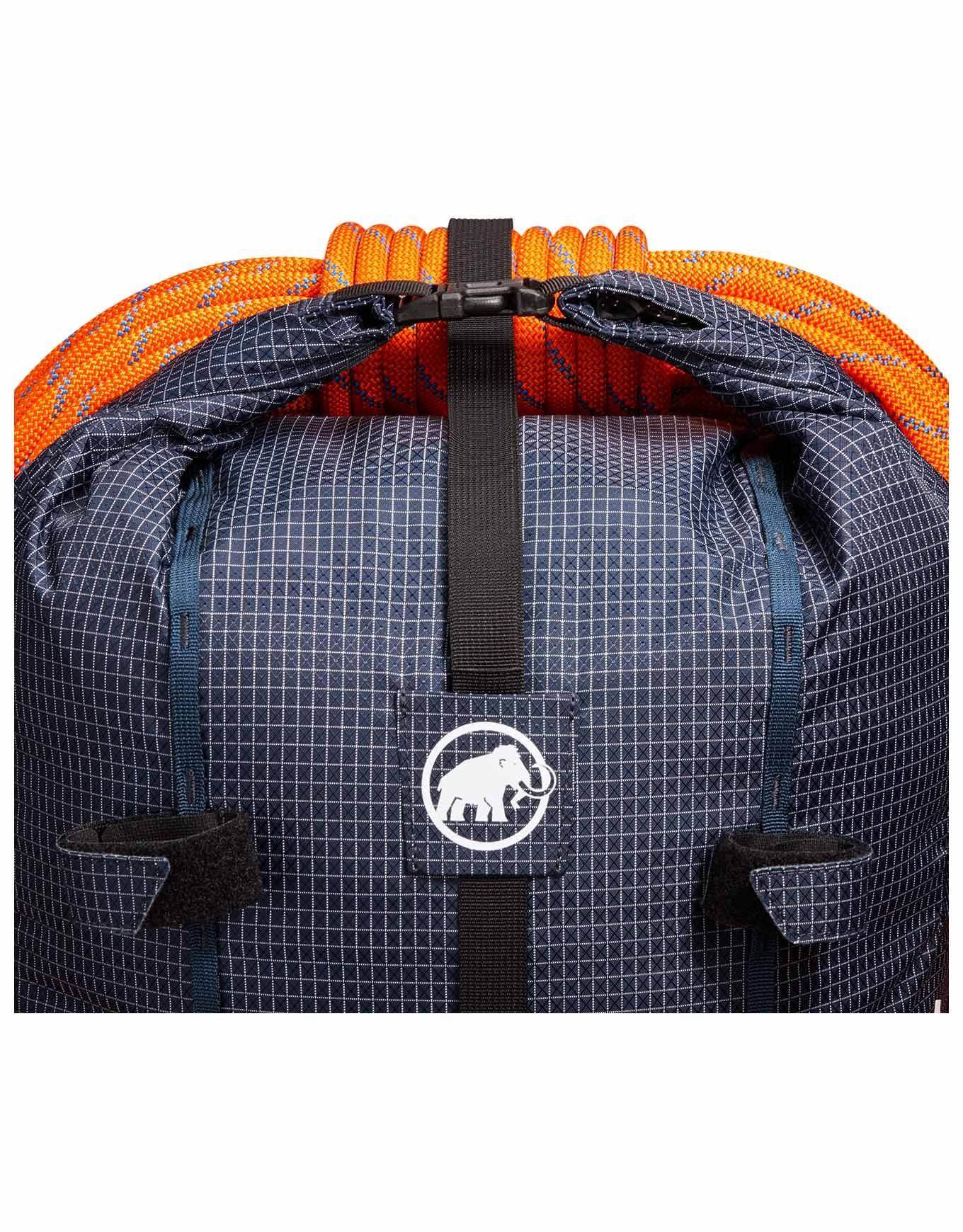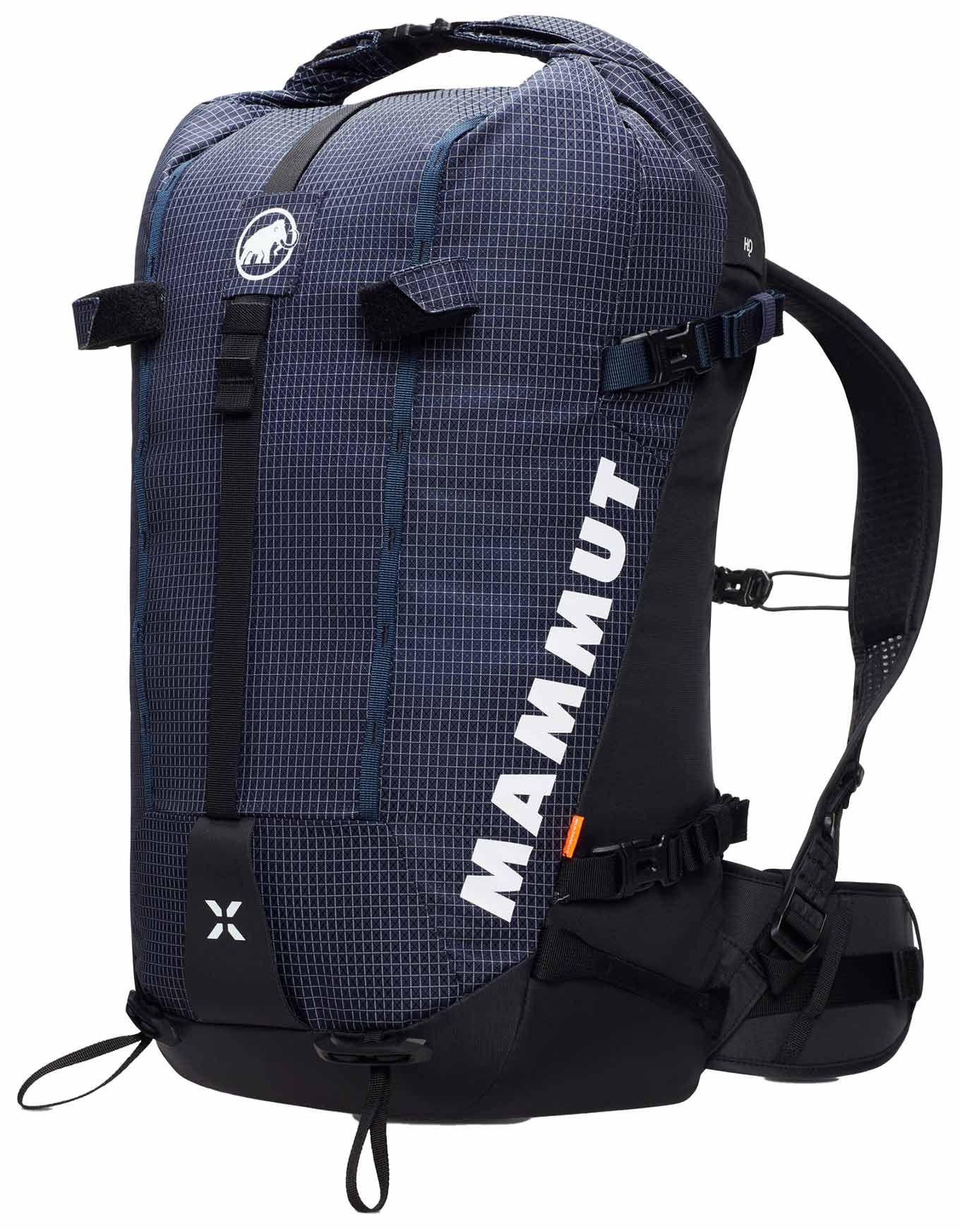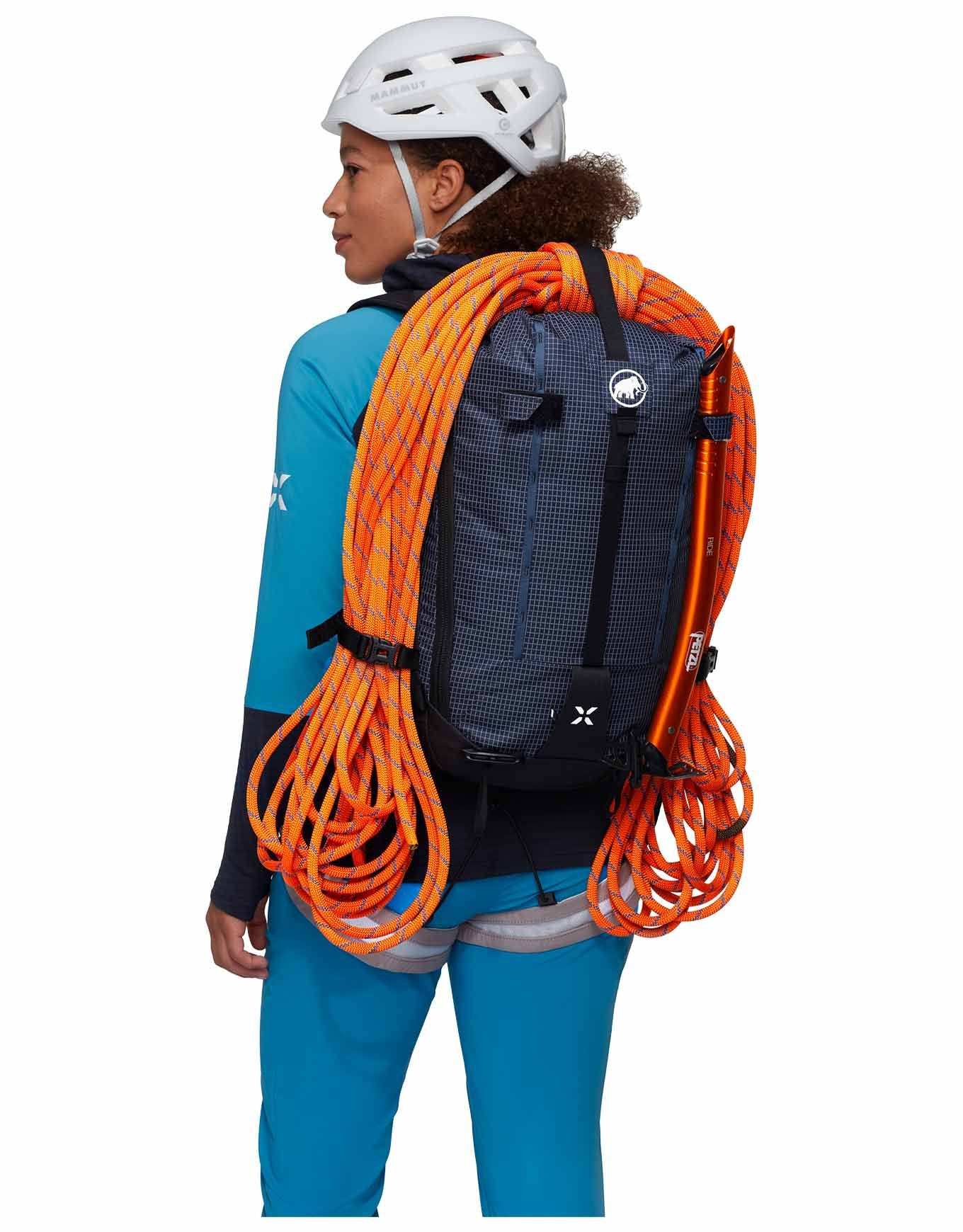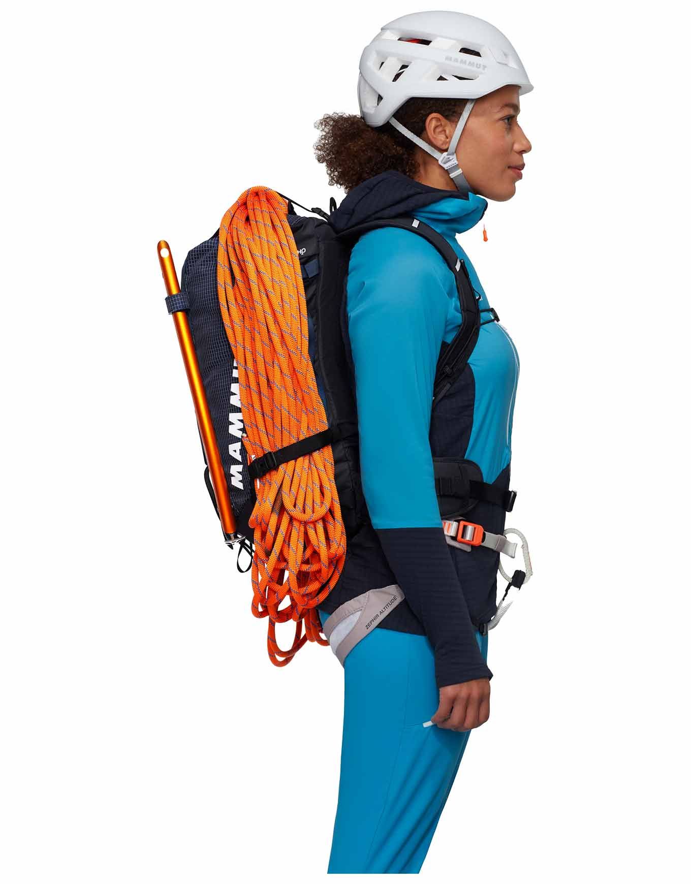 Sac à dos Mammut Trion 28 Women Marine/Black conçu pour l’alpinisme, le ski de rando et l’escalade : anatomie féminine, portage réglé, roll-top zippé, accès latéral, équipement avalanche, porte-piolets, porte-skis, DWR sans PFC, Bluesign®, matière recyclée.