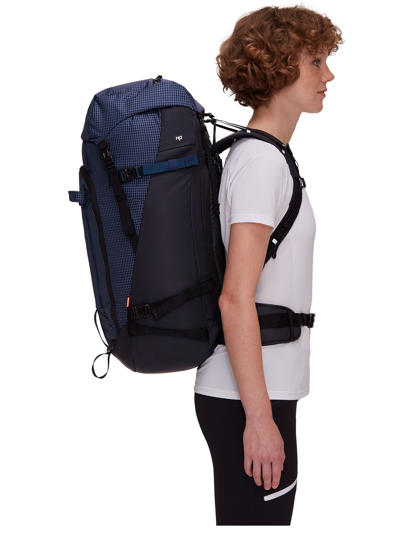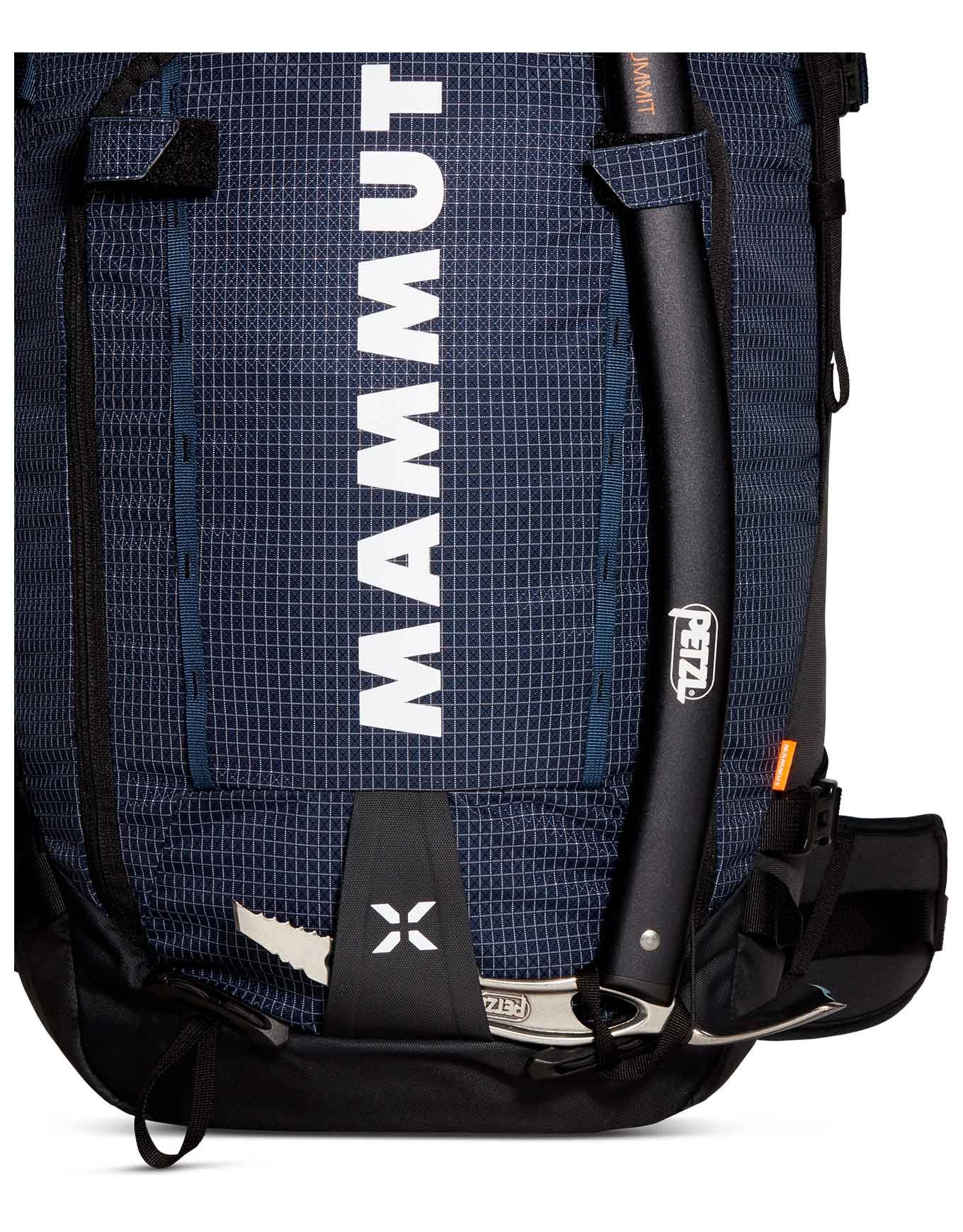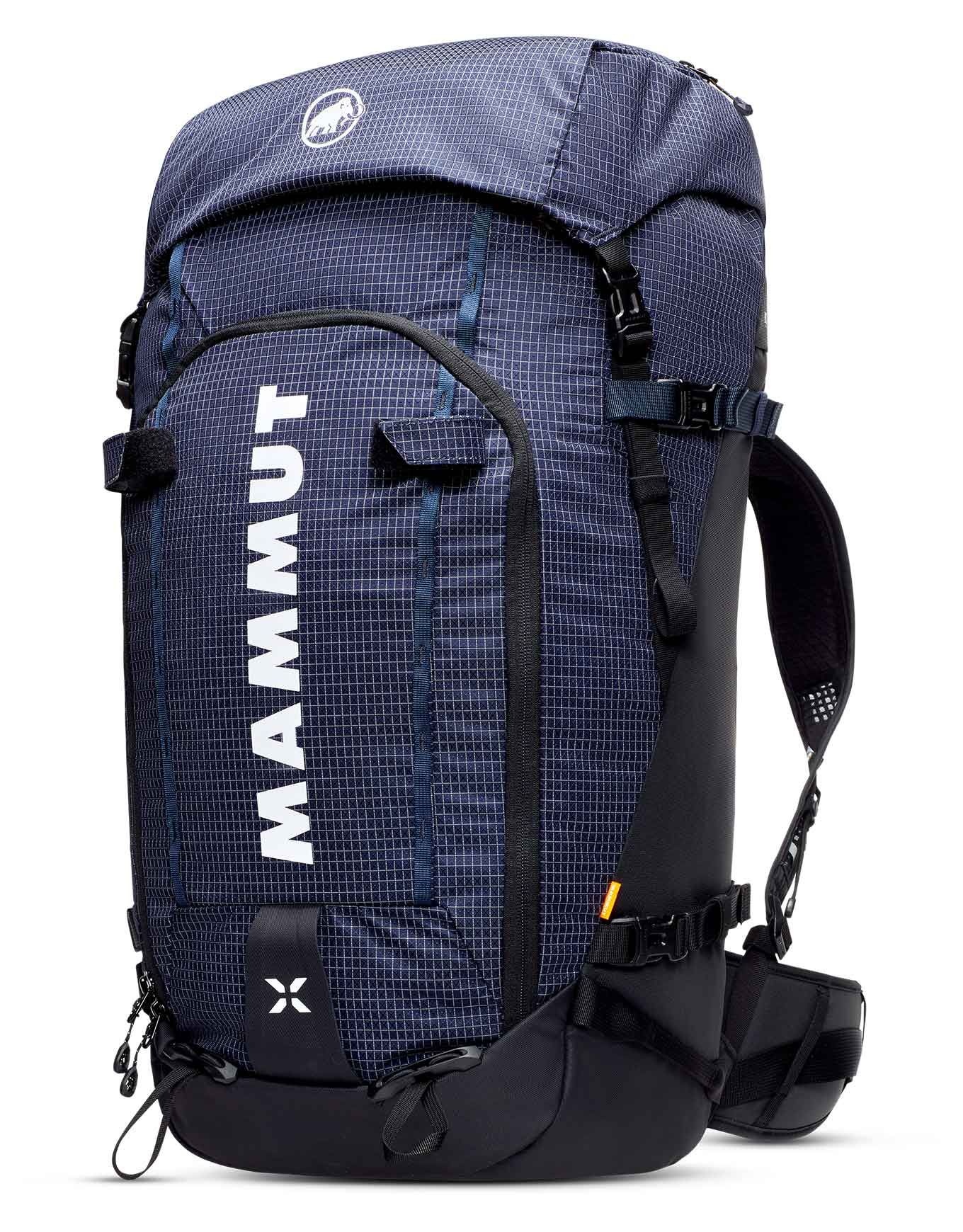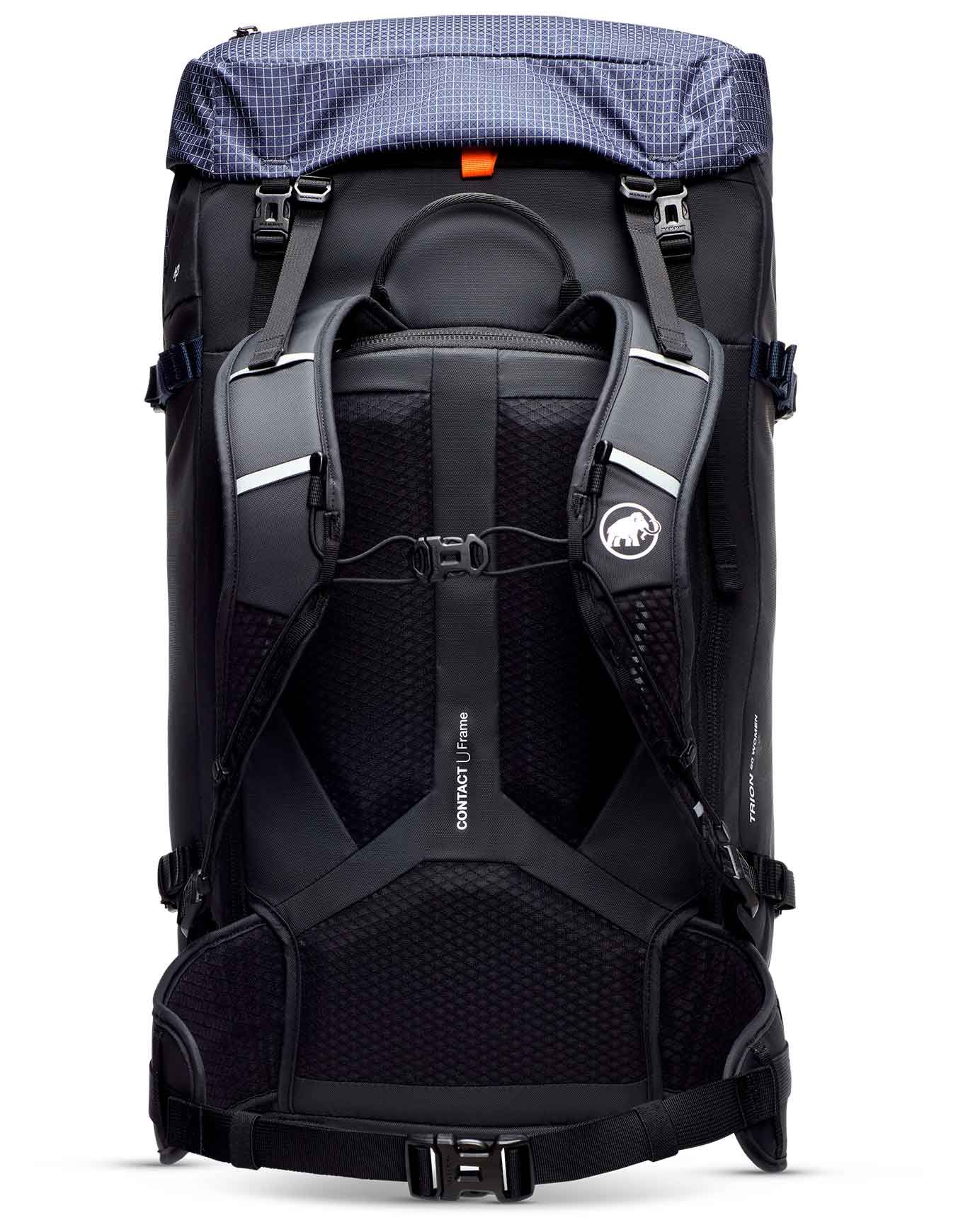 Sac à dos Mammut Trion 50 Women Marine/Black spécialement conçu pour l’alpinisme, la randonnée et le ski de rando grâce à son dos féminin rembourré, ses matériaux bluesign® recyclés et résistants à l’abrasion, son accès roll-top ou latéral, ses portes-piolets, porte-skis et poche avalanche.