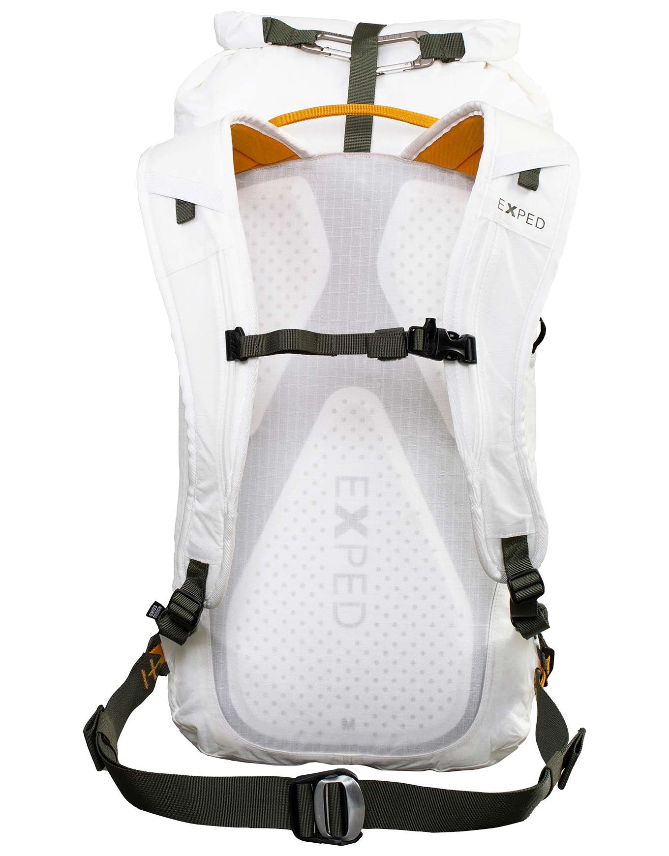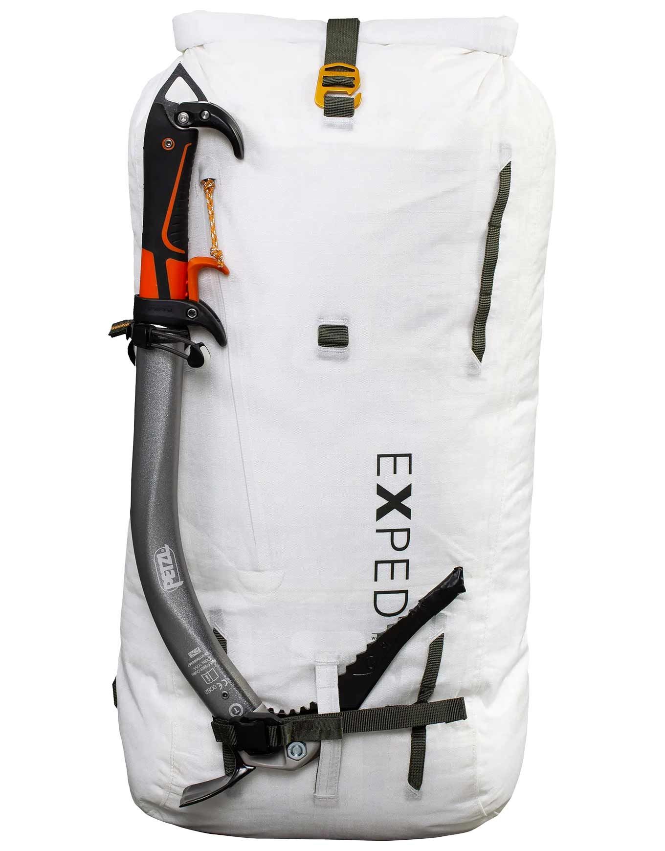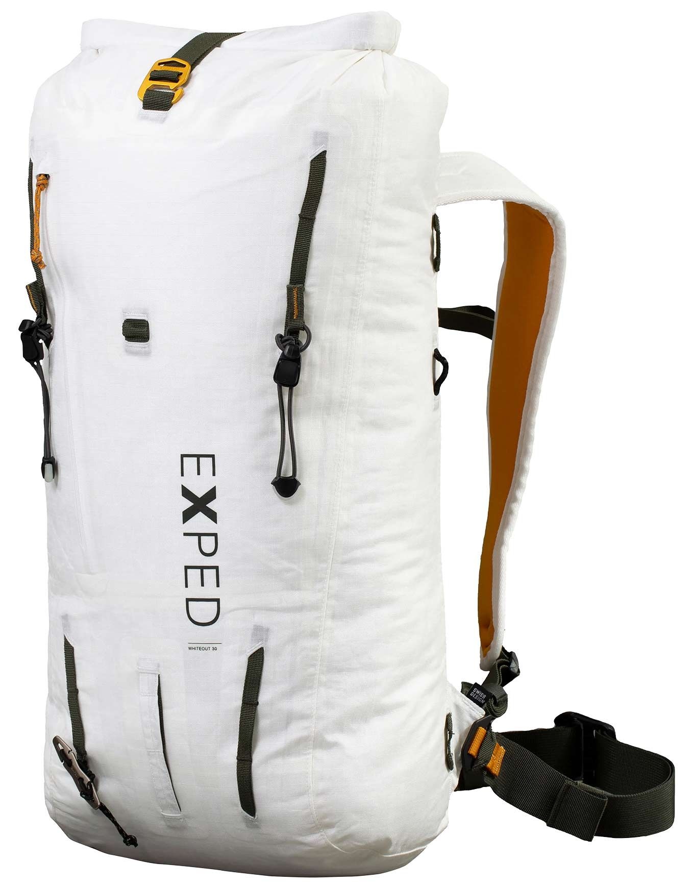 Sac à dos Exped Whiteout 30 White, 30 L en Ripstop UHMPE Bluesign®, imperméable 20 000 mm, fermeture enroulée, fixations piolets, ceinture amovible et plaque dorsale EVA siège bivouac.