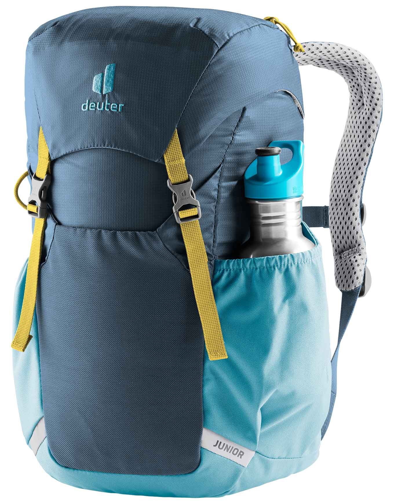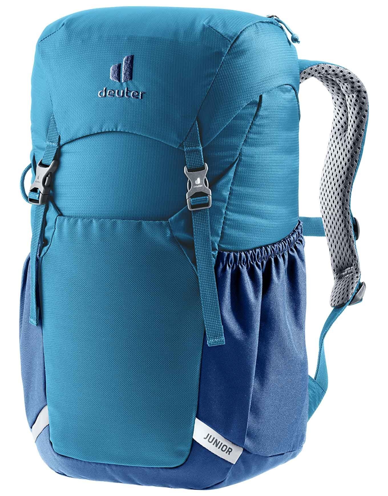 Sac à dos de randonnée Deuter Junior Wave Nightblue 18L, conçu pour les enfants dès 7 ans. Dos aéré AirStripes, sangle poitrine ajustable, poches latérales, poche frontale élastique et éléments réfléchissants.