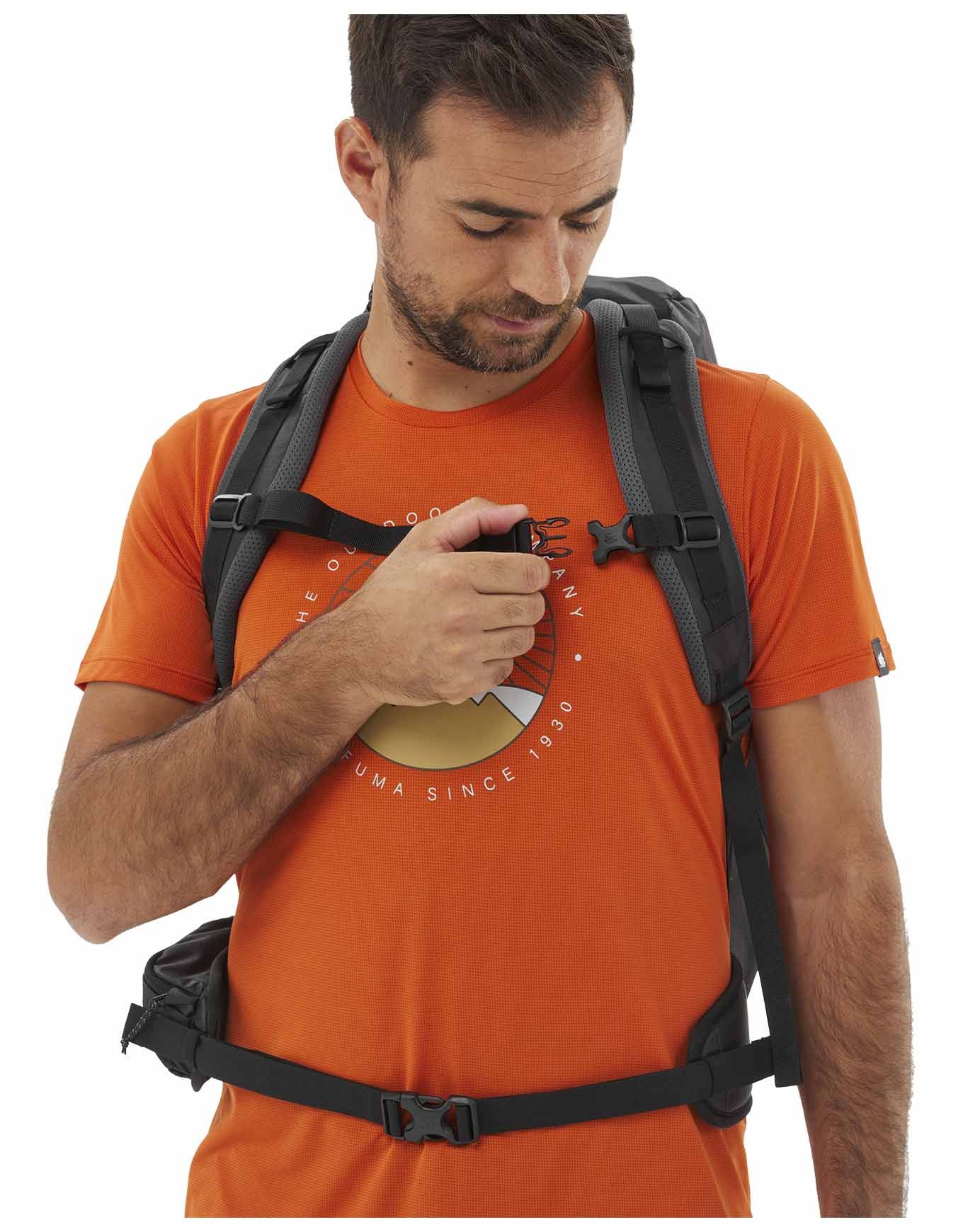 Un confort optimal est assuré par des bretelles ergonomiques, une sangle de poitrine ainsi qu’une ceinture abdominale, le tout réglable. Le volume du sac peut être ajusté avec précision grâce aux sangles de compression latérales et aux sangles porte-matériel situées en partie inférieure, tandis qu’une grande résistance à l’abrasion est procurée par le fond renforcé. La ventilation du dos aéré limite la surchauffe lors de la marche.