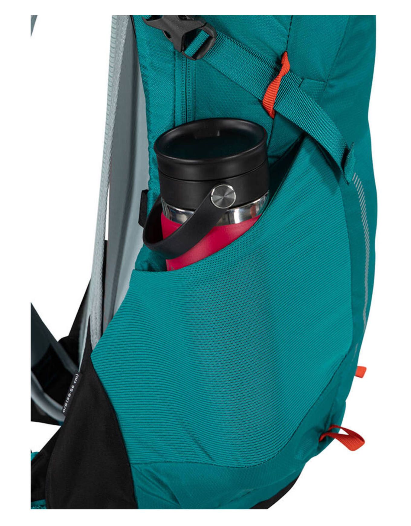 La housse imperméable intégrée, stockée dans la poche zippée située à la base du sac, se déploie facilement par temps de pluie. Quand le soleil fait son retour, vos couches protectrices trouvent leur place sans effort dans les poches latérales en mesh stretch. La sécurité du rangement est garantie par des compartiments zippés, une accroche porte-clés est intégrée dans la poche supérieure, et les boucles présentes sur les sangles de compression permettent de fixer les bâtons de randonnée.