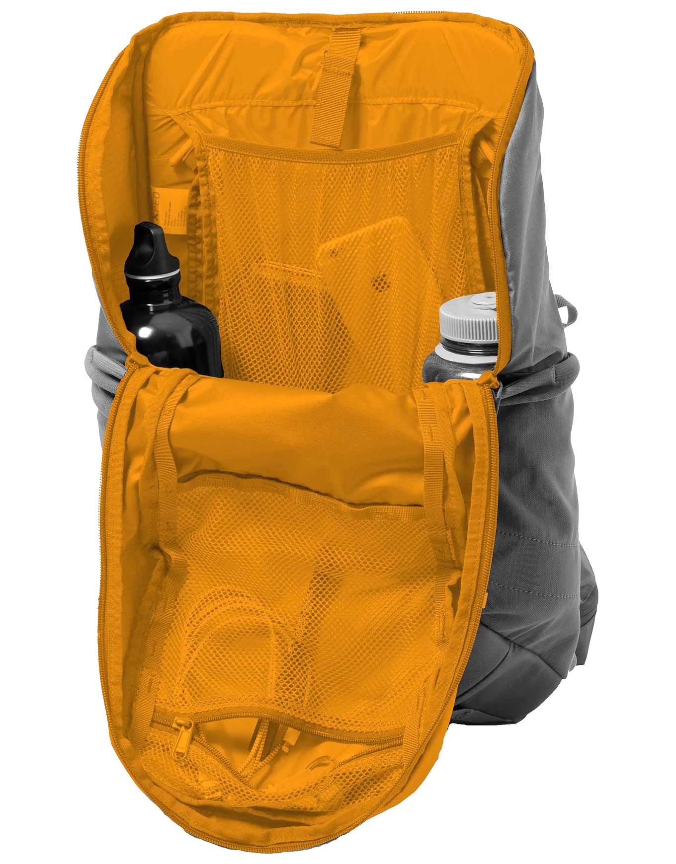 La compatibilité avec un système d’hydratation est assurée, de même que la présence de multiples compartiments intérieurs dédiés aux gourdes et aux accessoires délicats. Des poches en maille sont positionnées à l’extérieur, tandis qu’une poche zippée sur le dessus offre un accès rapide aux indispensables — crème solaire, téléphone ou autres objets de première nécessité.