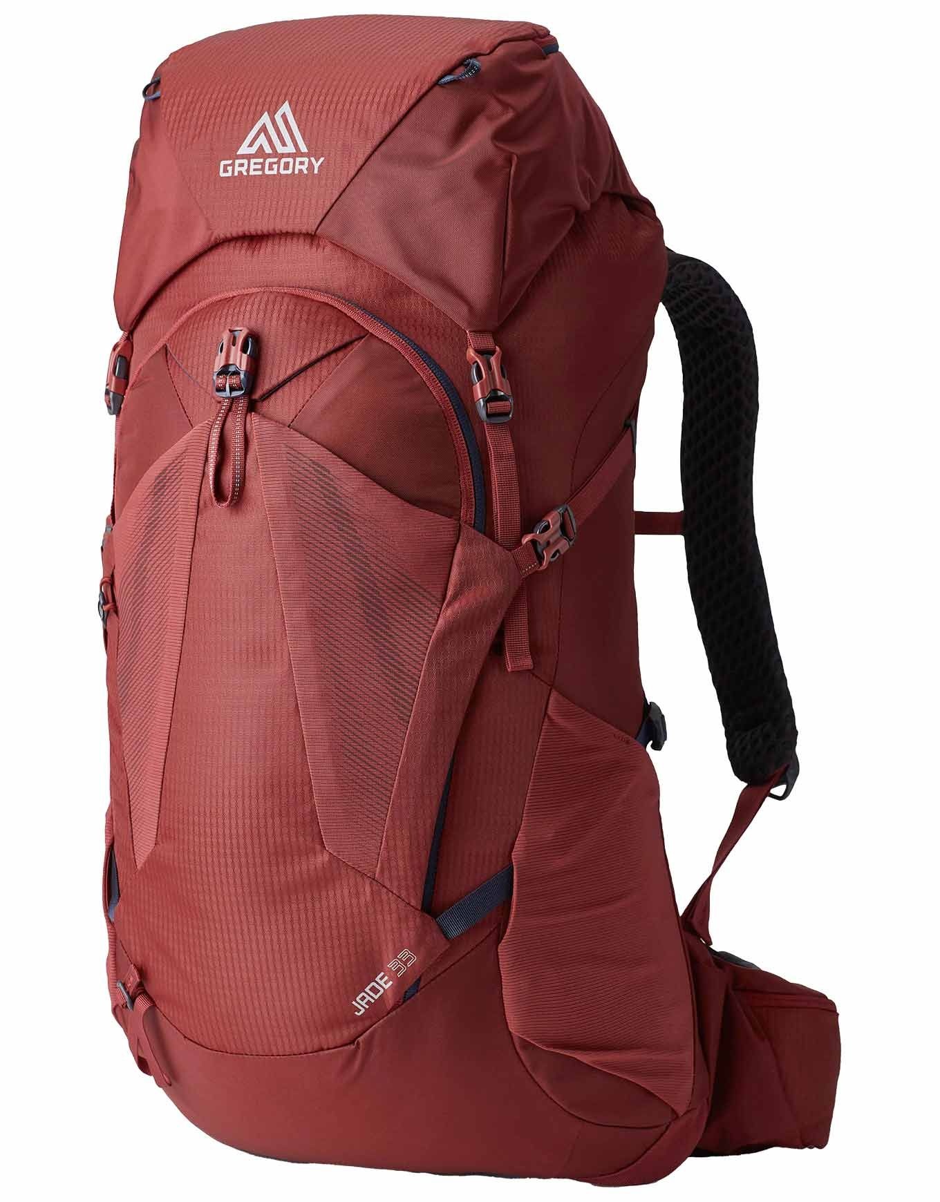Sac à dos de randonnée à la journée 33 L pour femme, Gregory Jade 33 RC Ruby Red combine confort dorsal ventilé VaporSpan, bretelles matelassées respirantes, fixation bâtons et housse de pluie.