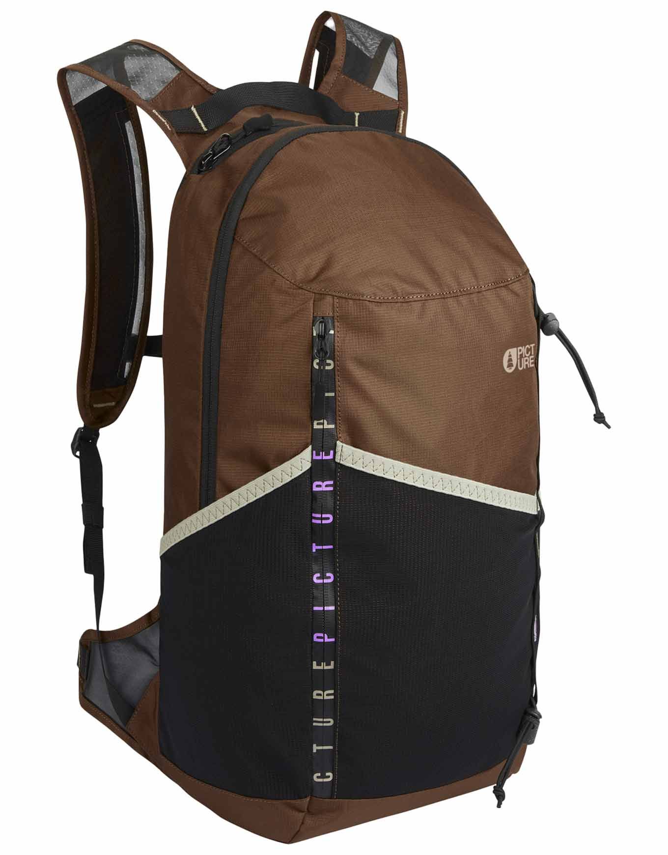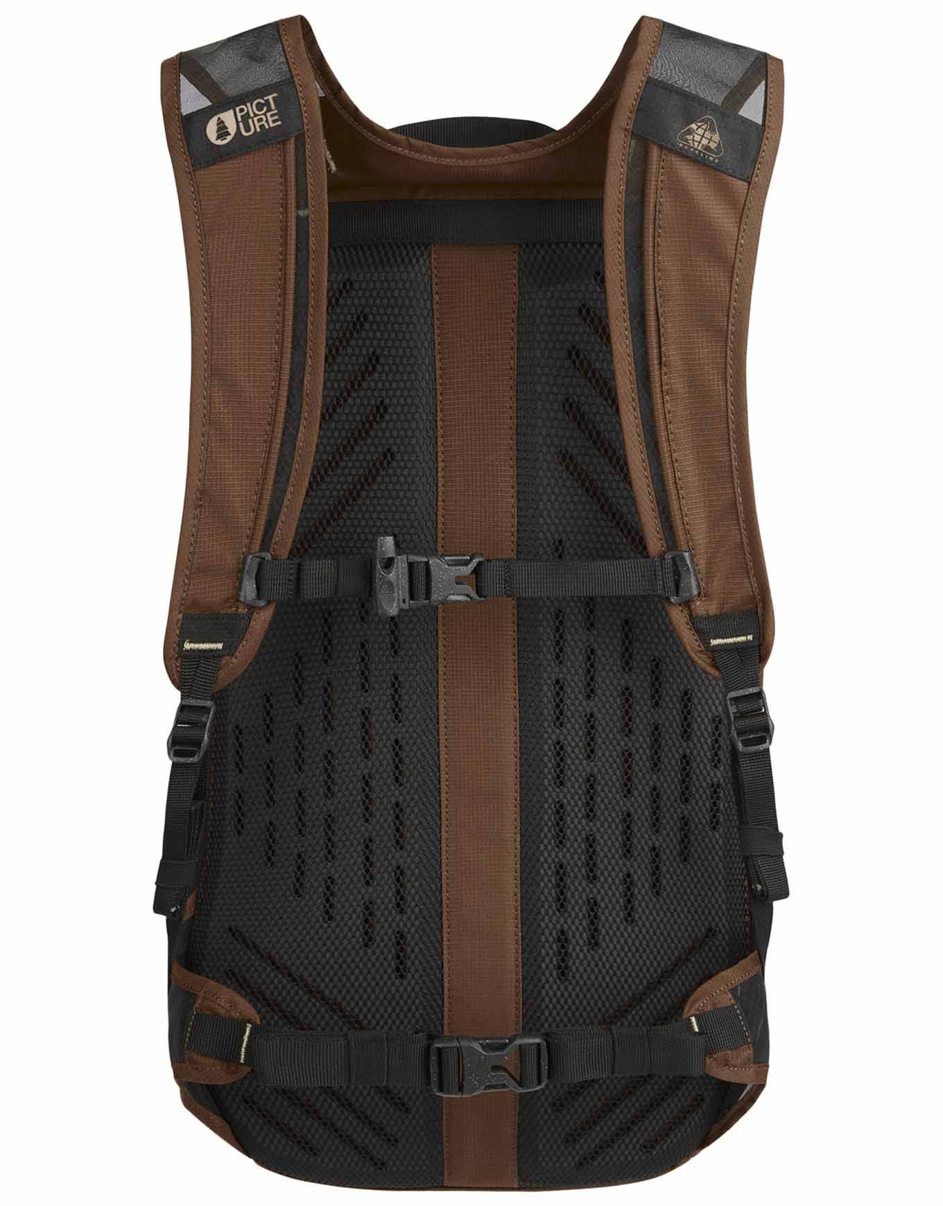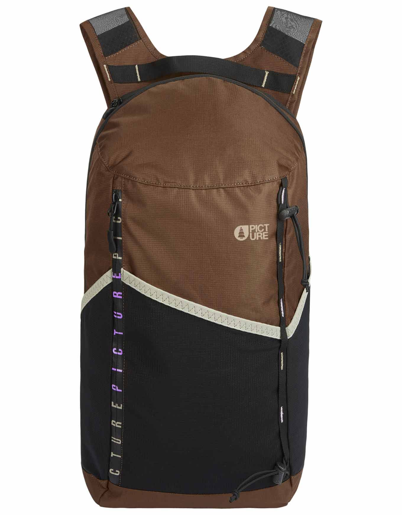 Le sac de voyage Off Trax 20 Partridge de Picture Organic Clothing, en polyester recyclé ripstop 150D, offre 20 L de capacité, traitement DWR sans PFC, bretelles mesh et dos EVA pour le confort en randonnée journée.