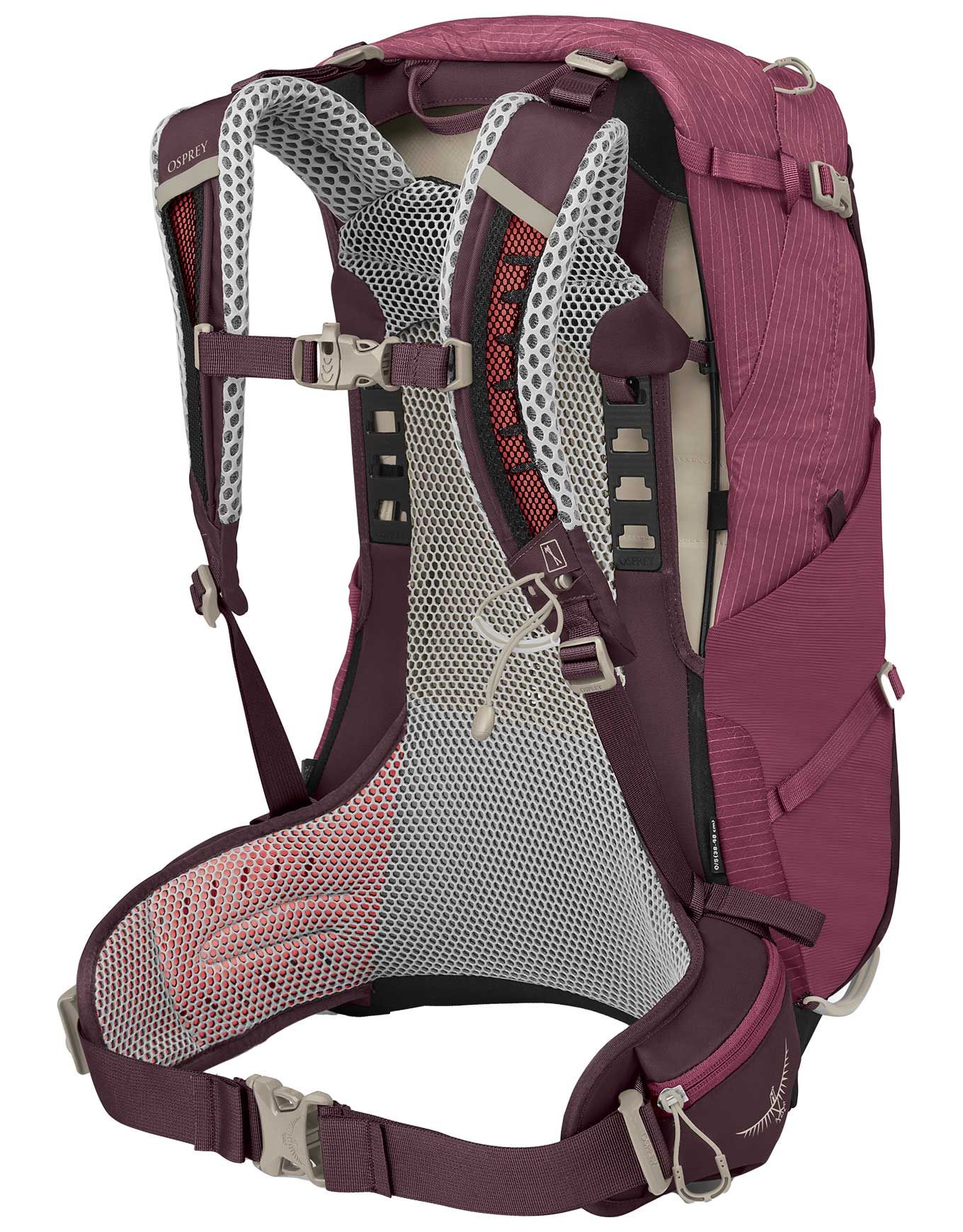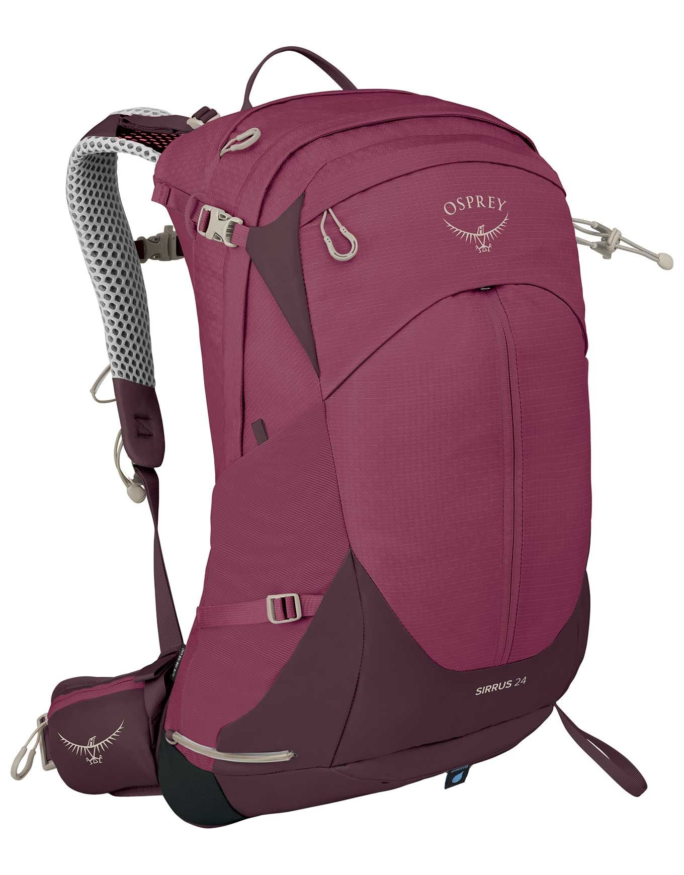 Sac à dos de randonnée Osprey Sirrus 24 pour femme, 24 L, système dorsal AirSpeed ajustable pour un confort maximal même lourd chargé et par temps chaud. Housse de pluie amovible, fixation Stow-on-the-Go pour bâtons, poche à eau 3 L, poche casque et ceinture avec poches zippées.