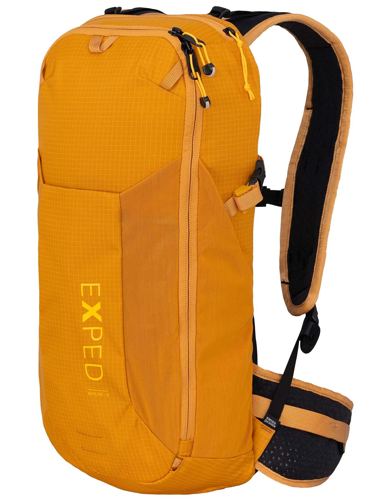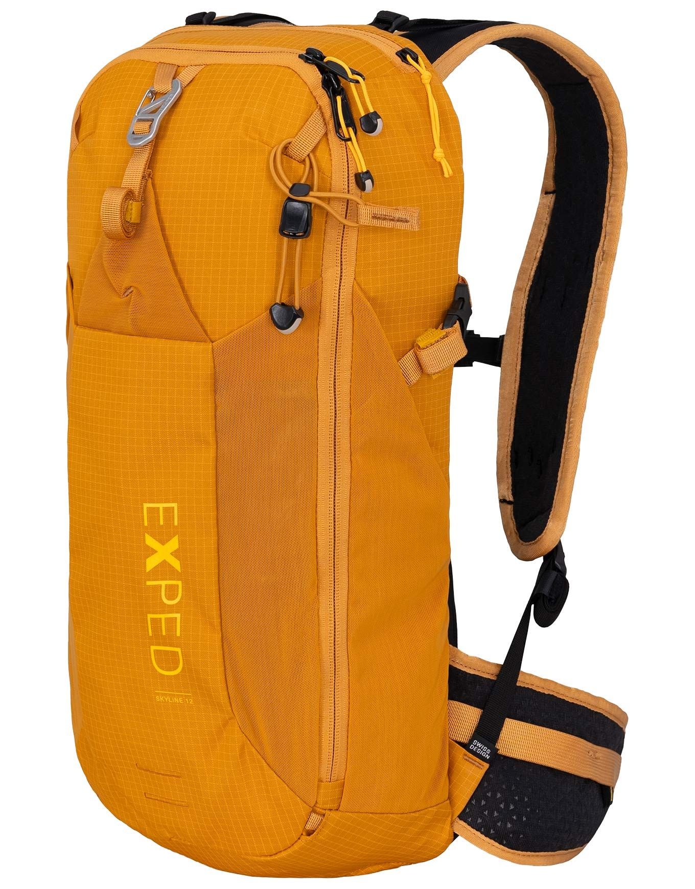 Sac de randonnée journée Exped Skyline 12 Gold, 12 L, dos aéré ergonomique, poche ceinture, housse pluie réfléchissante, compatible hydratation.