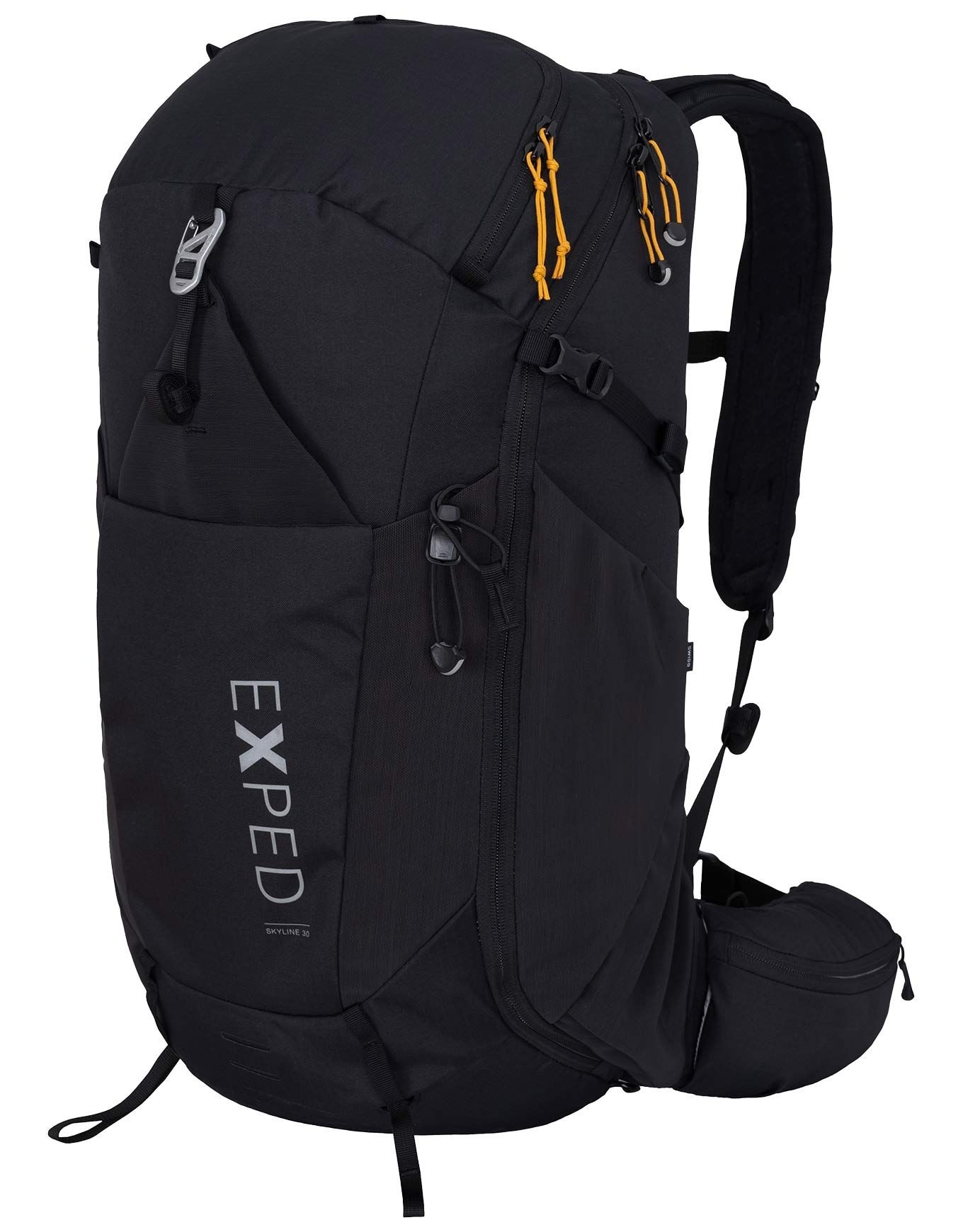 Sac de randonnée journée Exped Skyline 30 Black, 30 L, dos aéré ergonomique avec cadre acier léger, compartiments et poches filet organisées, compatibles hydratation et bâtons, housse pluie réfléchissante.