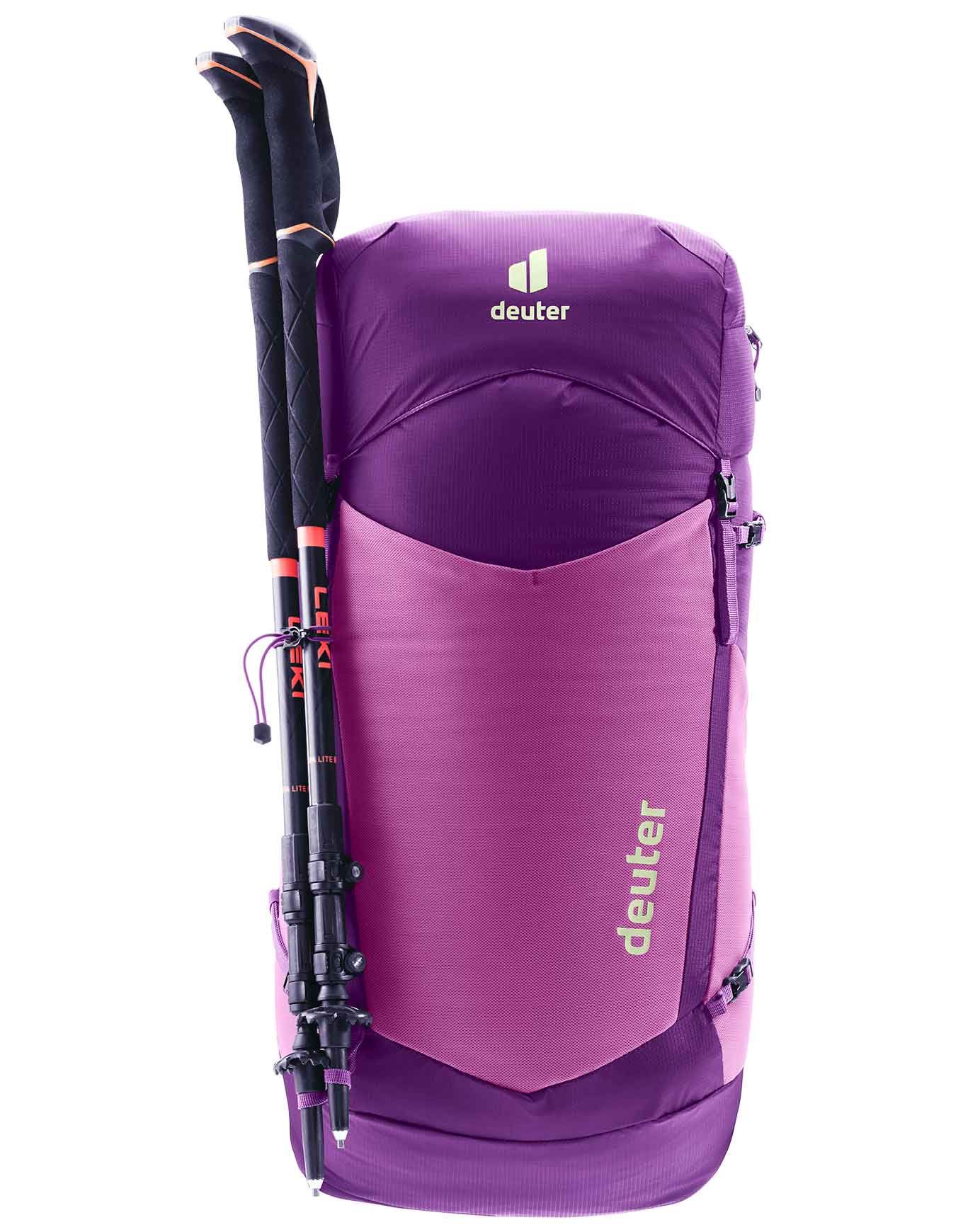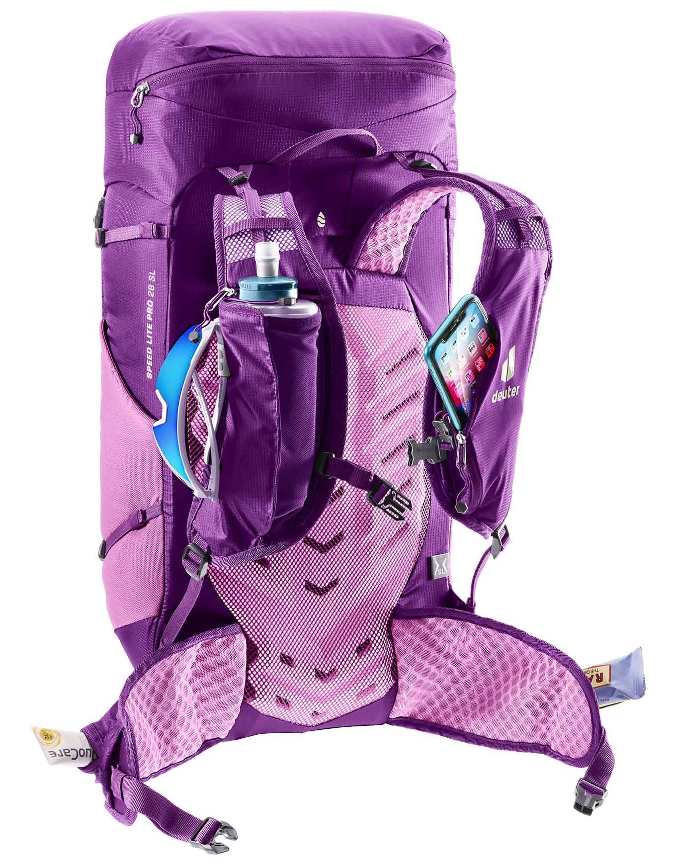Sac à dos Deuter Speed Lite Pro 28 SL ultraléger pour femme, dos LiteAir ventilé, bretelles et ceinture spécifiques SL, compartiment 28 L, poche hydration 3 L, fixation bâtons.