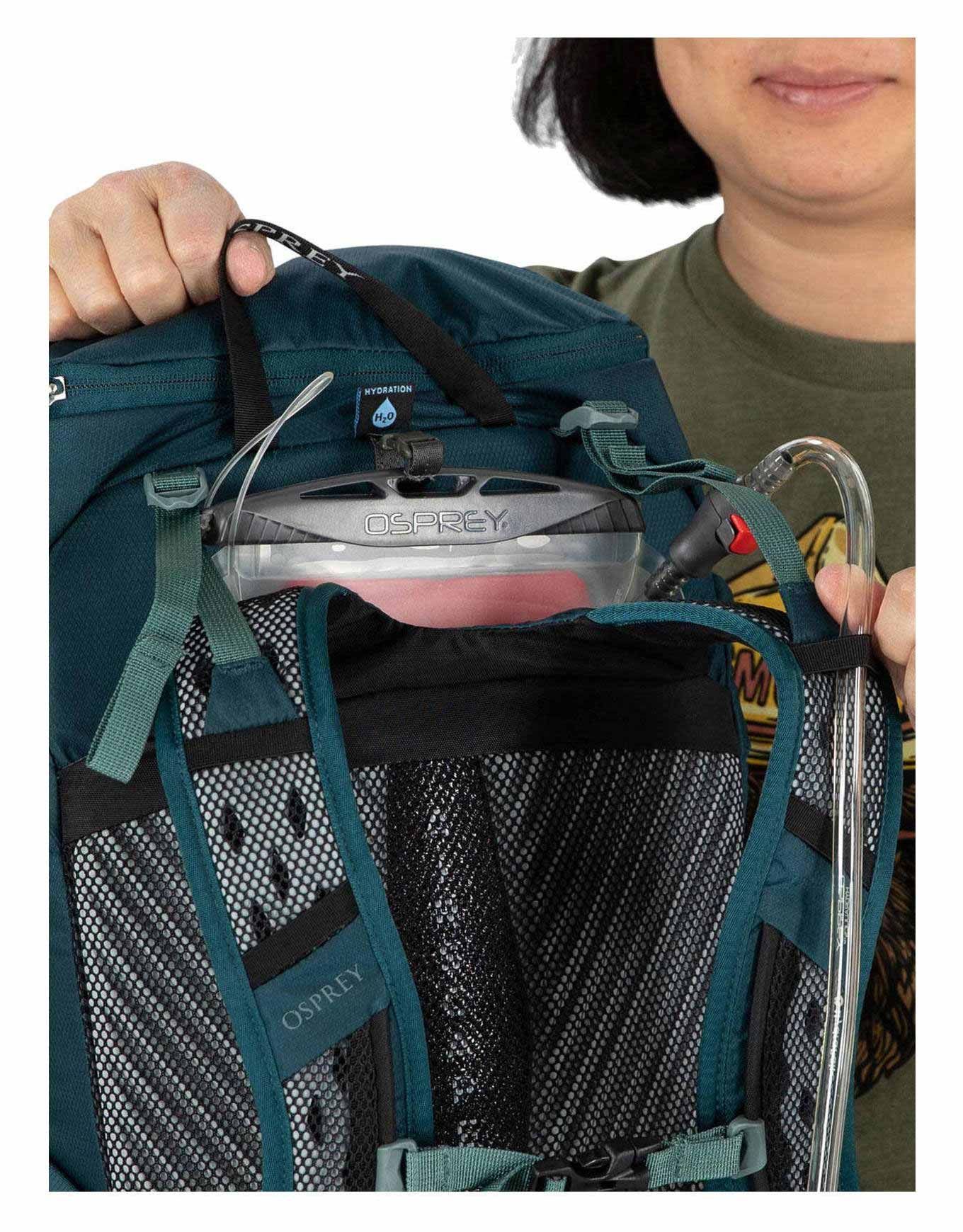 Dans un esprit minimaliste, la fabrication intègre 100% de matériaux recyclés ; les fonctions essentielles Osprey sont néanmoins présentes :