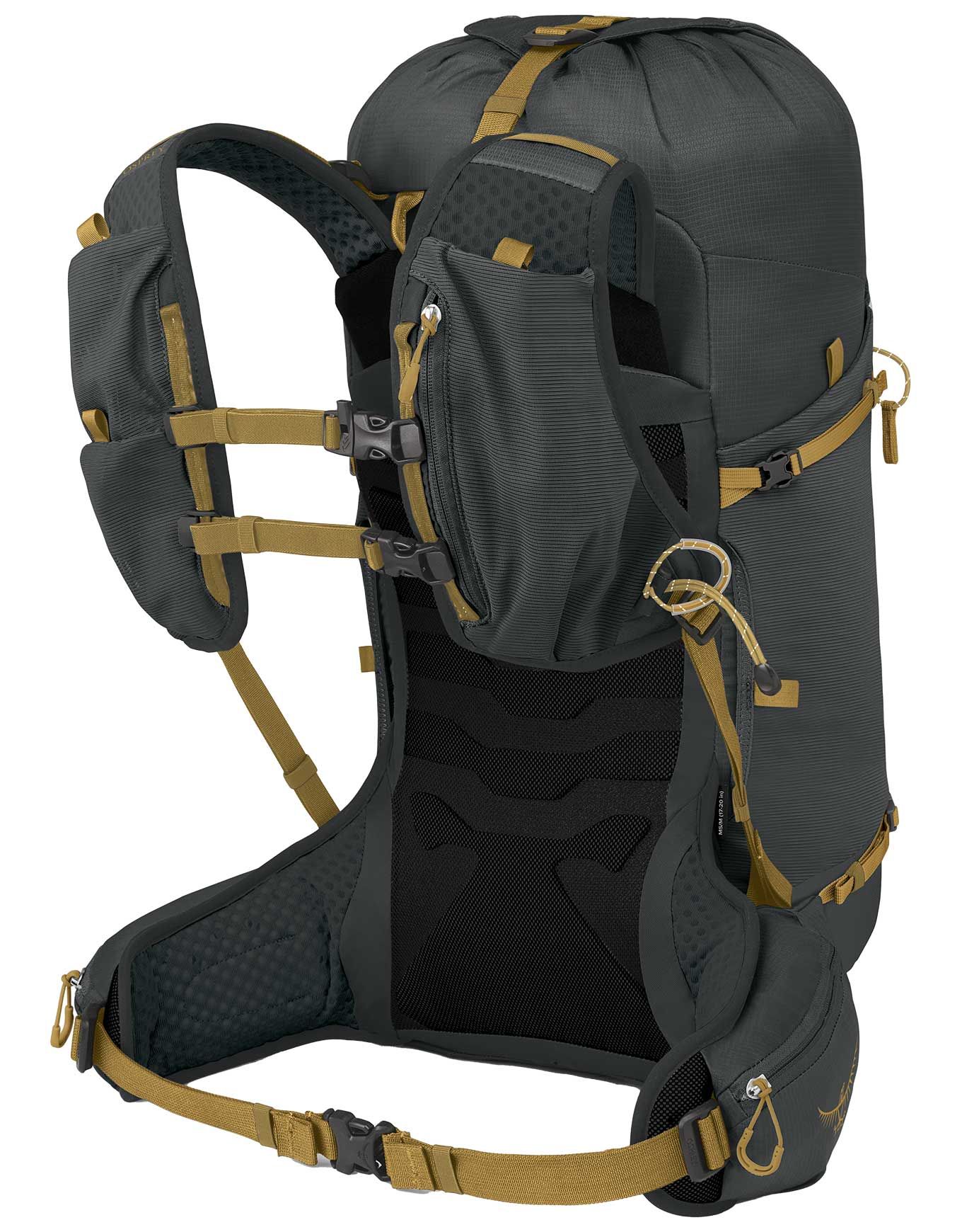 Sac à dos technique Osprey Talon Velocity 30 Dark Charcoal/Tumbleweed Yellow, 30 L, harnais BioStrech ventilé, dorsal AirScape respirant, double sangle poitrine, fixations bâtons, piolets et casque, poches ceinture et bretelles.