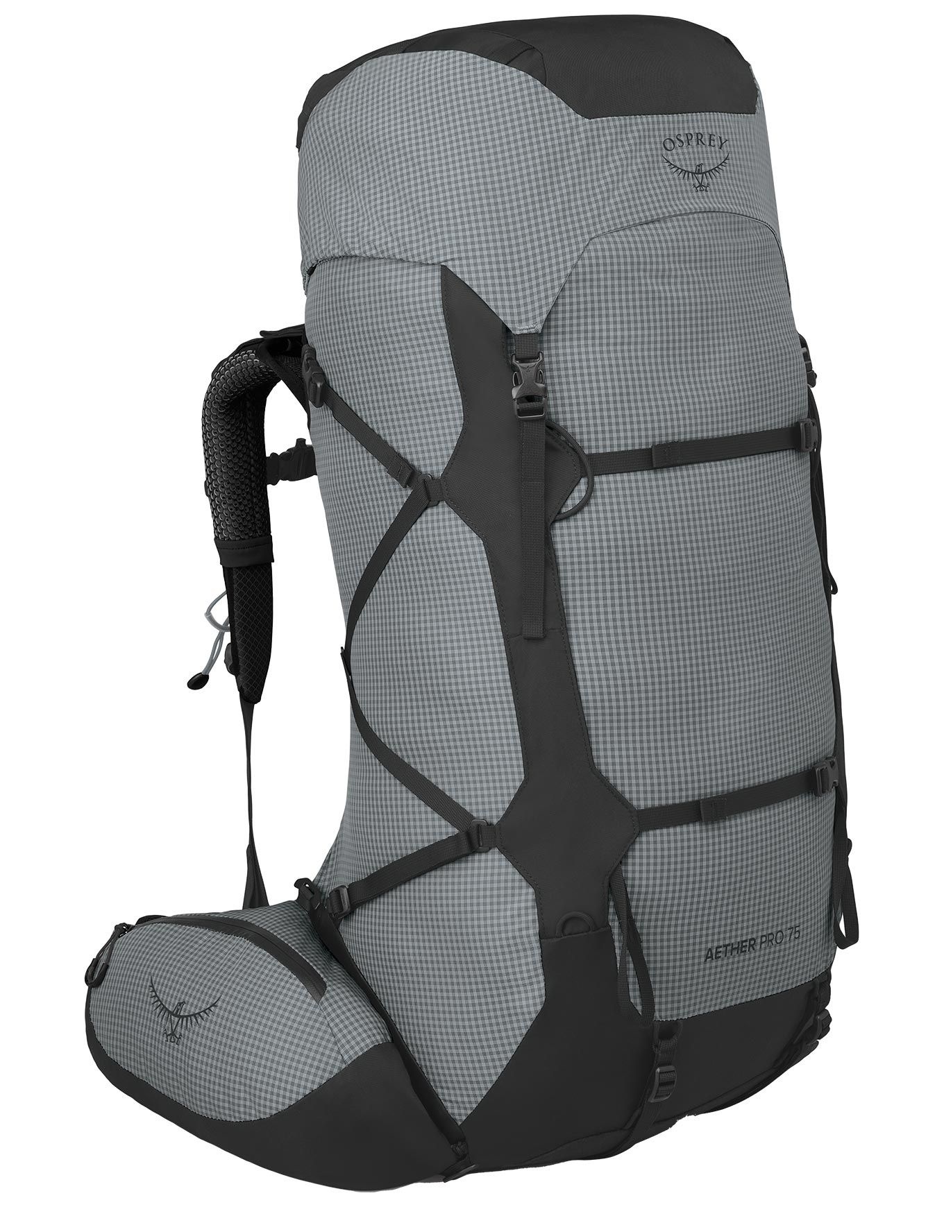 Sac à dos Osprey Aether Pro 75 Silver Lining, 75 L en tissu NanoFly, offre stabilité et confort grâce au dos AirScape, poches ceinture, compression latérale et compatibilité Daylite.